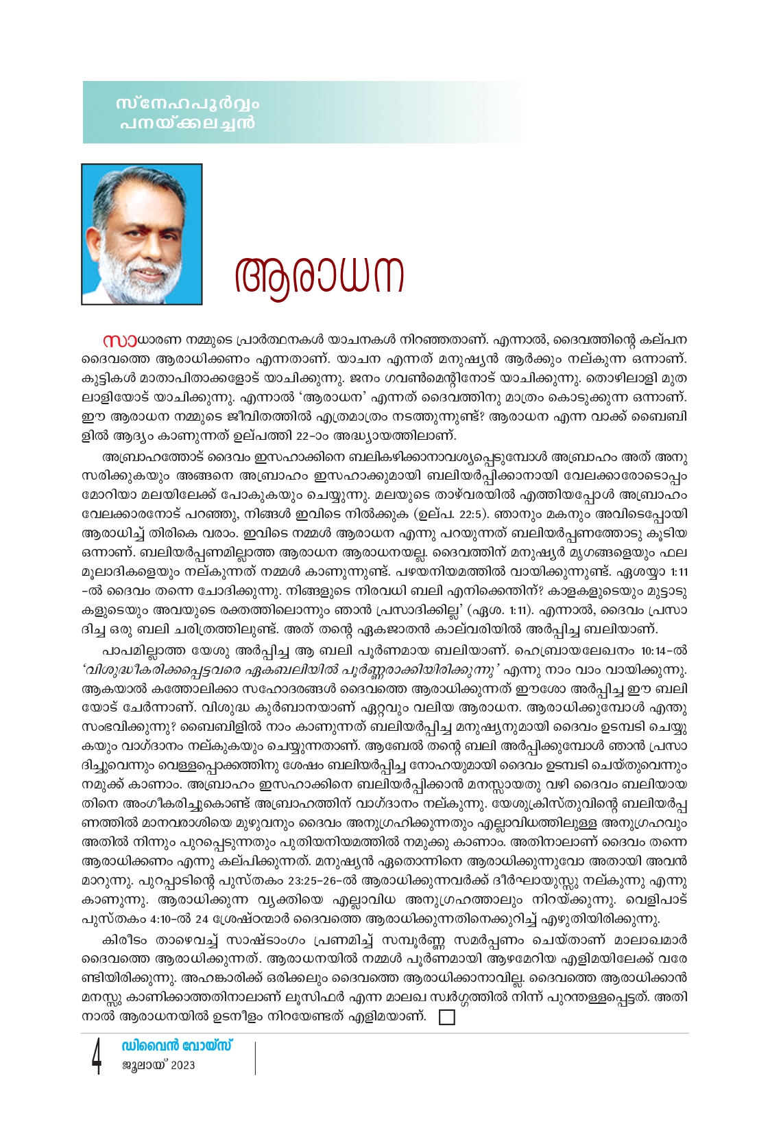 സാധാരണ നമ്മുടെ പ്രാർത്ഥനകൾ യാചനകൾ നിറഞ്ഞതാണ്. എന്നാൽ, ദൈവത്തിൻ്റെ കല്പന ദൈവത്തെ ആരാധിക്കണം എന്നതാണ്. യാചന എന്നത് മനുഷ്യൻ ആർക്കും നല്കുന്ന ഒന്നാണ്. കുട്ടികൾ മാതാപിതാക്കളോട് യാചിക്കുന്നു. ജനം ഗവൺമെൻ്റിനോട് യാചിക്കുന്നു. തൊഴിലാളി മുത ലാളിയോട് യാചിക്കുന്നു. എന്നാൽ 'ആരാധന' എന്നത് ദൈവത്തിനു മാത്രം കൊടുക്കുന്ന ഒന്നാണ്. ഈ ആരാധന നമ്മുടെ ജീവിതത്തിൽ എത്രമാത്രം നടത്തുന്നുണ്ട്? ആരാധന എന്ന വാക്ക് ബൈബി ളിൽ ആദ്യം കാണുന്നത് ഉല്പത്തി 22-ാം അദ്ധ്യായത്തിലാണ് അബ്രാഹത്തോട് ദൈവം ഇസഹാക്കിനെ ബലികഴിക്കാനാവശ്യപ്പെടുമ്പോൾ അബ്രാഹം അത് അനു സരിക്കുകയും അങ്ങനെ അബ്രാഹം ഇസഹാക്കുമായി ബലിയർപ്പിക്കാനായി വേലക്കാരോടൊപ്പം മോറിയാ മലയിലേക്ക് പോകുകയും ചെയ്യുന്നു. മലയുടെ താഴ്വരയിൽ എത്തിയപ്പോൾ അബ്രാഹം വേലക്കാരനോട് പറഞ്ഞു, നിങ്ങൾ ഇവിടെ നിൽക്കുക (ഉല്പ. 22:5). ഞാനും മകനും അവിടെപ്പോയി ആരാധിച്ച് തിരികെ വരാം. ഇവിടെ നമ്മൾ ആരാധന എന്നു പറയുന്നത് ബലിയർപ്പണത്തോടു കൂടിയ ഒന്നാണ്. ബലിയർപ്പണമില്ലാത്ത ആരാധന ആരാധനയല്ല. ദൈവത്തിന് മനുഷ്യർ മൃഗങ്ങളെയും ഫല മൂലാദികളെയും നല്കുന്നത് നമ്മൾ കാണുന്നുണ്ട്. പഴയനിയമത്തിൽ വായിക്കുന്നുണ്ട്. ഏശയ്യാ 1:11 -ൽ ദൈവം തന്നെ ചോദിക്കുന്നു. നിങ്ങളുടെ നിരവധി ബലി എനിക്കെന്തിന്? കാളകളുടെയും മുട്ടാടു കളുടെയും അവയുടെ രക്തത്തിലൊന്നും ഞാൻ പ്രസാദിക്കില്ല' (ഏശ. 1:11). എന്നാൽ, ദൈവം പ്രസാ ദിച്ച ഒരു ബലി ചരിത്രത്തിലുണ്ട്. അത് തൻ്റെ ഏകജാതൻ കാലവരിയിൽ അർപ്പിച്ച ബലിയാണ്.
