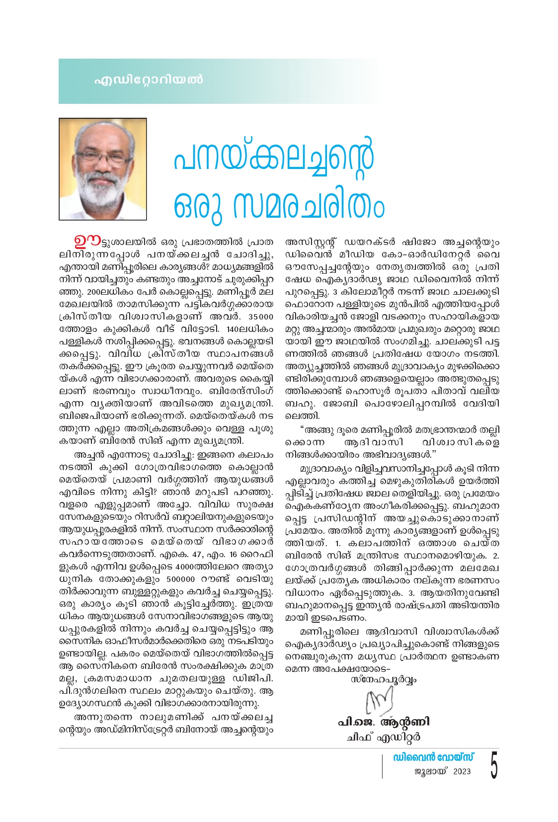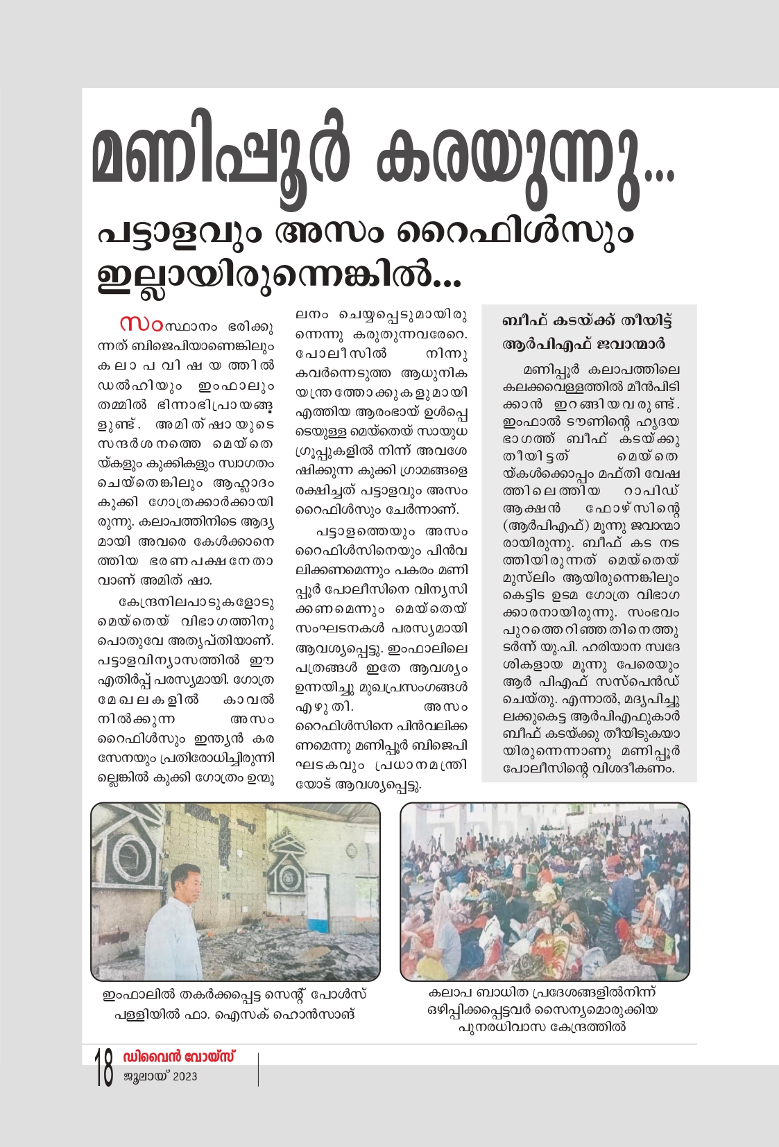 ഊട്ടുശാലയിൽ ഒരു പ്രഭാതത്തിൽ പ്രാത ലിനിരുന്നപ്പോൾ പനയ്ക്കലച്ചൻ ചോദിച്ചു. എന്തായി മണിപ്പൂരിലെ കാര്യങ്ങൾ? മാധ്യമങ്ങളിൽ നിന്ന് വായിച്ചതും കണ്ടതും അച്ചനോട് ചുരുക്കിപ്പറ ഞ്ഞു. 200ലധികം പേർ കൊല്ലപ്പെട്ടു. മണിപ്പൂർ മല മേഖലയിൽ താമസിക്കുന്ന പട്ടികവർഗ്ഗക്കാരായ ക്രിസ്തീയ വിശ്വാസികളാണ് അവർ. 35000 ത്തോളം കുക്കികൾ വീട് വിട്ടോടി. 140ലധികം പള്ളികൾ നശിപ്പിക്കപ്പെട്ടു. ഭവനങ്ങൾ കൊല്ലയടി ക്കപ്പെട്ടു. വിവിധ ക്രിസ്തീയ സ്ഥാപനങ്ങൾ തകർക്കപ്പെട്ടു. ഈ ക്രൂരത ചെയ്യുന്നവർ മെയ്തെ യ്കൾ എന്ന വിഭാഗക്കാരാണ്. അവരുടെ കൈയ്യി ലാണ് ഭരണവും സ്വാധീനവും. ബിരേന്ദ്സിംഗ് എന്ന വ്യക്തിയാണ് അവിടത്തെ മുഖ്യമന്ത്രി ബിജെപിയാണ് ഭരിക്കുന്നത്. മെയ്കൾ നട ത്തുന്ന എല്ലാ അതിക്രമങ്ങൾക്കും വെള്ള പൂശു കയാണ് ബിരേൻ സിങ് എന്ന മുഖ്യമന്ത്രി. അച്ചൻ എന്നോടു ചോദിച്ചു: ഇങ്ങനെ കലാപം നടത്തി കുക്കി ഗോത്രവിഭാഗത്തെ കൊല്ലാൻ മെയ്തെയ് പ്രമാണി വർഗ്ഗത്തിന് ആയുധങ്ങൾ എവിടെ നിന്നു കിട്ടി? ഞാൻ മറുപടി പറഞ്ഞു. വളരെ എളുപ്പമാണ് അച്ചോ. വിവിധ സുരക്ഷ സേനകളുടെയും റിസർവ് ബറ്റാലിയനുകളുടെയും ആയുധപ്പുരകളിൽ നിന്ന് സംസ്ഥാന സർക്കാരിൻ്റെ സഹായത്തോടെ മെയ്തെയ് വിഭാഗക്കാർ കവർന്നെടുത്തതാണ്. എകെ. 17. എം. 16 റൈഫി ളുകൾ എന്നിവ ഉൾപ്പെടെ 4000ത്തിലേറെ അത്യാ ധുനിക തോക്കുകളും 500000 റൗണ്ട് വെടിയു തിർക്കാവുന്ന ബുള്ളറ്റുകളും കവർച്ച ചെയ്യപ്പെട്ടു. ഒരു കാര്യം കൂടി ഞാൻ കൂട്ടിച്ചേർത്തു. ഇത്രയ ധികം ആയുധങ്ങൾ സേനാവിഭാഗങ്ങളുടെ ആയു ധപ്പുരകളിൽ നിന്നും കവർച്ച ചെയ്യപ്പെട്ടിട്ടും ആ സൈനിക ഓഫീസർമാർക്കെതിരെ ഒരു നടപടിയും ഉണ്ടായില്ല. പകരം മെയ്തെയ് വിഭാഗത്തിൽപ്പെട്ട ആ സൈനികനെ ബിരേൻ സംരക്ഷിക്കുക മാത്ര മല്ല, ക്രമസമാധാന ചുമതലയുള്ള ഡിജിപി. പി.ദുൻഗലിനെ സ്ഥലം മാറ്റുകയും ചെയ്തു. ആ ഉദ്യോഗസ്ഥൻ കുക്കി വിഭാഗക്കാരനായിരുന്നു.