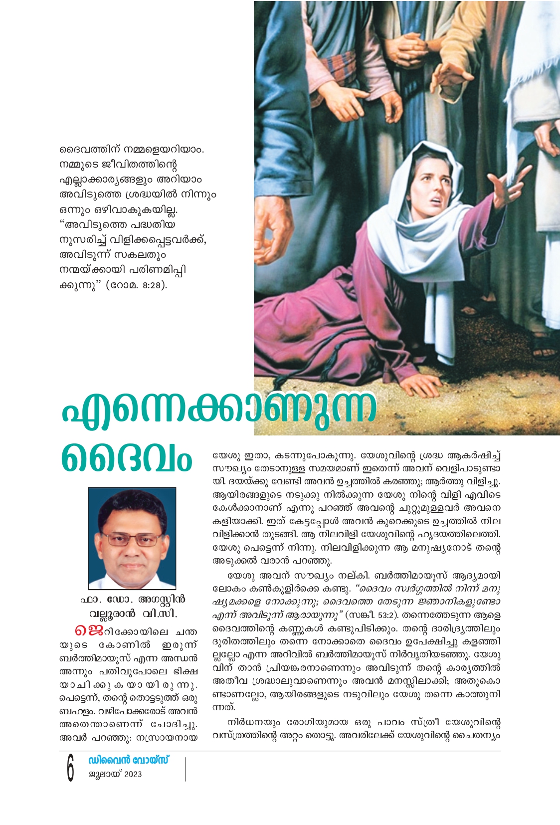 ജെറിക്കോയിലെ ചന്ത യുടെ കോണിൽ ഇരുന്ന് ബർത്തിമായൂസ് എന്ന അന്ധൻ അന്നും പതിവുപോലെ ഭിക്ഷ യാചിക്കുകയായിരുന്നു. പെട്ടെന്ന്, തന്റെ തൊട്ടടുത്ത് ഒരു ബഹളം. വഴിപോക്കരോട് അവൻ അതെന്താണെന്ന് ചോദിച്ചു. അവർ പറഞ്ഞു: നസ്രായനായയേശു ഇതാ, കടന്നുപോകുന്നു. യേശുവിന്റെ ശ്രദ്ധ ആകർഷിച്ച് സൗഖ്യം തേടാനുള്ള സമയമാണ് ഇതെന്ന് അവന് വെളിപാടുണ്ടാ യി. ദയയ്ക്കു വേണ്ടി അവൻ ഉച്ചത്തിൽ കരഞ്ഞു; ആർത്തു വിളിച്ചു. ആയിരങ്ങളുടെ നടുക്കു നിൽക്കുന്ന യേശു നിൻ്റെ വിളി എവിടെ കേൾക്കാനാണ് എന്നു പറഞ്ഞ് അവൻ്റെ ചുറ്റുമുള്ളവർ അവനെ കളിയാക്കി. ഇത് കേട്ടപ്പോൾ അവൻ കുറെക്കൂടെ ഉച്ചത്തിൽ നില വിളിക്കാൻ തുടങ്ങി. ആ നിലവിളി യേശുവിന്റെ ഹൃദയത്തിലെത്തി. യേശു പെട്ടെന്ന് നിന്നു. നിലവിളിക്കുന്ന ആ മനുഷ്യനോട് തന്റെ അടുക്കൽ വരാൻ പറഞ്ഞു.