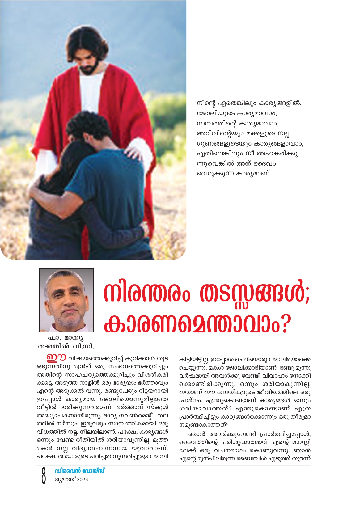 ഈ വിഷയത്തെക്കുറിച്ച് കുറിക്കാൻ തുട ങ്ങുന്നതിനു മുൻപ് ഒരു സംഭവത്തെക്കുറിച്ചും അതിന്റെ സാഹചര്യത്തെക്കുറിച്ചും വിശദീകരി ക്കട്ടെ അടുത്ത നാളിൽ ഒരു ഭാര്യയും ഭർത്താവും എന്റെ അടുക്കൽ വന്നു. രണ്ടുപേരും റിട്ടയറായി ഇപ്പോൾ കാര്യമായ ജോലിയൊന്നുമില്ലാതെ വീട്ടിൽ ഇരിക്കുന്നവരാണ്. ഭർത്താവ് സ്കൂൾ അദ്ധ്യാപകനായിരുന്നു. ഭാര്യ ഗവൺമെന്റ് തല ത്തിൽ നഴ്സും. ഇരുവരും സാമ്പത്തികമായി ഒരു വിധത്തിൽ നല്ല നിലയിലാണ്. പക്ഷേ, കാര്യങ്ങൾ ഒന്നും വേണ്ട രീതിയിൽ ശരിയാവുന്നില്ല. മൂത്ത മകൻ നല്ല വിദ്യാസമ്പന്നനായ യുവാവാണ്. പക്ഷേ, അയാളുടെ പഠിച്ചതിനുസരിച്ചുള്ള ജോലി കിട്ടിയിട്ടില്ല. ഇപ്പോൾ ചെറിയൊരു ജോലിയൊക്കെ ചെയ്യുന്നു. മകൾ ജോലിക്കാരിയാണ്. രണ്ടു മൂന്നു വർഷമായി അവൾക്കു വേണ്ടി വിവാഹം നോക്കി ക്കൊണ്ടിരിക്കുന്നു. ഒന്നും ശരിയാകുന്നില്ല. ഇതാണ് ഈ ദമ്പതികളുടെ ജീവിതത്തിലെ ഒരു പ്രശ്നം. എന്തുകൊണ്ടാണ് കാര്യങ്ങൾ ഒന്നും ശരിയാവാത്തത്? എന്തുകൊണ്ടാണ് എത പ്രാർത്ഥിച്ചിട്ടും കാര്യങ്ങൾക്കൊന്നും ഒരു തീരുമാനമുണ്ടാകാത്തത്