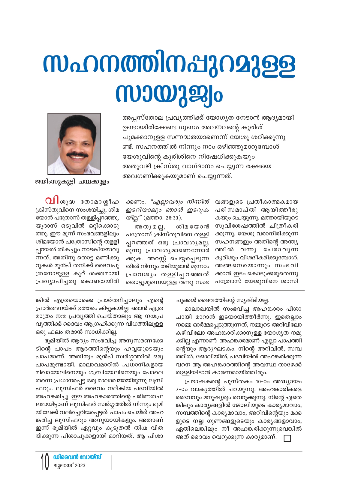 വിശുദ്ധ തോമാശ്ലീഹ ക്രിസ്തുവിനെ സംശയിച്ചു. ശിമ യോൻ പത്രോസ് തള്ളിപ്പറഞ്ഞു, യൂദാസ് ഒടുവിൽ ഒറ്റിക്കൊടു ത്തു. ഈ മൂന്ന് സംഭവങ്ങളിലും ശിമയോൻ പത്രോസിൻ്റെ തളളി പ്പറയൽ തികച്ചും നാടകീയമാവു ന്നത്. അതിനു തൊട്ട മണിക്കു റുകൾ മുൻപ് തനിക്ക് ദൈവപു ത്രനോടുള്ള കൂറ് ശക്തമായി പ്രഖ്യാപിച്ചതു കൊണ്ടായിരി ക്കണം. "എല്ലാവരും നിന്നിൽ ഇടറിയാലും ഞാൻ ഇടറുക യില്ല" (മത്താ. 26:33). അതുമല്ല. ശിമയോൻ പത്രോസ് ക്രിസ്തുവിനെ തള്ളി പ്പറഞ്ഞത് ഒരു പ്രാവശ്യമല്ല മൂന്നു പ്രാവശ്യമാണെന്നോർ ക്കുക. അറസ്റ്റ് ചെയ്യപ്പെടുന്ന തിൽ നിന്നും തടിയൂരാൻ മൂന്നാം പ്രാവശ്യം തള്ളിപ്പറഞ്ഞത്തൊട്ടുമുമ്പെയുള്ള രണ്ടു സംഭവങ്ങളുടെ പ്രതീകാത്മകമായ പരിസമാപ്തി ആയിത്തീരു കയും ചെയ്യുന്നു. മത്തായിയുടെ സുവിശേഷത്തിൽ ചിത്രീകരി ക്കുന്നു. യേശു വരാനിരിക്കുന്ന , സഹനങ്ങളും അതിന്റെ അന്ത്യ ത്തിൽ വന്നു ചേരാവുന്ന കുരിശും വിശദീകരിക്കുമ്പോൾ, അങ്ങനെയൊന്നും സംഭവി ക്കാൻ ഇടം കൊടുക്കരുതെന്നു പത്രോസ് യേശുവിനെ ശാസിക്കുന്നുഈ സംഭവങ്ങളിൽ നിന്നും നാം ഗണിക്കേണ്ടത്, ഓരോ പ്രാവശ്യവും സഹനത്തെ നമ്മൾ തള്ളിക്കളയുമ്പോൾ നമ്മൾ യേശുവിനെയാണ്ക്കളയുന്നത് എന്നതാണ്.