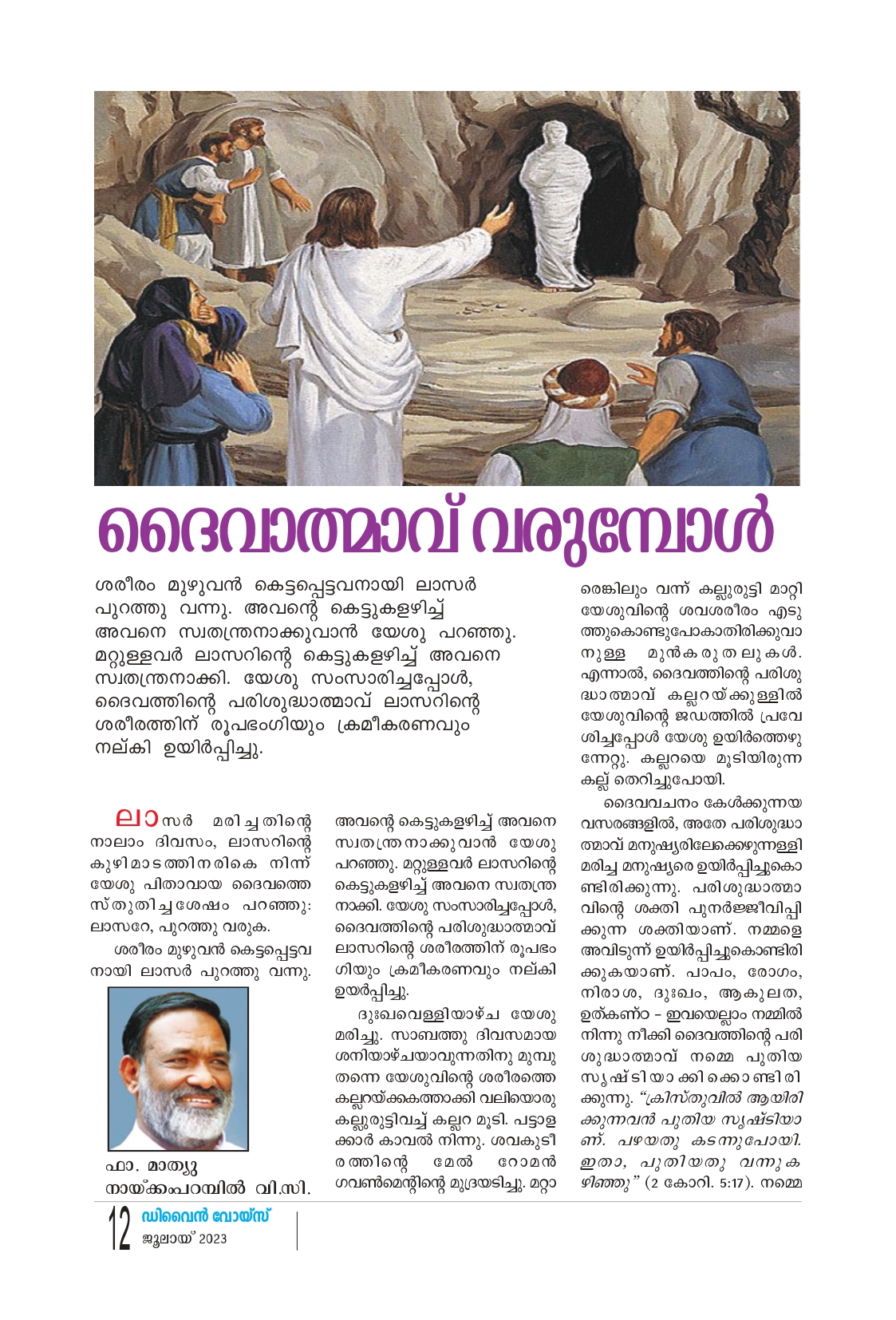 ലാസർ മരിച്ചതിൻ്റെ നാലാം ദിവസം, ലാസറിൻ്റെ കുഴിമാടത്തിനരികെ നിന്ന് യേശു പിതാവായ ദൈവത്തെ സ്തുതിച്ചശേഷം പറഞ്ഞു: ലാസറേ, പുറത്തു വരുക. ശരീരം മുഴുവൻ കെട്ടപ്പെട്ടവ നായി ലാസർ പുറത്തു വന്നു. അവൻ്റെ കെട്ടുകളഴിച്ച് അവനെ സ്വതന്ത്രനാക്കുവാൻ യേശു പറഞ്ഞു. മറ്റുള്ളവർ ലാസറിൻ്റെ കെട്ടുകളഴിച്ച് അവനെ സ്വതന്ത്ര നാക്കി. യേശു സംസാരിച്ചപ്പോൾ. ദൈവത്തിന്റെ പരിശുദ്ധാത്മാവ് ലാസറിൻ്റെ ശരീരത്തിന് രൂപഭം ഗിയും ക്രമീകരണവും നല്കി ഉയർപ്പിച്ചു. ദുഃഖവെള്ളിയാഴ്ച്ച യേശു മരിച്ചു. സാബത്തു ദിവസമായ ശനിയാഴ്ചയാവുന്നതിനു മുമ്പു തന്നെ യേശുവിന്റെ ശരീരത്തെ കല്ലറയ്ക്കകത്താക്കി വലിയൊരു കല്ലുരുട്ടിവച്ച് കല്ലറ മുടി പട്ടാള ക്കാർ കാവൽ നിന്നു.