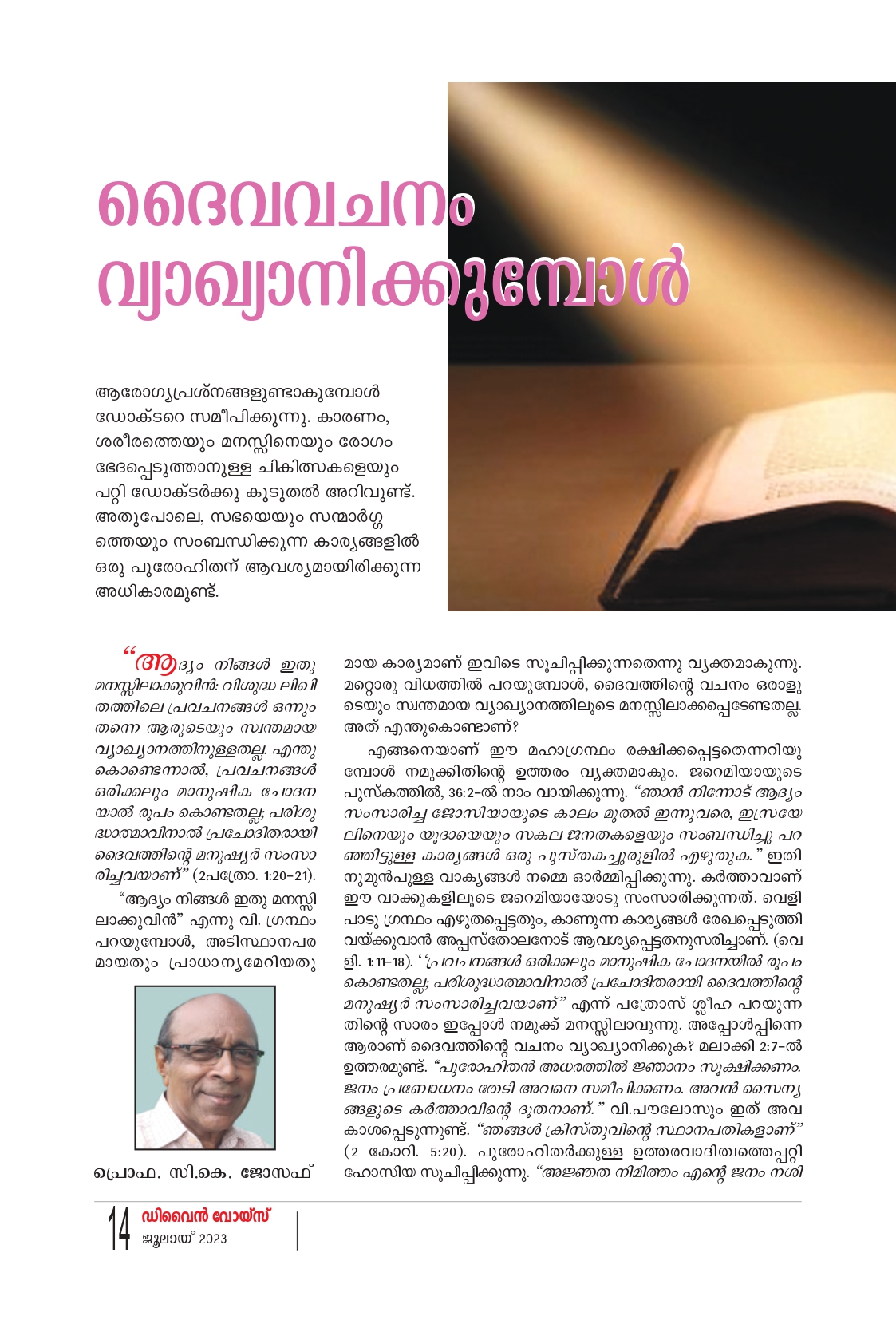 “ആദ്യം നിങ്ങൾ ഇതു മനസ്സിലാക്കുവിൻ: വിശുദ്ധ ലിഖി തത്തിലെ പ്രവചനങ്ങൾ ഒന്നും തന്നെ ആരുടെയും സ്വന്തമായ വ്യാഖ്യാനത്തിനുള്ളതല്ല. എന്തു കൊണ്ടെന്നാൽ, പ്രവചനങ്ങൾ ഒരിക്കലും മാനുഷിക ചോദന യാൽ രൂപം കൊണ്ടതല്ല; പരിശു ദ്ധാത്മാവിനാൽ പ്രചോദിതരായി ദൈവത്തിന്റെ മനുഷ്യർ സംസാ രിച്ചവയാണ്" (2പത്രോ. 1:20-21). “ആദ്യം നിങ്ങൾ ഇതു മനസ്സി ലാക്കുവിൻ" എന്നു വി. ഗ്രന്ഥം പറയുമ്പോൾ, അടിസ്ഥാനപര മായതും പ്രാധാന്യമേറിയതു മായ കാര്യമാണ് ഇവിടെ സൂചിപ്പിക്കുന്നതെന്നു വ്യക്തമാകുന്നു. മറ്റൊരു വിധത്തിൽ പറയുമ്പോൾ ദൈവത്തിൻ്റെ വചനം ഒരാളു ടെയും സ്വന്തമായ വ്യാഖ്യാനത്തിലൂടെ മനസ്സിലാക്കപ്പെടേണ്ടതല്ല. അത് എന്തുകൊണ്ടാണ്? എങ്ങനെയാണ് ഈ മഹാഗ്രന്ഥം രക്ഷിക്കപ്പെട്ടതെന്നറിയു മ്പോൾ നമുക്കിതിൻ്റെ ഉത്തരം വ്യക്തമാകും. ജറെമിയായുടെ പുസ്കത്തിൽ, 36:2-ൽ നാം വായിക്കുന്നു. "ഞാൻ നിന്നോട് ആദ്യം സംസാരിച്ച ജോസിയായുടെ കാലം മുതൽ ഇന്നുവരെ, ഇസ്രയേ ലിനെയും യൂദായെയും സകല ജനതകളെയും സംബന്ധിച്ചു പറ ഞ്ഞിട്ടുള്ള കാര്യങ്ങൾ ഒരു പുസ്തകച്ചുരുളിൽ എഴുതുക." ഇതി നുമുൻപുള്ള വാക്യങ്ങൾ നമ്മെ ഓർമ്മിപ്പിക്കുന്നു. കർത്താവാണ് ഈ വാക്കുകളിലൂടെ ജറെമിയായോടു സംസാരിക്കുന്നത്. വെളി പാടു ഗ്രന്ഥം എഴുതപ്പെട്ടതും, കാണുന്ന കാര്യങ്ങൾ രേഖപ്പെടുത്തി വയ്ക്കുവാൻ അപ്പസ്തോലനോട് ആവശ്യപ്പെട്ടതനുസരിച്ചാണ്. (വെ ളി. 1:11-18). "പ്രവചനങ്ങൾ ഒരിക്കലും മാനുഷിക ചോദനയിൽ രൂപം കൊണ്ടതല്ല; പരിശുദ്ധാത്മാവിനാൽ പ്രചോദിതരായി ദൈവത്തിന്റെ മനുഷ്യർ സംസാരിച്ചവയാണ്" എന്ന് പത്രോസ് ശ്ലീഹ പറയുന്ന തിന്റെ സാരം ഇപ്പോൾ നമുക്ക് മനസ്സിലാവുന്നു. അപ്പോൾപ്പിന്നെ ആരാണ് ദൈവത്തിൻ്റെ വചനം വ്യാഖ്യാനിക്കുക? മലാക്കി 2:7-ൽ ഉത്തരമുണ്ട്. 'പുരോഹിതൻ അധരത്തിൽ ജ്ഞാനം സൂക്ഷിക്കണം. ജനം പ്രബോധനം തേടി അവനെ സമീപിക്കണം അവൻ സൈന്യ ങ്ങളുടെ കർത്താവിൻ്റെ ദൂതനാണ്." വി.പൗലോസും ഇത് അവ കാശപ്പെടുന്നുണ്ട്.