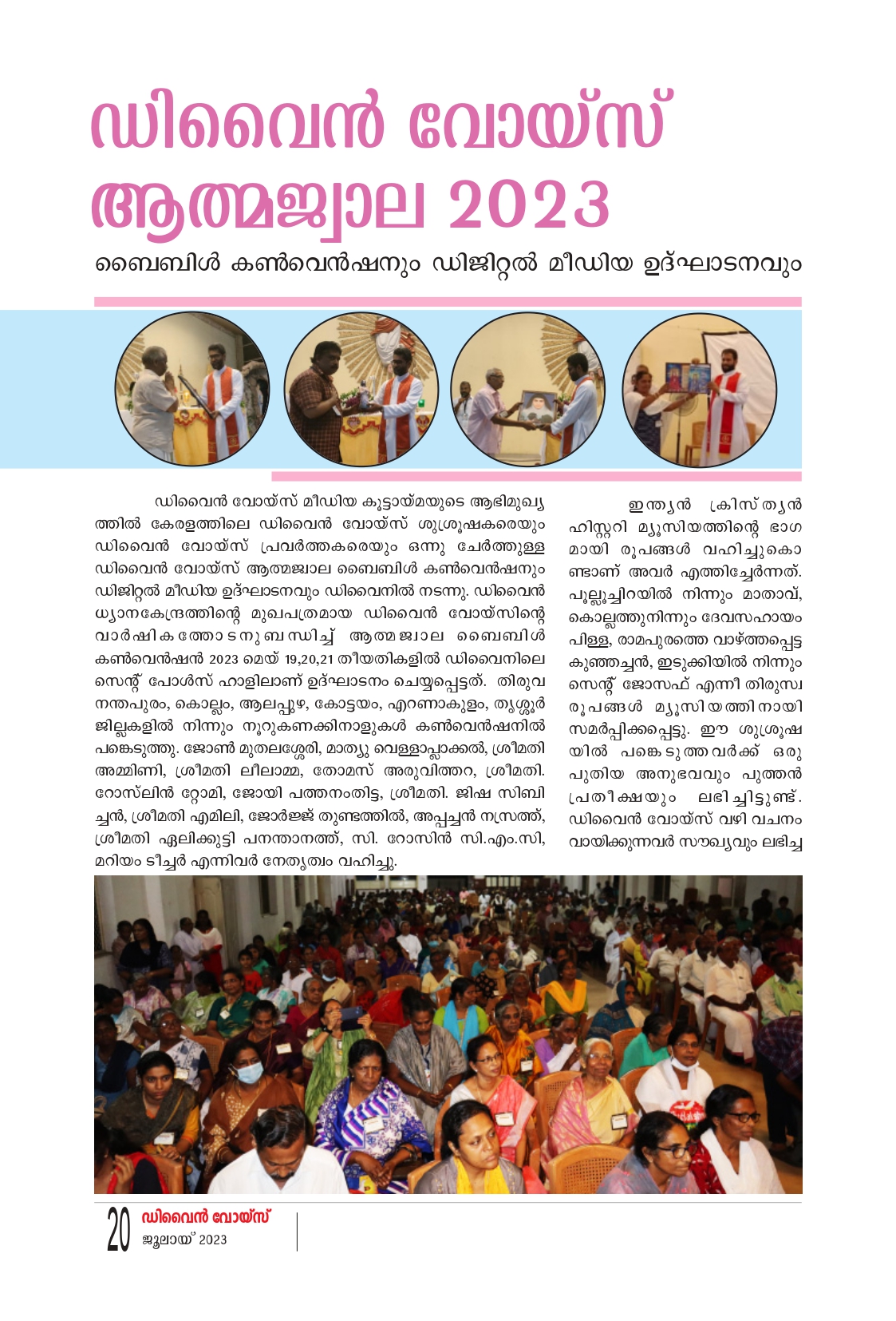 ഡിവൈൻ വോയ്സ് മീഡിയ കൂട്ടായ്മയുടെ ആഭിമുഖ്യ ത്തിൽ കേരളത്തിലെ ഡിവൈൻ വോയ്സ് ശുശ്രൂഷകരെയും ഡിവൈൻ വോയ്സ് പ്രവർത്തകരെയും ഒന്നു ചേർത്തുള്ള ഡിവൈൻ വോയ്സ് ആത്മജ്വാല ബൈബിൾ കൺവെൻഷനും ഡിജിറ്റൽ മീഡിയ ഉദ്ഘാടനവും ഡിവൈനിൽ നടന്നു. ഡിവൈൻ ധ്യാനകേന്ദ്രത്തിന്റെ മുഖപത്രമായ ഡിവൈൻ വോയ്സിൻ്റെ വാർഷികത്തോടനുബന്ധിച്ച് ആത്മജ്വാല ബൈബിൾ കൺവെൻഷൻ 2023 മെയ് 19,20,21 തീയതികളിൽ ഡിവൈനിലെ സെന്റ് പോൾസ് ഹാളിലാണ് ഉദ്ഘാടനം ചെയ്യപ്പെട്ടത്. തിരുവ നന്തപുരം, കൊല്ലം, ആലപ്പുഴ, കോട്ടയം, എറണാകുളം, തൃശ്ശൂർ ജില്ലകളിൽ നിന്നും നൂറുകണക്കിനാളുകൾ കൺവെൻഷനിൽ പങ്കെടുത്തു. ജോൺ മുതലശ്ശേരി, മാത്യു വെള്ളാപ്ലാക്കൽ, ശ്രീമതി അമ്മിണി, ശ്രീമതി ലീലാമ്മ, തോമസ് അരുവിത്തറ, ശ്രീമതി. റോസ്ലിൻ റ്റോമി, ജോയി പത്തനംതിട്ട, ശ്രീമതി. ജിഷ സിബി ച്ചൻ, ശ്രീമതി എമിലി, ജോർജ്ജ് തുണ്ടത്തിൽ, അപ്പച്ചൻ നസ്രത്ത്, ശ്രീമതി ഏലിക്കുട്ടി പനന്താനത്ത്, സി. റോസിൻ സി.എം.സി, മറിയം ടീച്ചർ എന്നിവർ നേതൃത്വം വഹിച്ചു.