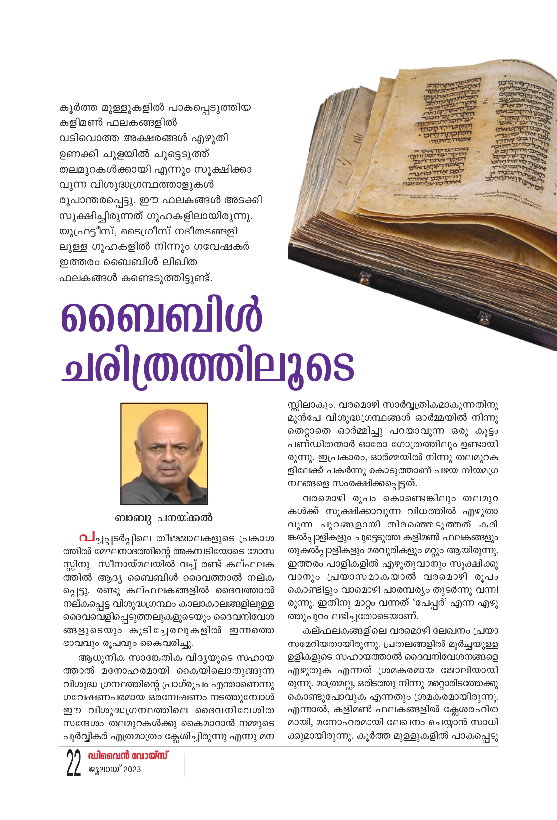 പച്ചപ്പടർപ്പിലെ തീജ്ജ്വാലകളുടെ പ്രകാശ ത്തിൽ മേഘനാദത്തിൻ്റെ അകമ്പടിയോടെ മോസ സ്സിനു സീനായ്മലയിൽ വച്ച് രണ്ട് കല്ഫലക ത്തിൽ ആദ്യ ബൈബിൾ ദൈവത്താൽ നല്ക പ്പെട്ടു. രണ്ടു കല്ഫലകങ്ങളിൽ ദൈവത്താൽ നല്കപ്പെട്ട വിശുദ്ധഗ്രന്ഥം കാലാകാലങ്ങളിലുള്ള ദൈവവെളിപ്പെടുത്തലുകളുടെയും ദൈവനിവേശ ങ്ങളുടെയും കൂടിച്ചേരലുകളിൽ ഇന്നത്തെ ഭാവവും രൂപവും കൈവരിച്ചു. ആധുനിക സാങ്കേതിക വിദ്യയുടെ സഹായ ത്താൽ മനോഹരമായി കൈയിലൊതുങ്ങുന്ന വിശുദ്ധ ഗ്രന്ഥത്തിൻ്റെ പ്രാഗ്രൂപം എന്താണെന്നു ഗവേഷണപരമായ ഒരന്വേഷണം നടത്തുമ്പോൾ ഈ വിശുദ്ധ ഗ്രന്ഥത്തിലെ ദൈവനിവേശിത സന്ദേശം തലമുറകൾക്കു കൈമാറാൻ നമ്മുടെ പൂർവ്വികർ എത്രമാത്രം ക്ലേശിച്ചിരുന്നു എന്നു മനമുൻപേ വിശുദ്ധഗ്രന്ഥങ്ങൾ ഓർമ്മയിൽ നിന്നു തെറ്റാതെ ഓർമ്മിച്ചു പറയാവുന്ന ഒരു കൂട്ടം പണ്ഡിതന്മാർ ഓരോ ഗോത്രത്തിലും ഉണ്ടായി രുന്നു. ഇപ്രകാരം, ഓർമ്മയിൽ നിന്നു തലമുറക ളിലേക്ക് പകർന്നു കൊടുത്താണ് പഴയ നിയമഗ്ര ന്ഥങ്ങളെ സംരക്ഷിക്കപ്പെട്ടത്.