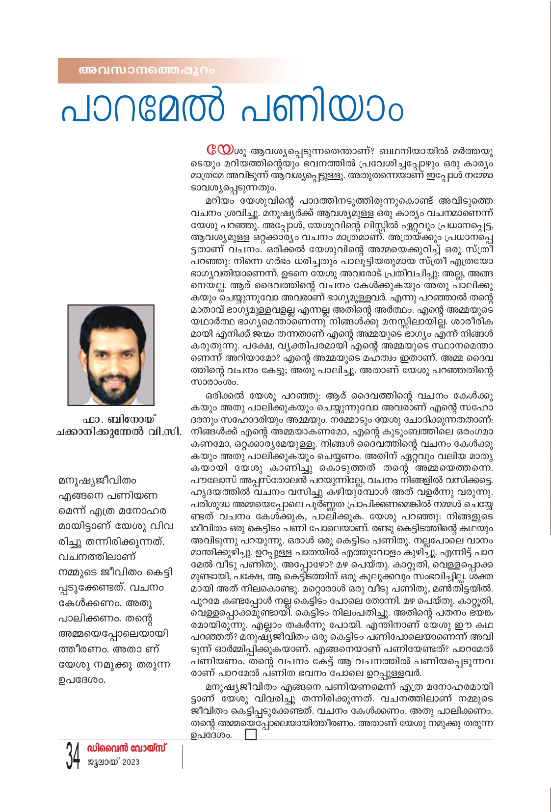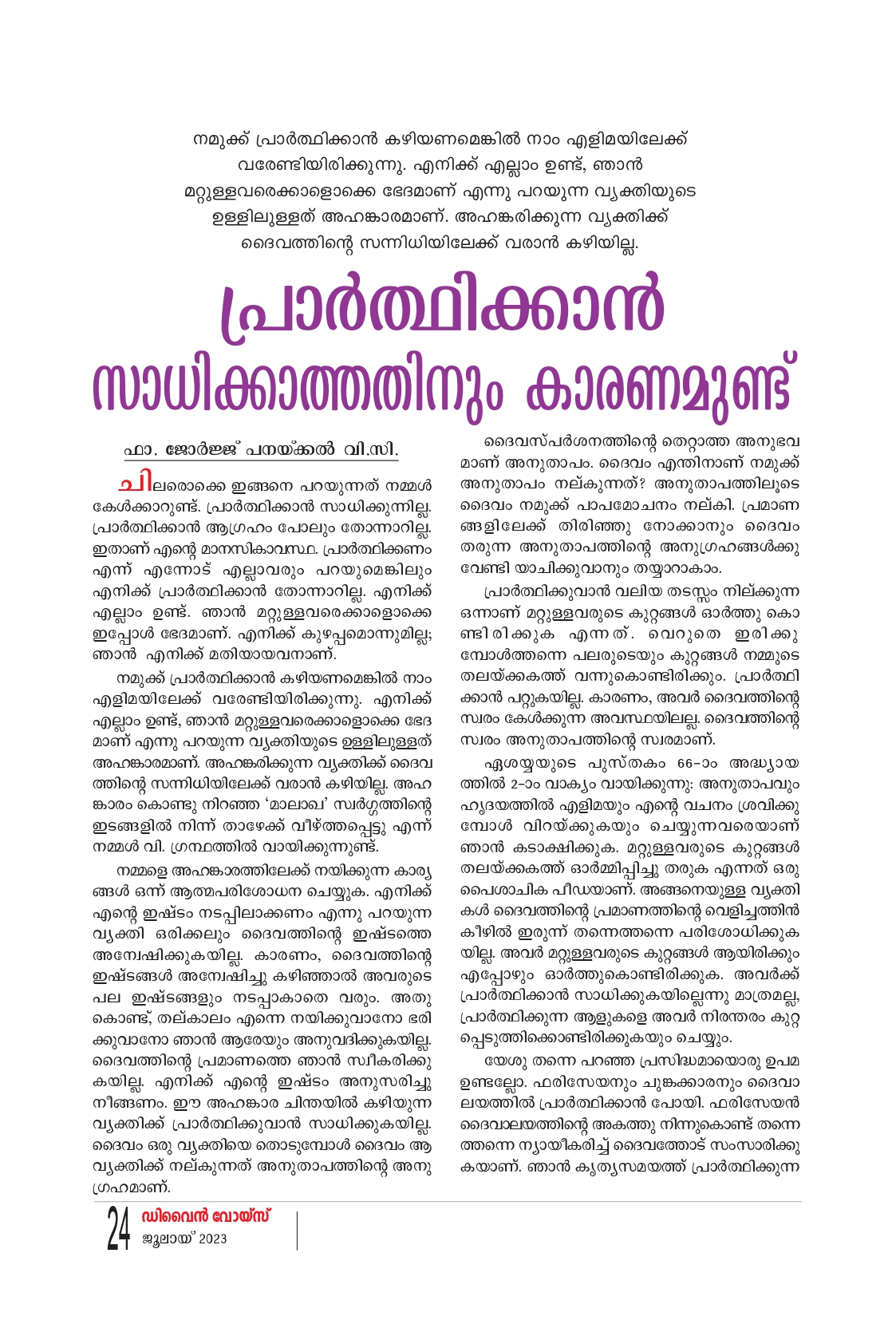 ചിലരൊക്കെ ഇങ്ങനെ പറയുന്നത് നമ്മൾ കേൾക്കാറുണ്ട്. പ്രാർത്ഥിക്കാൻ സാധിക്കുന്നില്ല. പ്രാർത്ഥിക്കാൻ ആഗ്രഹം പോലും തോന്നാറില്ല. ഇതാണ് എന്റെ മാനസികാവസ്ഥ. പ്രാർത്ഥിക്കണം എന്ന് എന്നോട് എല്ലാവരും പറയുമെങ്കിലും എനിക്ക് പ്രാർത്ഥിക്കാൻ തോന്നാറില്ല. എനിക്ക് എല്ലാം ഉണ്ട്. ഞാൻ മറ്റുള്ളവരെക്കാളൊക്കെ ഇപ്പോൾ ഭേദമാണ്. എനിക്ക് കുഴപ്പമൊന്നുമില്ല; ഞാൻ എനിക്ക് മതിയായവനാണ്. നമുക്ക് പ്രാർത്ഥിക്കാൻ കഴിയണമെങ്കിൽ നാം എളിമയിലേക്ക് വരേണ്ടിയിരിക്കുന്നു. എനിക്ക് എല്ലാം ഉണ്ട്, ഞാൻ മറ്റുള്ളവരെക്കാളൊക്കെ ഭേദ മാണ് എന്നു പറയുന്ന വ്യക്തിയുടെ ഉള്ളിലുള്ളത് അഹങ്കാരമാണ്. അഹങ്കരിക്കുന്ന വ്യക്തിക്ക് ദൈവ ത്തിന്റെ സന്നിധിയിലേക്ക് വരാൻ കഴിയില്ല. അഹ ങ്കാരം കൊണ്ടു നിറഞ്ഞ 'മാലാഖ' സ്വർഗ്ഗത്തിൻ്റെ ഇടങ്ങളിൽ നിന്ന് താഴേക്ക് വീഴ്ത്തപ്പെട്ടു എന്ന് നമ്മൾ വി. ഗ്രന്ഥത്തിൽ വായിക്കുന്നുണ്ട്. നമ്മളെ അഹങ്കാരത്തിലേക്ക് നയിക്കുന്ന കാര്യ ങ്ങൾ ഒന്ന് ആത്മപരിശോധന ചെയ്യുക. എനിക്ക് എന്റെ ഇഷ്ടം നടപ്പിലാക്കണം എന്നു പറയുന്ന വ്യക്തി ഒരിക്കലും ദൈവത്തിൻ്റെ ഇഷ്ടത്തെ അന്വേഷിക്കുകയില്ല. കാരണം, ദൈവത്തിൻ്റെ ഇഷ്ട്ടങ്ങൾ അന്വേഷിച്ചു കഴിഞ്ഞാൽ അവരുടെ പല ഇഷ്ടങ്ങളും നടപ്പാകാതെ വരും. അതു കൊണ്ട്, തല്കാലം എന്നെ നയിക്കുവാനോ ഭരി ക്കുവാനോ ഞാൻ ആരേയും അനുവദിക്കുകയില്ല. ദൈവത്തിന്റെ പ്രമാണത്തെ ഞാൻ സ്വീകരിക്കു കയില്ല. എനിക്ക് എൻ്റെ ഇഷ്ടം അനുസരിച്ചു നീങ്ങണം. ഈ അഹങ്കാര ചിന്തയിൽ കഴിയുന്ന വ്യക്തിക്ക് പ്രാർത്ഥിക്കുവാൻ സാധിക്കുകയില്ല.