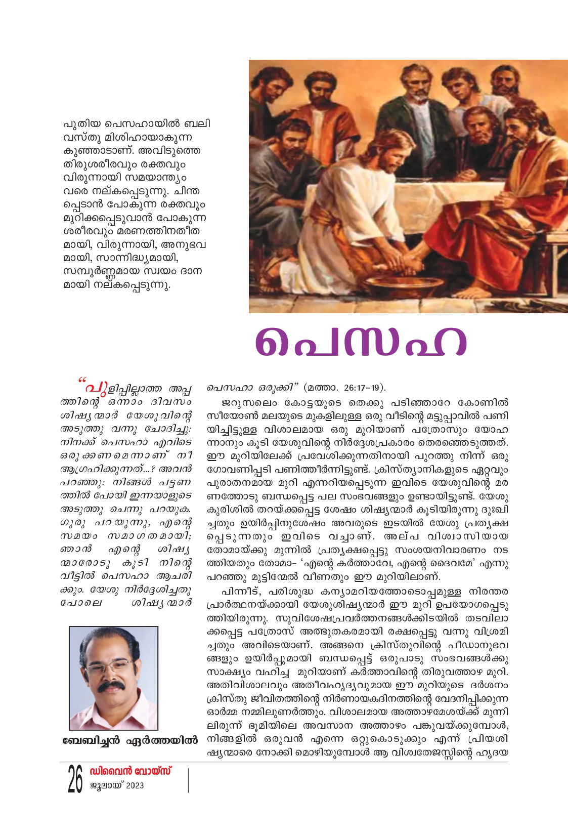 പുളിപ്പില്ലാത്ത അപ്പ ത്തിൻ്റെ ഒന്നാം ദിവസം ശിഷ്യന്മാർ യേശുവിൻ്റെ അടുത്തു വന്നു ചോദിച്ചു: നിനക്ക് പെസഹാ എവിടെ ഒരുക്കണമെന്നാണ് നീ ആഗ്രഹിക്കുന്നത്...? അവൻ പറഞ്ഞു: നിങ്ങൾ പട്ടണ ത്തിൽ പോയി ഇന്നയാളുടെ അടുത്തു ചെന്നു പറയുക. ഗുരു പറയുന്നു. എൻ്റെ സമയം സമാഗതമായി; ഞാൻ എന്റെ ശിഷ്യ ന്മാരോടു കൂടി നിൻ്റെ വീട്ടിൽ പെസഹാ ആചരി ക്കും. യേശു നിർദ്ദേശിച്ചതു പോലെ ശിഷ്യന്മാർ പെസഹ പെസഹാ ഒരുക്കി" (മത്താ. 26:17-19). ജറുസലെം കോട്ടയുടെ തെക്കു പടിഞ്ഞാറേ കോണിൽ സീയോൺ മലയുടെ മുകളിലുള്ള ഒരു വീടിൻ്റെ മട്ടുപ്പാവിൽ പണി യിച്ചിട്ടുള്ള വിശാലമായ ഒരു മുറിയാണ് പത്രോസും യോഹ ന്നാനും കൂടി യേശുവിൻ്റെ നിർദ്ദേശപ്രകാരം തെരഞ്ഞെടുത്തത്. ഈ മുറിയിലേക്ക് പ്രവേശിക്കുന്നതിനായി പുറത്തു നിന്ന് ഒരു ഗോവണിപ്പടി പണിത്തീർന്നിട്ടുണ്ട്. ക്രിസ്ത്യാനികളുടെ ഏറ്റവും പുരാതനമായ മുറി എന്നറിയപ്പെടുന്ന ഇവിടെ യേശുവിന്റെ മര ണത്തോടു ബന്ധപ്പെട്ട പല സംഭവങ്ങളും ഉണ്ടായിട്ടുണ്ട്. യേശു കുരിശിൽ തറയ്ക്കപ്പെട്ട ശേഷം ശിഷ്യന്മാർ കൂടിയിരുന്നു ദുഃഖി ച്ചതും ഉയിർപ്പിനുശേഷം അവരുടെ ഇടയിൽ യേശു പ്രത്യക്ഷ പ്പെടുന്നതും ഇവിടെ വച്ചാണ്. അല്പ വിശ്വാസിയായ തോമായ്ക്കു മുന്നിൽ പ്രത്യക്ഷപ്പെട്ടു സംശയനിവാരണം നട ത്തിയതും തോമാ- 'എൻ്റെ കർത്താവേ, എൻ്റെ ദൈവമേ' എന്നു പറഞ്ഞു മുട്ടിന്മേൽ വീണതും ഈ മുറിയിലാണ്