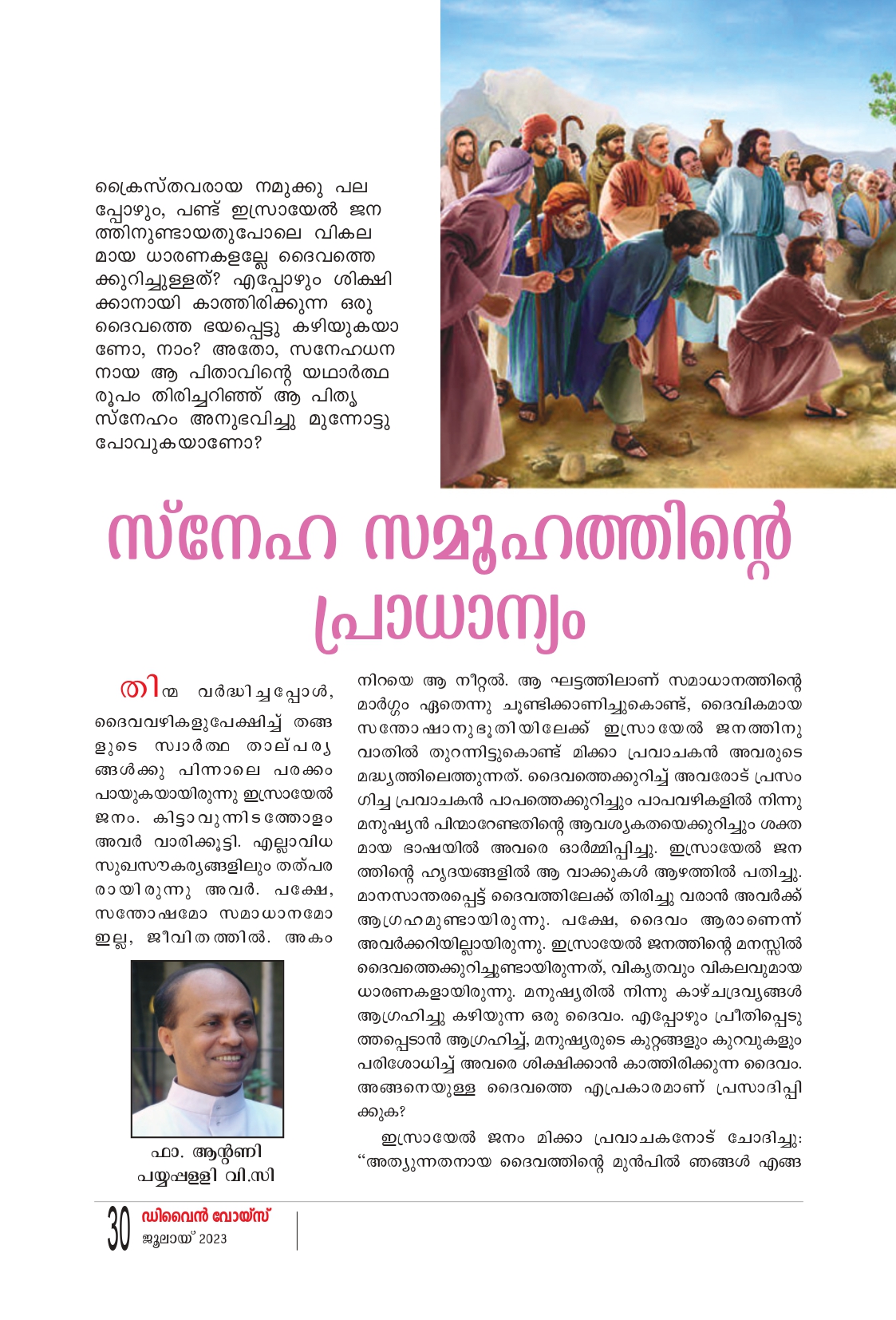 തിന്മ വർദ്ധിച്ചപ്പോൾ, ദൈവവഴികളുപേക്ഷിച്ച് തങ്ങ ളുടെ സ്വാർത്ഥ താല്പര്യ ങ്ങൾക്കു പിന്നാലെ പരക്കം പായുകയായിരുന്നു ഇസ്രായേൽ ജനം. കിട്ടാവുന്നിടത്തോളം അവർ വാരിക്കൂട്ടി. എല്ലാവിധ സുഖസൗകര്യങ്ങളിലും തത്പര രായിരുന്നു അവർ. പക്ഷേ, സന്തോഷമോ സമാധാനമോ ഇല്ല, ജീവിതത്തിൽ. അകം നിറയെ ആ നീറ്റൽ. ആ ഘട്ടത്തിലാണ് സമാധാനത്തിന്റെ മാർഗ്ഗം ഏതെന്നു ചൂണ്ടിക്കാണിച്ചുകൊണ്ട്, ദൈവികമായ സന്തോഷാനുഭൂതിയിലേക്ക് ഇസ്രായേൽ ജനത്തിനു വാതിൽ തുറന്നിട്ടുകൊണ്ട് മിക്കാ പ്രവാചകൻ അവരുടെ മദ്ധ്യത്തിലെത്തുന്നത്. ദൈവത്തെക്കുറിച്ച് അവരോട് പ്രസം ഗിച്ച പ്രവാചകൻ പാപത്തെക്കുറിച്ചും പാപവഴികളിൽ നിന്നു മനുഷ്യൻ പിന്മാറേണ്ടതിൻ്റെ ആവശ്യകതയെക്കുറിച്ചും ശക്ത മായ ഭാഷയിൽ അവരെ ഓർമ്മിപ്പിച്ചു. ഇസ്രായേൽ ജന ത്തിൻ്റെ ഹൃദയങ്ങളിൽ ആ വാക്കുകൾ ആഴത്തിൽ പതിച്ചു. മാനസാന്തരപ്പെട്ട് ദൈവത്തിലേക്ക് തിരിച്ചു വരാൻ അവർക്ക് ആഗ്രഹമുണ്ടായിരുന്നു. പക്ഷേ, ദൈവം ആരാണെന്ന് അവർക്കറിയില്ലായിരുന്നു. ഇസ്രായേൽ ജനത്തിൻ്റെ മനസ്സിൽ ദൈവത്തെക്കുറിച്ചുണ്ടായിരുന്നത്, വികൃതവും വികലവുമായ ധാരണകളായിരുന്നു. മനുഷ്യരിൽ നിന്നു കാഴ്ചദ്രവ്യങ്ങൾ ആഗ്രഹിച്ചു കഴിയുന്ന ഒരു ദൈവം. എപ്പോഴും പ്രീതിപ്പെടു ത്തപ്പെടാൻ ആഗ്രഹിച്ച്, മനുഷ്യരുടെ കുറ്റങ്ങളും കുറവുകളും പരിശോധിച്ച് അവരെ ശിക്ഷിക്കാൻ കാത്തിരിക്കുന്ന ദൈവം. അങ്ങനെയുള്ള ദൈവത്തെ എപ്രകാരമാണ് പ്രസാദിപ്പി ക്കുക?