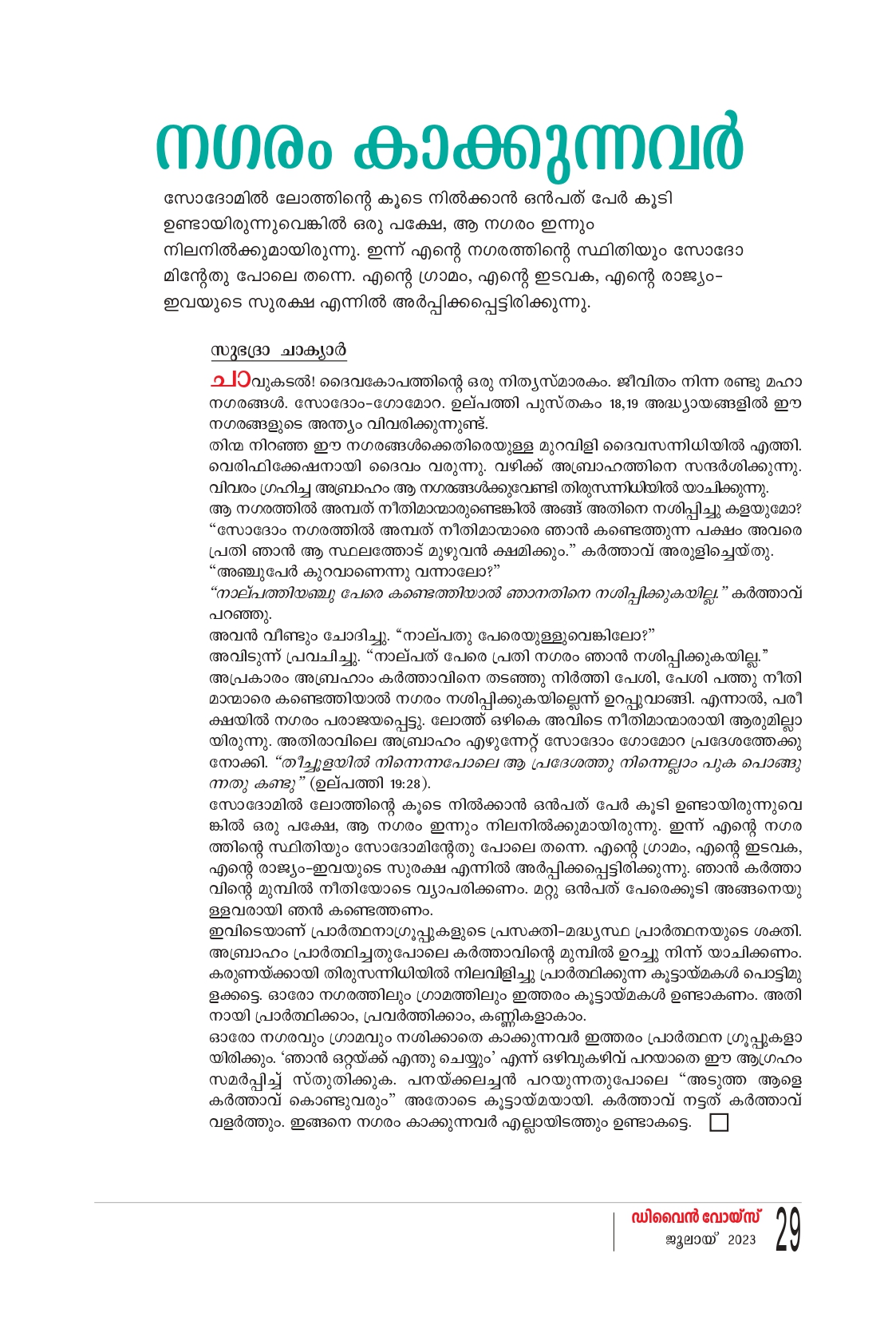 ചാവുകടൽ! ദൈവകോപത്തിൻ്റെ ഒരു നിത്യസ്മാരകം. ജീവിതം നിന്ന രണ്ടു മഹാ നഗരങ്ങൾ. സോദോം-ഗോമോറ. ഉല്പത്തി പുസ്തകം 18,19 അദ്ധ്യായങ്ങളിൽ ഈ നഗരങ്ങളുടെ അന്ത്യം വിവരിക്കുന്നുണ്ട്. തിന്മ നിറഞ്ഞ ഈ നഗരങ്ങൾക്കെതിരെയുള്ള മുറവിളി ദൈവസന്നിധിയിൽ എത്തി. വെരിഫിക്കേഷനായി ദൈവം വരുന്നു. വഴിക്ക് അബ്രാഹത്തിനെ സന്ദർശിക്കുന്നു. വിവരം ഗ്രഹിച്ച അബ്രാഹം ആ നഗരങ്ങൾക്കുവേണ്ടി തിരുസന്നിധിയിൽ യാചിക്കുന്നു. ആ നഗരത്തിൽ അമ്പത് നീതിമാന്മാരുണ്ടെങ്കിൽ അങ്ങ് അതിനെ നശിപ്പിച്ചു കളയുമോ? "സോദോം നഗരത്തിൽ അമ്പത് നീതിമാന്മാരെ ഞാൻ കണ്ടെത്തുന്ന പക്ഷം അവരെ പ്രതി ഞാൻ ആ സ്ഥലത്തോട് മുഴുവൻ ക്ഷമിക്കും." കർത്താവ് അരുളിച്ചെയ്തു. “അഞ്ചുപേർ കുറവാണെന്നു വന്നാലോ?" “നാല്പത്തിയഞ്ചു പേരെ കണ്ടെത്തിയാൽ ഞാനതിനെ നശിപ്പിക്കുകയില്ല." കർത്താവ് പറഞ്ഞു. അവൻ വീണ്ടും ചോദിച്ചു. "നാല്പതു പേരെയുള്ളുവെങ്കിലോ?” അവിടുന്ന് പ്രവചിച്ചു. “നാല്പത് പേരെ പ്രതി നഗരം ഞാൻ നശിപ്പിക്കുകയില്ല." അപ്രകാരം അബ്രഹാം കർത്താവിനെ തടഞ്ഞു നിർത്തി പേശി, പേശി പത്തു നീതി മാന്മാരെ കണ്ടെത്തിയാൽ നഗരം നശിപ്പിക്കുകയില്ലെന്ന് ഉറപ്പുവാങ്ങി. എന്നാൽ, പരീ ക്ഷയിൽ നഗരം പരാജയപ്പെട്ടു. ലോത്ത് ഒഴികെ അവിടെ നീതിമാന്മാരായി ആരുമില്ലാ യിരുന്നു. അതിരാവിലെ അബ്രാഹം എഴുന്നേറ്റ് സോദോം ഗോമോറ പ്രദേശത്തേക്കു നോക്കി. “തീച്ചൂളയിൽ നിന്നെന്നപോലെ ആ പ്രദേശത്തു നിന്നെല്ലാം പുക പൊങ്ങു ന്നതു കണ്ടു" (ഉല്പത്തി 19:28). സോദോമിൽ ലോത്തിൻ്റെ കൂടെ നിൽക്കാൻ ഒൻപത് പേർ കൂടി ഉണ്ടായിരുന്നുവെ ങ്കിൽ ഒരു പക്ഷേ, ആ നഗരം ഇന്നും നിലനിൽക്കുമായിരുന്നു. ഇന്ന് എന്റെ നഗര ത്തിന്റെ സ്ഥിതിയും സോദോമിൻ്റേതു പോലെ തന്നെ. എന്റെ്റെ ഗ്രാമം, എൻ്റെ ഇടവക, എന്റെ രാജ്യം-ഇവയുടെ സുരക്ഷ എന്നിൽ അർപ്പിക്കപ്പെട്ടിരിക്കുന്നു. ഞാൻ കർത്താ വിൻ്റെ മുമ്പിൽ നീതിയോടെ വ്യാപരിക്കണം. മറ്റു ഒൻപത് പേരെക്കൂടി അങ്ങനെയു ള്ളവരായി ഞൻ കണ്ടെത്തണം.