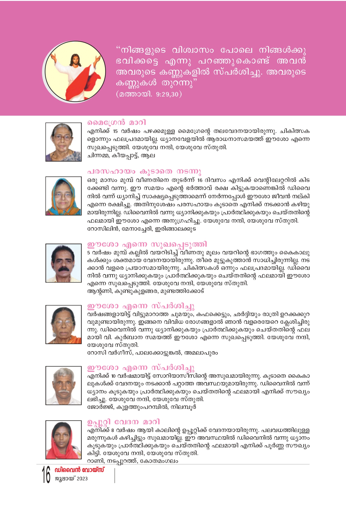 മൈഗ്രേൻ മാറി എനിക്ക് 15 വർഷം പഴക്കമുള്ള മൈഗ്രേൻ്റെ തലവേദനയായിരുന്നു. ചികിത്സക ളൊന്നും ഫലപ്രദമായില്ല. ധ്യാനവേളയിൽ ആരാധനാസമയത്ത് ഈശോ എന്നെ സുഖപ്പെടുത്തി. യേശുവേ നന്ദി, യേശുവേ സ്തുതി. ചിന്നമ്മ, കീയപ്പാട്ട്,
