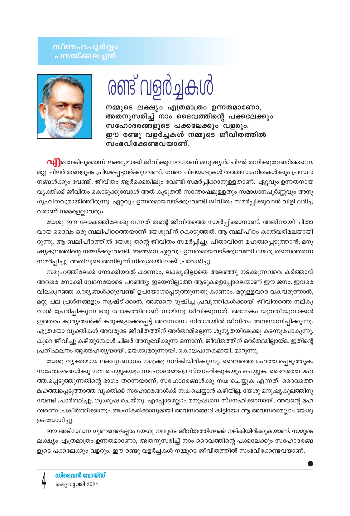 നമ്മുടെ ലക്ഷ്യം എത്രമാത്രം ഉന്നതമാണോ, അതനുസരിച്ച് നാം ദൈവത്തിൻ്റെ പക്കലേക്കും സഹോദരങ്ങളുടെ പക്കലേക്കും വളരും. ഈ രണ്ടു വളർച്ചകൾ നമ്മുടെ ജീവിതത്തിൽ സംഭവിക്കേണ്ടവയാണ്. എന്തെങ്കിലുമൊന്ന് ലക്ഷ്യമാക്കി ജീവിക്കുന്നവനാണ് മനുഷ്യൻ. ചിലർ തനിക്കുവേണ്ടിത്തന്നെ. മറ്റു ചിലർ തങ്ങളുടെ പ്രിയപ്പെട്ടവർക്കുവേണ്ടി. വേറെ ചിലയാളുകൾ തത്ത്വസംഹിതകൾക്കും പ്രസ്ഥാ നങ്ങൾക്കും വേണ്ടി ജീവിതം ആർക്കെങ്കിലും വേണ്ടി സമർപ്പിക്കാനുള്ളതാണ്. ഏറ്റവും ഉന്നതനായ വ്യക്തിക്ക് ജീവിതം കൊടുക്കുമ്പോൾ അത് കൂടുതൽ സന്തോഷമുള്ളതും സമാധാനപൂർണ്ണവും അനു ഗൃഹീതവുമായിത്തീരുന്നു. ഏറ്റവും ഉന്നതമായവയ്ക്കുവേണ്ടി ജീവിതം സമർപ്പിക്കുവാൻ വിളി ലഭിച്ച വരാണ് നമ്മളെല്ലാവരും..