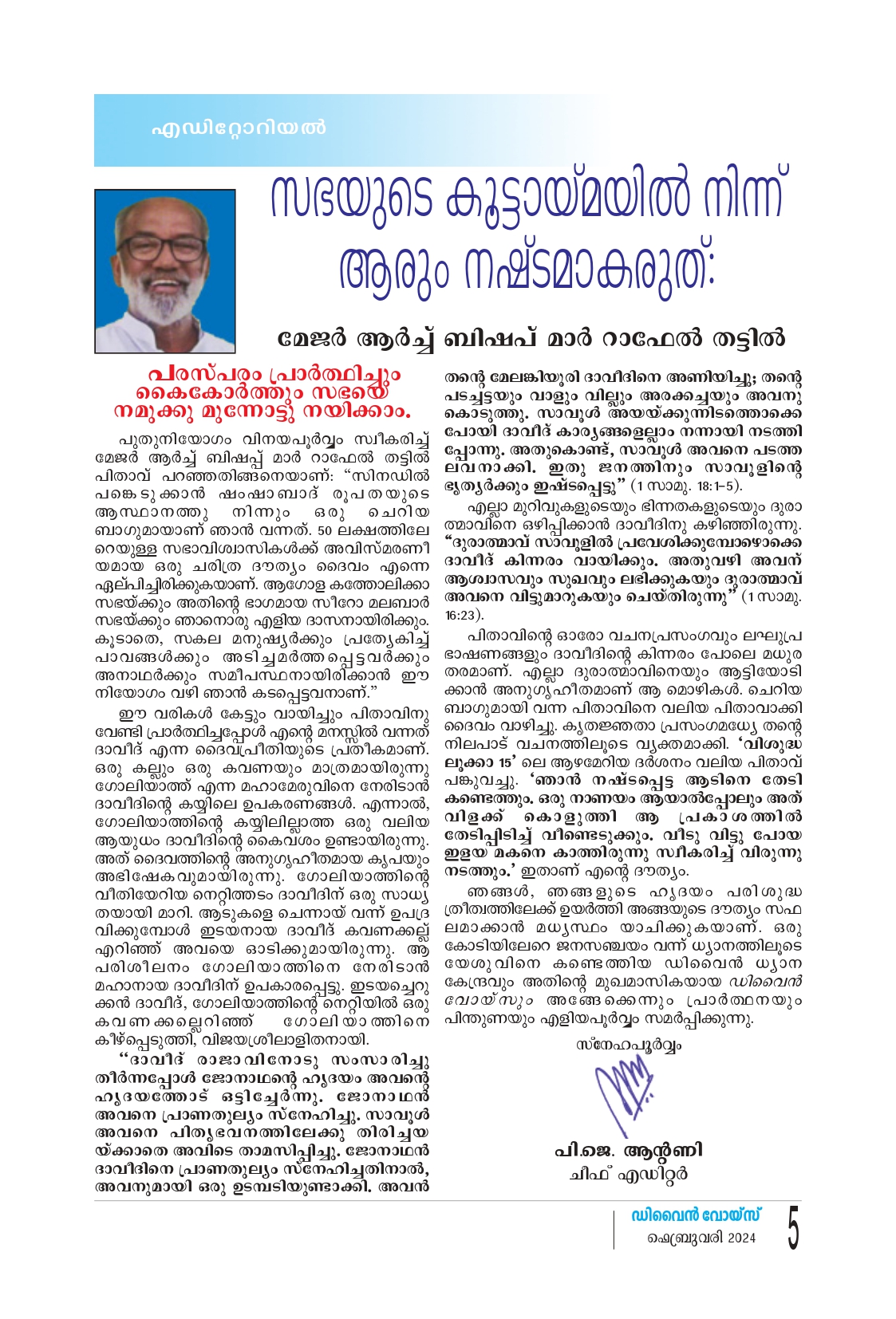 വിശുദ്ധ പത്രോസിനെ സഭയുടെ തലവ നായി ഈശോ നിയമിച്ചത് നീ എന്റെ ആടുകളെ മേയ്ക്കുക എന്ന പ്രസ്താവനയിലൂടെയാണ്. ഇന്ന് സീറോ മലബാർ സഭയുടെ സിനഡ് മാർ റാഫേൽ തട്ടിലിനെ സഭയുടെ തലവനായി തിരഞ്ഞെടുത്തത് ഇതേ മനസോടെയാണ്. പ്രാദേശികമോ രാഷ്ട്രീ യമോ മാനുഷികമോ ആയ വ്യത്യസ്ത മാനദണ്ഡ ങ്ങളല്ല, പരിശുദ്ധാത്മാവാണ് മേജർ ആർച്ചുബിഷ പ്പിനെ തെരഞ്ഞെടുക്കുന്നതെന്ന് സിനഡിലെ അംഗങ്ങൾ തെളിയിച്ചിരിക്കുന്നു. ആടുകളെ അറിയുന്ന ഒരു ഇടയനെ തെരഞ്ഞെടുക്കുക വഴിയായി സീറോമലബാർ സിനഡിലെ മെത്രാൻമാർ ബഹുമാനിതരായിരിക്കുകയാണ്.