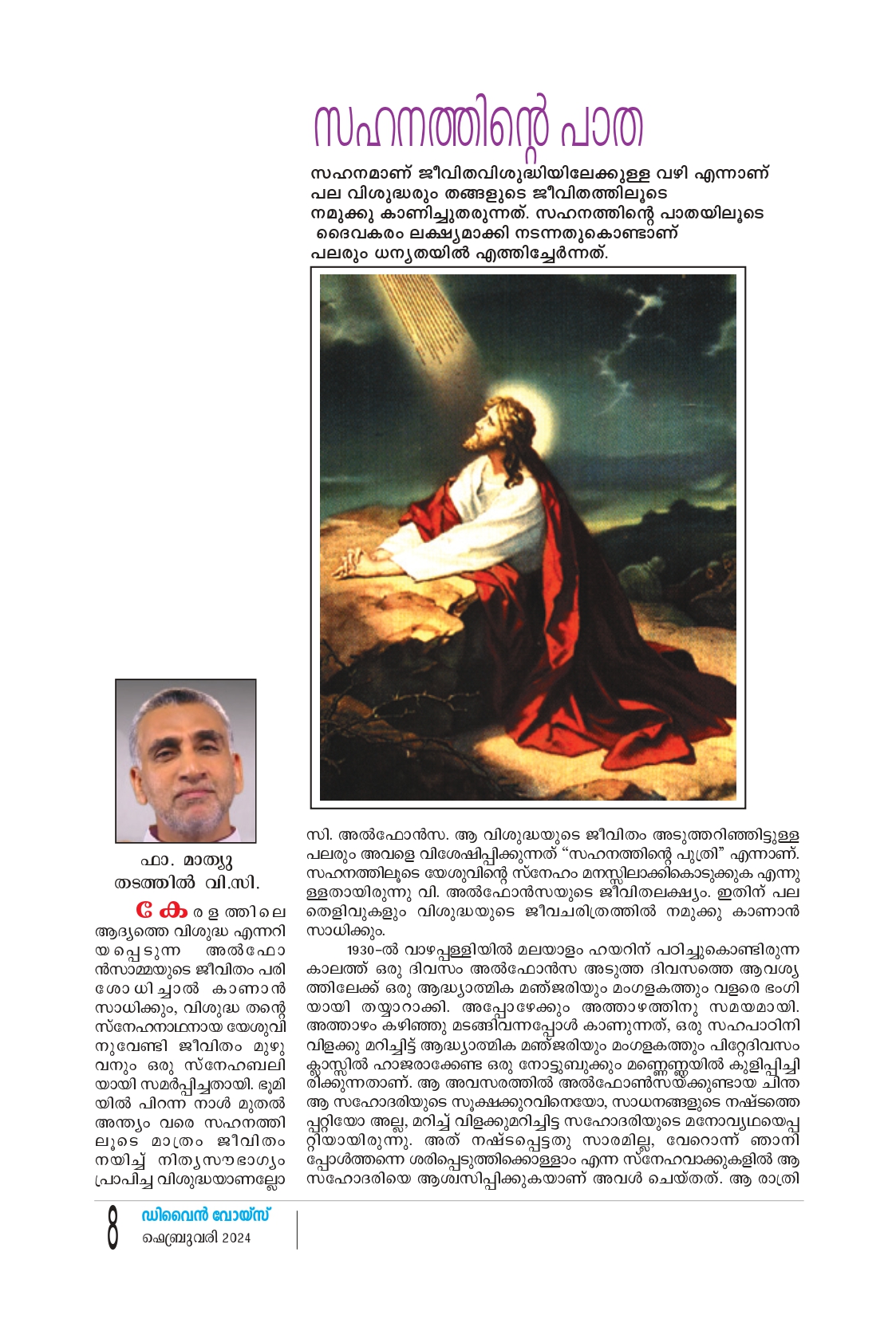 കേരളത്തിലെ ആദ്യത്തെ വിശുദ്ധ എന്നറി യപ്പെടുന്ന അൽഫോ ൻസാമ്മയുടെ ജീവിതം പരി ശോധിച്ചാൽ കാണാൻ സാധിക്കും, വിശുദ്ധ തന്റെ സ്നേഹനാഥനായ യേശുവി നുവേണ്ടി ജീവിതം മുഴു വനും ഒരു സ്നേഹബലി യായി സമർപ്പിച്ചതായി. ഭൂമി യിൽ പിറന്ന നാൾ മുതൽ അന്ത്യം വരെ സഹനത്തി ലൂടെ മാത്രം ജീവിതം നയിച്ച് നിത്യസൗഭാഗ്യം പ്രാപിച്ച വിശുദ്ധയാണല്ലോ