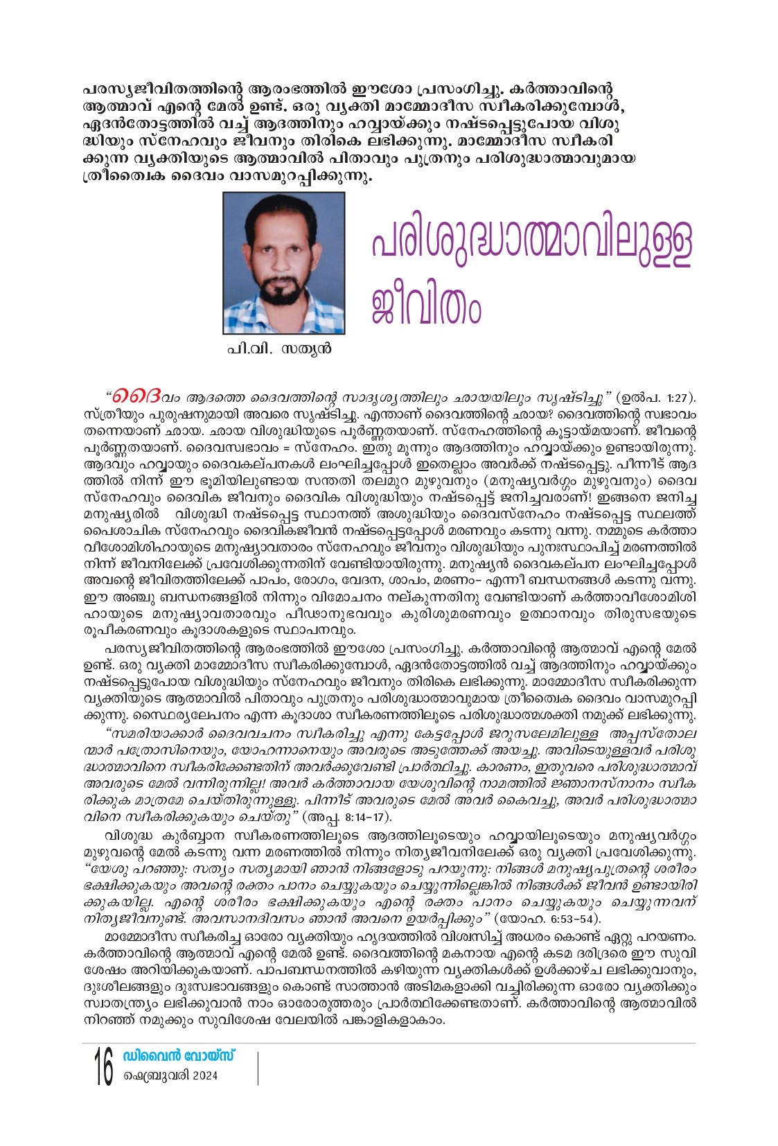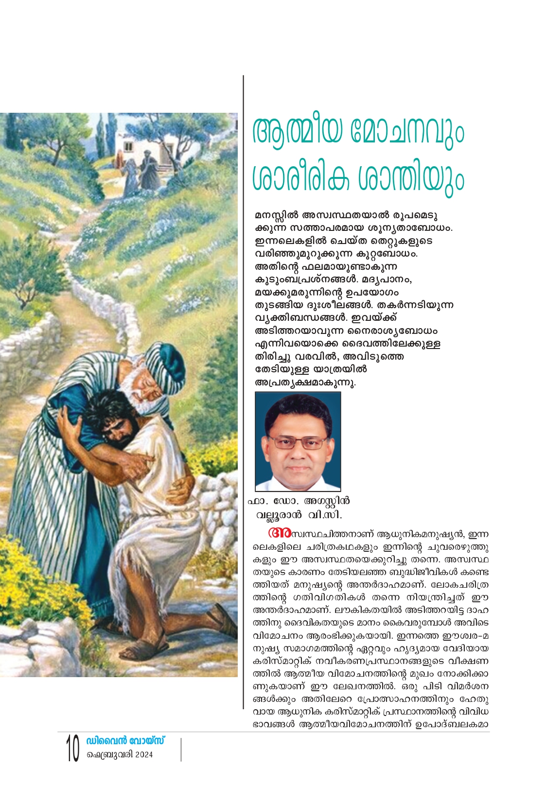 അസ്വസ്ഥചിത്തനാണ് ആധുനികമനുഷ്യൻ, ഇന്ന ലെകളിലെ ചരിത്രകഥകളും ഇന്നിന്റെ ചുവരെഴുത്തു കളും ഈ അസ്വസ്ഥതയെക്കുറിച്ചു തന്നെ അസ്വസ്ഥ തയുടെ കാരണം തേടിയലഞ്ഞ ബുദ്ധിജീവികൾ കണ്ട ത്തിയത് മനുഷ്യന്റെ അന്തർദാഹമാണ്. ലോകചരിത ത്തിന്റെ ഗതിവിഗതികൾ തന്നെ നിയന്ത്രിച്ചത് ഈ അന്തർദാഹമാണ്. ലൗകികതയിൽ അടിത്തറയിട്ട ദാഹ ത്തിനു ദൈവികതയുടെ മാനം കൈവരുമ്പോൾ അവിടെ വിമോചനം ആരംഭിക്കുകയായി. ഇന്നത്തെ ഈശ്വര-മ നുഷ്യ സമാഗമത്തിൻ്റെ ഏറ്റവും ഹൃദ്യമായ വേദിയായ കരിസ്മാറ്റിക് നവീകരണപ്രസ്ഥാനങ്ങളുടെ വീക്ഷണത്തിൽ ആത്മീയ വിമോചനത്തിൻ്റെ മുഖം നോക്കിക്കാണുകയാണ് ഈ ലേഖനത്തിൽ ഒരു പിടിവിമർശന ങ്ങൾക്കും അതിലേറെ പ്രോത്സാഹനത്തിനും ഹേതുവായ ആധുനിക കരിസ്മാറ്റിക് പ്രസ്ഥാനത്തിന്റെ വിവിധ ഭാവങ്ങൾ ആത്മീയവിമോചനത്തിന്