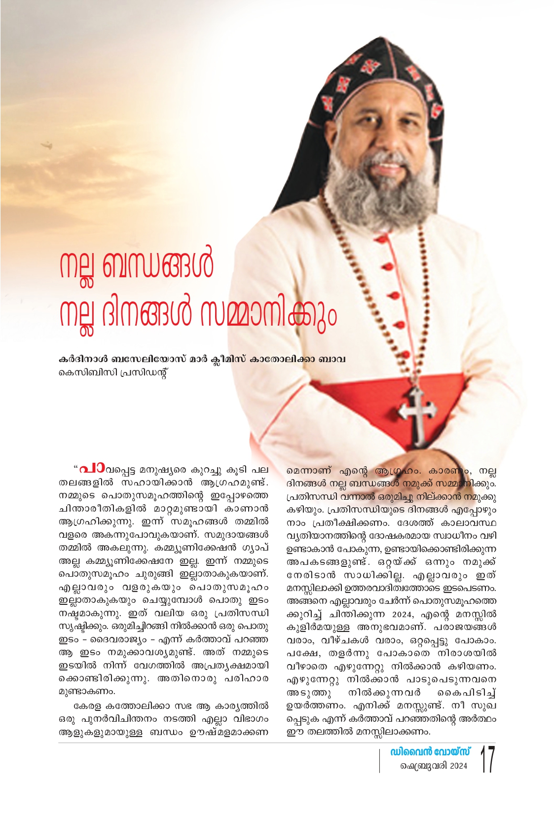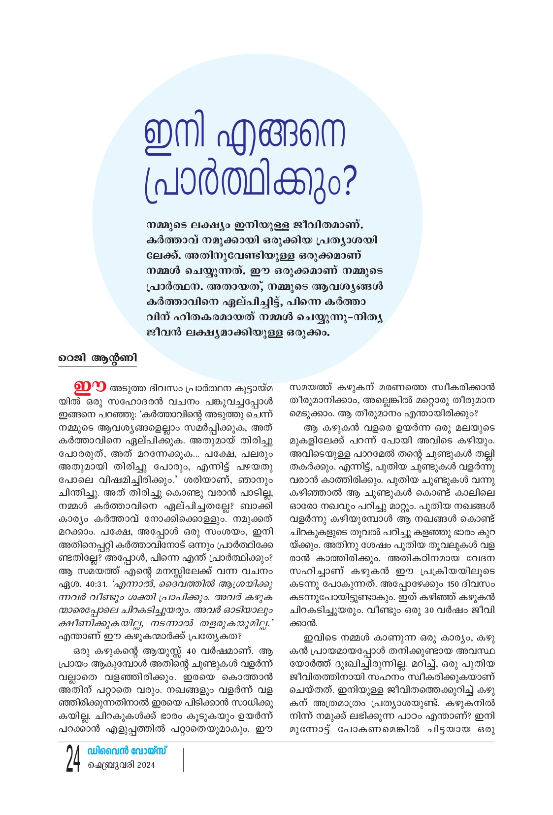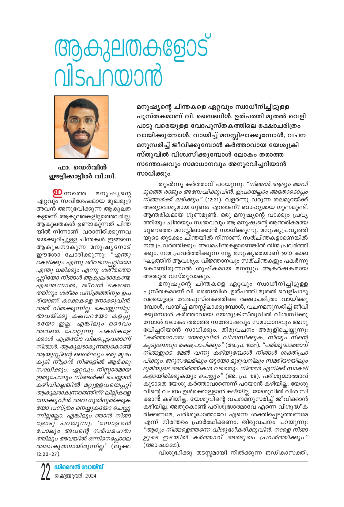ഇന്നത്തെ മനുഷ്യൻ്റെ ഏറ്റവും സവിശേഷമായ മുഖമുദ്ര അവൻ അനുഭവിക്കുന്ന ആകുലത കളാണ്. ആകുലതകളില്ലാത്തവരില്ല. ആകുലതകൾ ഉണ്ടാകുന്നത് ചിന്ത യിൽ നിന്നാണ്. വരാനിരിക്കുന്നവ യെക്കുറിച്ചുള്ള ചിന്തകൾ. ഇങ്ങനെ ആകുലനാകുന്ന മനുഷ്യനോട് ഈശോ ചോദിക്കുന്നു: “എന്തു ഭക്ഷിക്കും എന്നു ജീവനെപ്പറ്റിയോ എന്തു ധരിക്കും എന്നു ശരീരത്തെ പ്പറ്റിയോ നിങ്ങൾ ആകുലരാകേണ്ട. എന്തെന്നാൽ, ജീവൻ ഭക്ഷണ ത്തിനും ശരീരം വസ്ത്രത്തിനും ഉപ രിയാണ്. കാക്കകളെ നോക്കുവിൻ. അത് വിതക്കുന്നില്ല, കൊയ്യുന്നില്ല. അവയ്ക്കു കലവറയോ കളപ്പു രയോ ഇല്ല.