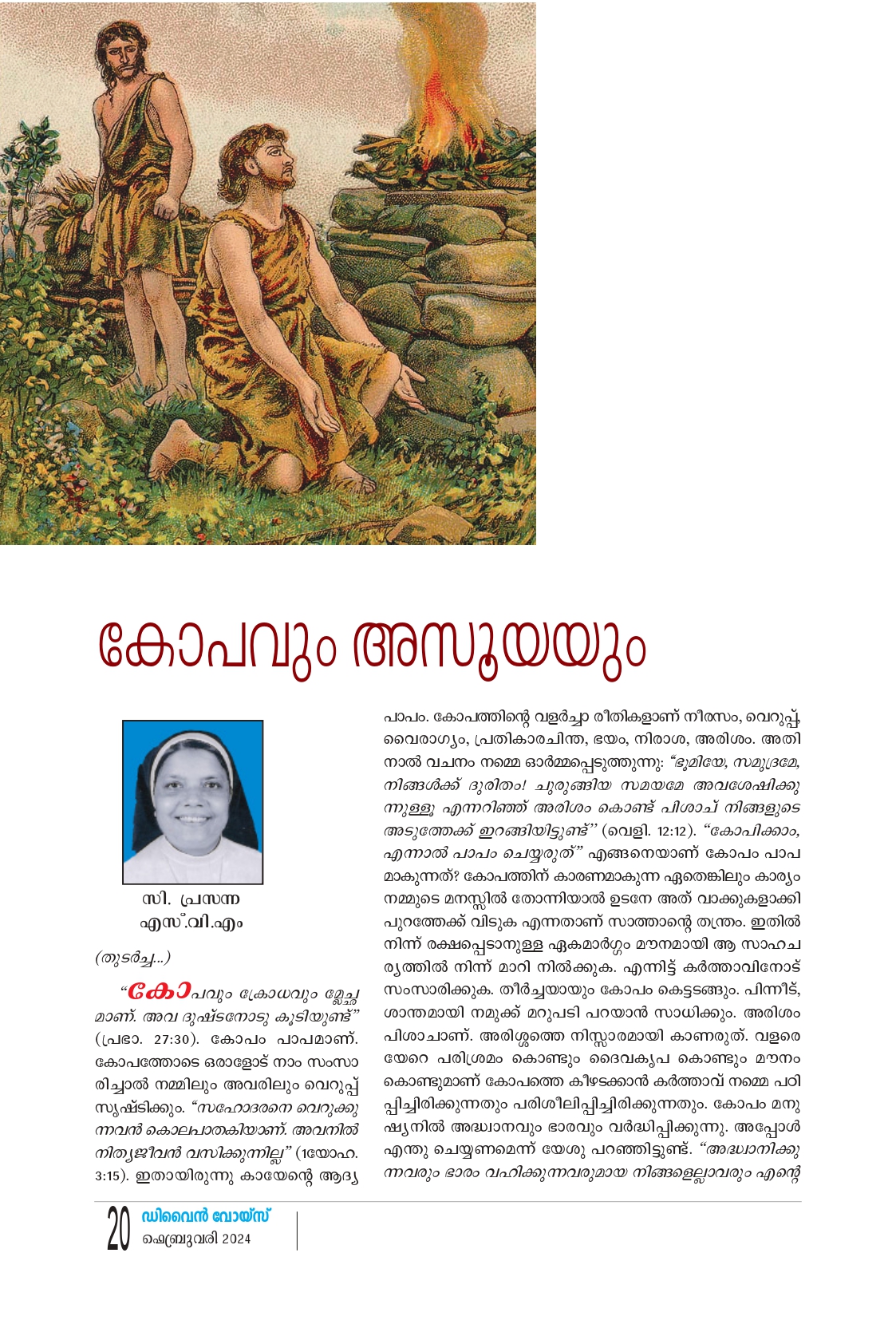“കോപവും ക്രോധവും ക്ലേച്ഛ മാണ്. അവ ദുഷ്ടനോടു കൂടിയുണ്ട്" (പ്രഭാ. 27:30). കോപം പാപമാണ്. കോപത്തോടെ ഒരാളോട് നാം സംസാ രിച്ചാൽ നമ്മിലും അവരിലും വെറുപ്പ് സൃഷ്ടിക്കും. “സഹോദരനെ വെറുക്കു ന്നവൻ കൊലപാതകിയാണ്. അവനിൽ നിത്യജീവൻ വസിക്കുന്നില്ല" (1യോഹ. 3:15). ഇതായിരുന്നു കായേൻ്റെ ആദ്യ പാപം കോപത്തിന്റെറെ വളർച്ചാ രീതികളാണ് നിരസം, വെറുപ്പ്, വൈരാഗ്യം, പ്രതികാരചിന്ത, ഭയം, നിരാശ, അരിശം. അതി നാൽ വചനം നമ്മെ ഓർമ്മപ്പെടുത്തുന്നു: “ഭൂമിയേ, സമുദ്രമേ, നിങ്ങൾക്ക് ദുരിതം! ചുരുങ്ങിയ സമയമേ അവശേഷിക്കു ന്നുള്ളൂ എന്നറിഞ്ഞ് അരിശം കൊണ്ട് പിശാച് നിങ്ങളുടെ അടുത്തേക്ക് ഇറങ്ങിയിട്ടുണ്ട്" (വെളി. 12:12), "കോപിക്കാം, എന്നാൽ പാപം ചെയ്യരുത്"