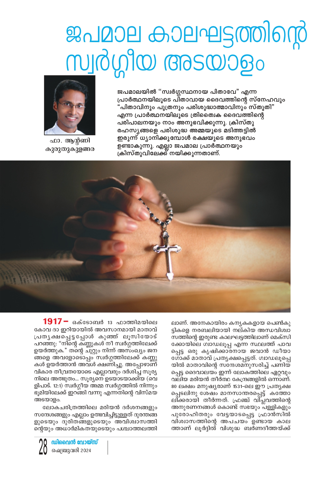 1917 - ഒക്ടോബർ 13 ഫാത്തിമയിലെ കോവ ദാ ഇറിയായിൽ അവസാനമായി മാതാവ് പ്രത്യക്ഷപ്പെട്ടപ്പോൾ കുഞ്ഞ് ലൂസിയോട് പറഞ്ഞു: "നിന്റെ കണ്ണുകൾ നീ സ്വർഗ്ഗത്തിലേക്ക് ഉയർത്തുക." തൻ്റെ ചുറ്റും നിന്ന് അസംഖ്യം ജന ങ്ങളെ അവളോടൊപ്പം സ്വർഗ്ഗത്തിലേക്ക് കണ്ണു കൾ ഉയർത്താൻ അവൾ ക്ഷണിച്ചു. അപ്പോഴാണ് വികാര തീവ്രതയോടെ എല്ലാവരും ദർശിച്ച സൂര്യ നിലെ അത്ഭുതം.. സൂര്യനെ ഉടയാടയാക്കിയ (വെ ളിപാട്. 12:1) സ്വർഗ്ഗീയ അമ്മ സ്വർഗ്ഗത്തിൽ നിന്നും ഭൂമിയിലേക്ക് ഇറങ്ങി വന്നു എന്നതിൻ്റെ വിസ്മയ അടയാളം.