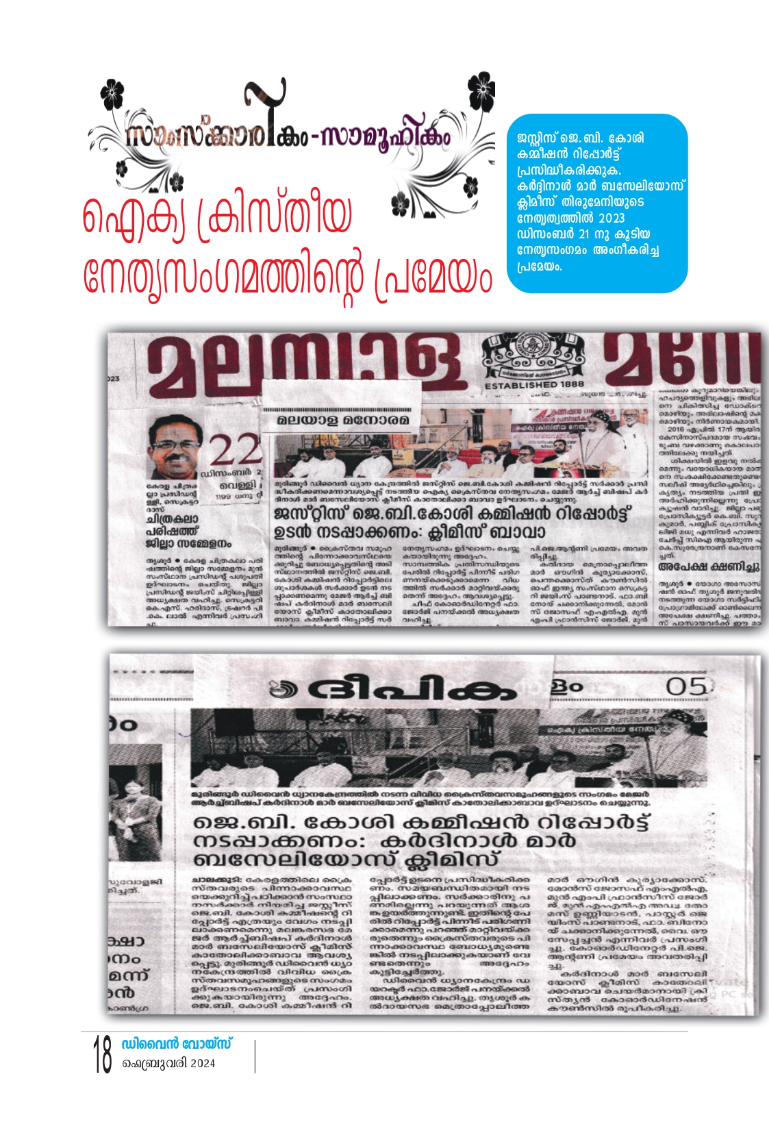 കേരളത്തിലെ ക്രൈസ്തവരുടെ പിന്നോക്കാവസ്ഥ യെക്കുറിച്ച് പഠിക്കാൻ സംസ്ഥാന സർക്കാർ നിയമിച്ച ജസ്റ്റിസ് ജെ.ബി. കോശി കമ്മീഷൻ റിപ്പോർട്ട് നടപ്പിലാ ക്കാൻ സർക്കാർ സാത്വര നടപടികൾ സ്വീകരിക്കണമെന്ന താണ് ഈ സംഗമത്തിൻ്റെ മുഖ്യമായ അജണ്ട. 2020 നവംബർ 25 നാണ് കമ്മീഷനെ സംസ്ഥാന സർക്കാർ നിയോഗിച്ചത്. ക്രിസ്ത്യൻ ന്യൂനപക്ഷങ്ങൾ നേരിടുന്ന പ്രശ്നങ്ങൾ പഠിക്കാൻ ജെ.ബി. കോശി അധ്യക്ഷനായ കമ്മീഷനിൽ മുൻ ഡി.ജി.പി. ജേക്കബ് പുന്നൂസ്, രാഷ്ട്രപതിയുടെ മുൻ സെക്രട്ടറി ഡോ. ക്രിസ്റ്റി ഫെർണാണ്ടസ് എന്നിവർ അംഗങ്ങളായിരുന്നു.
