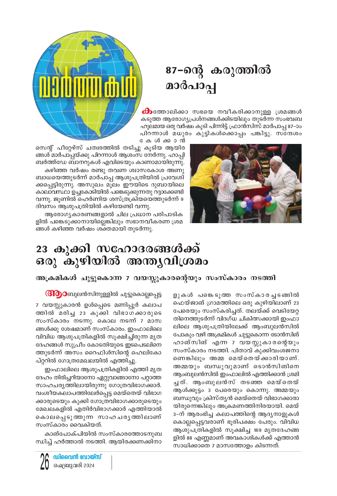 87-ന്റെ കരുത്തിൽ മാർപാപ്പ കത്തോലിക്കാ സഭയെ നവീകരിക്കാനുള്ള ശ്രമങ്ങൾ കടുത്ത ആരോഗ്യപ്രശ്നങ്ങൾക്കിടയിലും തുടർന്ന സംഭവബ ഹുലമായ ഒരു വർഷം കൂടി പിന്നിട്ട് ഫ്രാൻസിസ് മാർപാപ്പ 87-ാം പിറന്നാൾ മധുരം കുട്ടികൾക്കൊപ്പം പങ്കിട്ടു സന്ദേശം കേൾക്ക ാൻ സെന്റ് പീറ്റേഴ്സ് ചത്വരത്തിൽ തടിച്ചു കൂടിയ ആയിര ങ്ങൾ മാർപാപ്പയ്ക്കു പിറന്നാൾ ആശംസ നേർന്നു. ഹാപ്പി ബർത്ത്ഡേ ബാനറുകൾ എവിടെയും കാണാമായിരുന്നു. കഴിഞ്ഞ വർഷം രണ്ടു തവണ ശ്വാസകോശ അണു ബാധയെത്തുടർന്ന് മാർപാപ്പ ആശുപത്രിയിൽ പ്രവേശി ക്കപ്പെട്ടിരുന്നു.