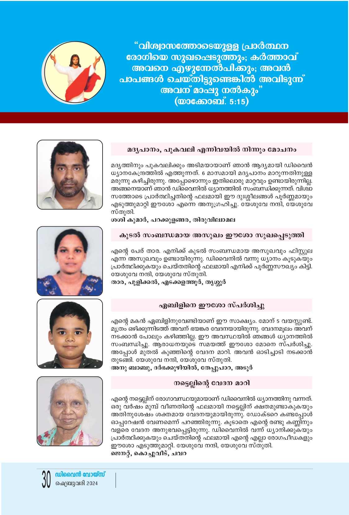 മദ്യപാനം, പുകവലി എന്നിവയിൽ നിന്നും മോചനം മദ്യത്തിനും പുകവലിക്കും അടിമയായാണ് ഞാൻ ആദ്യമായി ഡിവൈൻ ധ്യാനകേന്ദ്രത്തിൽ എത്തുന്നത്. 6 മാസമായി മദ്യപാനം മാറുന്നതിനുള്ള മരുന്നു കഴിച്ചിരുന്നു. അപ്പോഴൊന്നും ഇതിലൊരു മാറ്റവും ഉണ്ടായിരുന്നില്ല. അങ്ങനെയാണ് ഞാൻ ഡിവൈനിൽ ധ്യാനത്തിൽ സംബന്ധിക്കുന്നത്. വിശ്വാ സത്തോടെ പ്രാർത്ഥിച്ചതിൻ്റെ ഫലമായി ഈ ദുഃശ്ശീലങ്ങൾ പൂർണ്ണമായും എടുത്തുമാറ്റി ഈശോ എന്നെ അനുഗ്രഹിച്ചു.