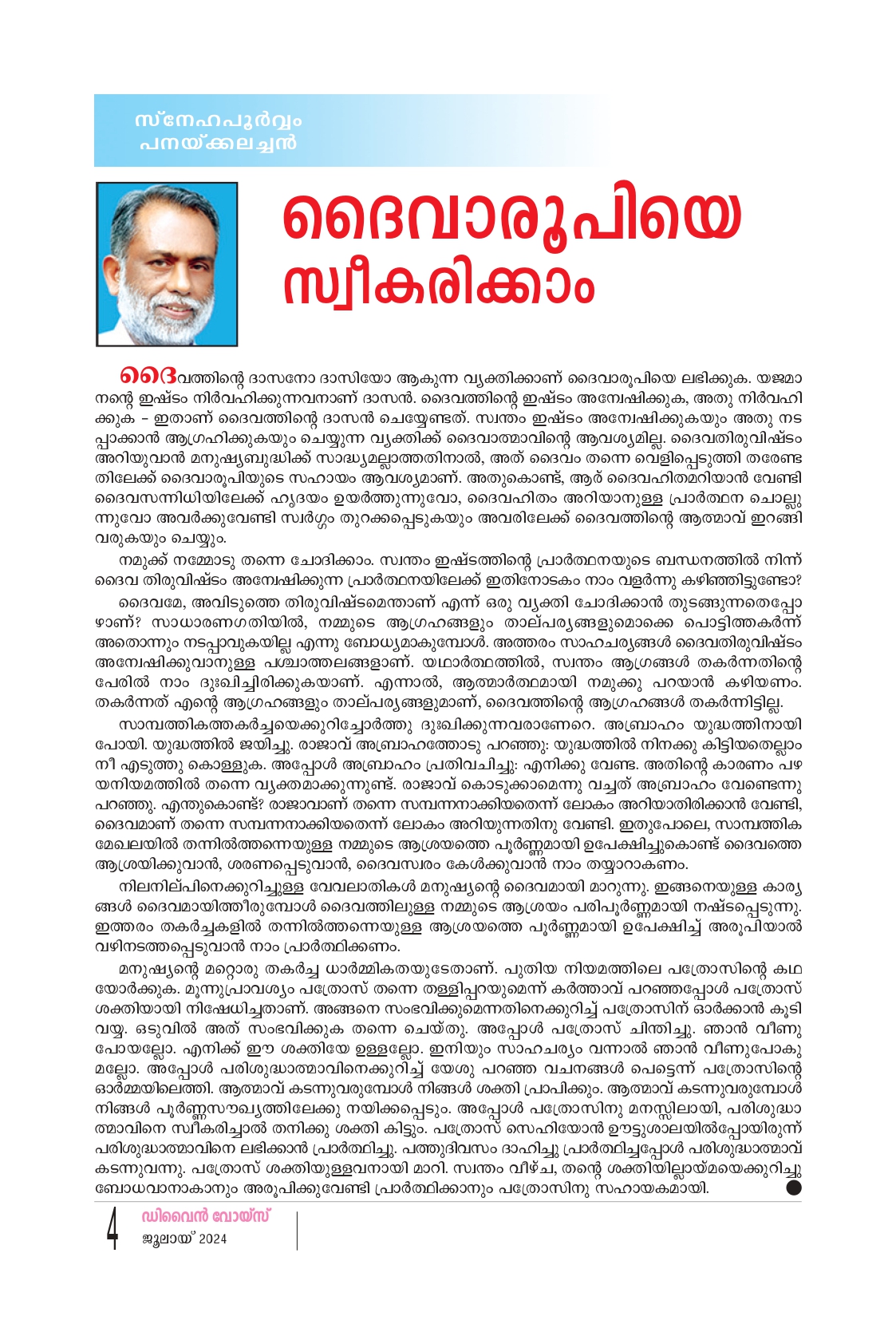 ദൈവത്തിന്റെ ദാസനോ ദാസിയോ ആകുന്ന വ്യക്തിക്കാണ് ദൈവാരൂപിയെ ലഭിക്കുക. യജമാ നന്റെ ഇഷ്ടം നിർവഹിക്കുന്നവനാണ് ദാസൻ. ദൈവത്തിൻ്റെ ഇഷ്ടം അന്വേഷിക്കുക, അതു നിർവഹി ക്കുക - ഇതാണ് ദൈവത്തിൻ്റെ ദാസൻ ചെയ്യേണ്ടത്. സ്വന്തം ഇഷ്ടം അന്വേഷിക്കുകയും അതു നട പ്പാക്കാൻ ആഗ്രഹിക്കുകയും ചെയ്യുന്ന വ്യക്തിക്ക് ദൈവാത്മാവിൻ്റെ ആവശ്യമില്ല. ദൈവതിരുവിഷം അറിയുവാൻ മനുഷ്യബുദ്ധിക്ക് സാദ്ധ്യമല്ലാത്തതിനാൽ, അത് ദൈവം തന്നെ വെളിപ്പെടുത്തി തരേണ്ട തിലേക്ക് ദൈവാരൂപിയുടെ സഹായം ആവശ്യമാണ്. അതുകൊണ്ട്, ആര് ദൈവഹിതമറിയാൻ വേണ്ടി ദൈവസന്നിധിയിലേക്ക് ഹൃദയം ഉയർത്തുന്നുവോ, ദൈവഹിതം അറിയാനുള്ള പ്രാർത്ഥന ചൊല്ലു ന്നുവോ അവർക്കുവേണ്ടി സ്വർഗ്ഗം തുറക്കപ്പെടുകയും അവരിലേക്ക് ദൈവത്തിന്റെ ആത്മാവ് ഇറങ്ങി വരുകയും ചെയ്യും. നമുക്ക് നമ്മോടു തന്നെ ചോദിക്കാം. സ്വന്തം ഇഷ്ടത്തിൻ്റെ പ്രാർത്ഥനയുടെ ബന്ധനത്തിൽ നിന്ന് ദൈവ തിരുവിഷ്ടം അന്വേഷിക്കുന്ന പ്രാർത്ഥനയിലേക്ക് ഇതിനോടകം നാം വളർന്നു കഴിഞ്ഞിട്ടുണ്ടോ? ദൈവമേ, അവിടുത്തെ തിരുവിഷ്ടമെന്താണ് എന്ന് ഒരു വ്യക്തി ചോദിക്കാൻ തുടങ്ങുന്നതെപ്പോ ഴാണ്? സാധാരണഗതിയിൽ, നമ്മുടെ ആഗ്രഹങ്ങളും താല്പര്യങ്ങളുമൊക്കെ പൊട്ടിത്തകർന്ന് അതൊന്നും നടപ്പാവുകയില്ല എന്നു ബോധ്യമാകുമ്പോൾ. അത്തരം സാഹചര്യങ്ങൾ ദൈവതിരുവിഷ്ടം അന്വേഷിക്കുവാനുള്ള പശ്ചാത്തലങ്ങളാണ്. യഥാർത്ഥത്തിൽ, സ്വന്തം ആഗ്രങ്ങൾ തകർന്നതിന്റെ പേരിൽ നാം ദുഃഖിച്ചിരിക്കുകയാണ്. എന്നാൽ, ആത്മാർത്ഥമായി നമുക്കു പറയാൻ കഴിയണം. തകർന്നത് എന്റെ ആഗ്രഹങ്ങളും താല്പര്യങ്ങളുമാണ്. ദൈവത്തിന്റെ ആഗ്രഹങ്ങൾ തകർന്നിട്ടില്ല. സാമ്പത്തികത്തകർച്ചയെക്കുറിച്ചോർത്തു ദുഃഖിക്കുന്നവരാണേറെ അബ്രാഹം യുദ്ധത്തിനായി പോയി. യുദ്ധത്തിൽ ജയിച്ചു. രാജാവ് അബ്രാഹത്തോടു പറഞ്ഞു: യുദ്ധത്തിൽ നിനക്കു കിട്ടിയതെല്ലാം നീ എടുത്തു കൊള്ളുക. അപ്പോൾ അബ്രാഹം പ്രതിവചിച്ചു: എനിക്കു വേണ്ട. അതിൻ്റെ കാരണം പഴ യനിയമത്തിൽ തന്നെ വ്യക്തമാക്കുന്നുണ്ട്. രാജാവ് കൊടുക്കാമെന്നു വച്ചത് അബ്രാഹം വേണ്ടെന്നു പറഞ്ഞു. എന്തുകൊണ്ട്? രാജാവാണ് തന്നെ സമ്പന്നനാക്കിയതെന്ന് ലോകം അറിയാതിരിക്കാൻ വേണ്ടി, ദൈവമാണ് തന്നെ സമ്പന്നനാക്കിയതെന്ന് ലോകം അറിയുന്നതിനു വേണ്ടി. ഇതുപോലെ, സാമ്പത്തിക മേഖലയിൽ തന്നിൽത്തന്നെയുള്ള നമ്മുടെ ആശ്രയത്തെ പൂർണ്ണമായി ഉപേക്ഷിച്ചുകൊണ്ട് ദൈവത്തെ ആശ്രയിക്കുവാൻ, ശരണപ്പെടുവാൻ, ദൈവസ്വരം കേൾക്കുവാൻ നാം തയ്യാറാകണം. നിലനില്പിനെക്കുറിച്ചുള്ള വേവലാതികൾ മനുഷ്യൻ്റെ ദൈവമായി മാറുന്നു. ഇങ്ങനെയുള്ള കാര്യ ങ്ങൾ ദൈവമായിത്തീരുമ്പോൾ ദൈവത്തിലുള്ള നമ്മുടെ ആശ്രയം പരിപൂർണ്ണമായി നഷ്ടപ്പെടുന്നു. ഇത്തരം തകർച്ചകളിൽ തന്നിൽത്തന്നെയുള്ള ആശ്രയത്തെ പൂ