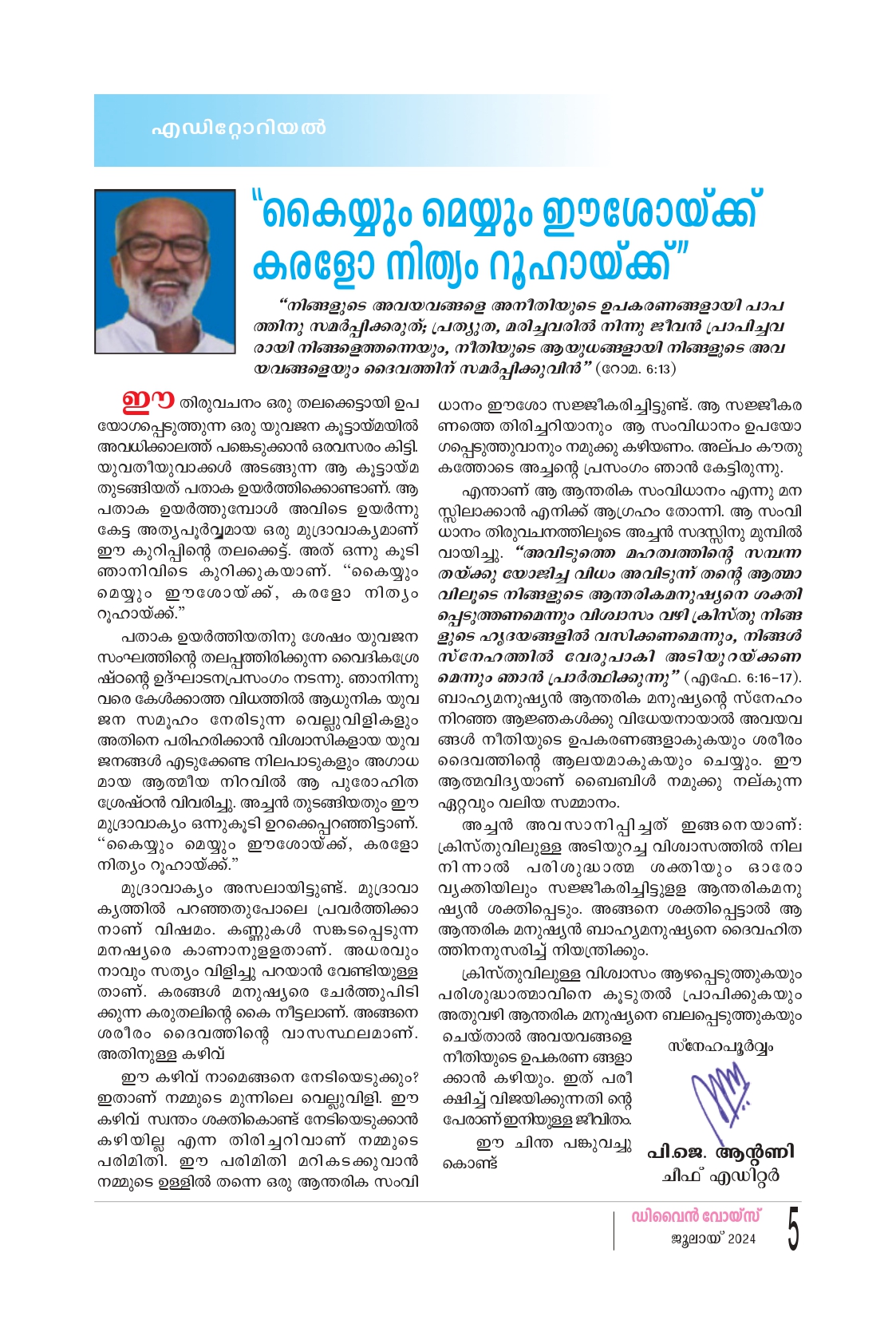 ഈ തിരുവചനം ഒരു തലക്കെട്ടായി ഉപ യോഗപ്പെടുത്തുന്ന ഒരു യുവജന കൂട്ടായ്മയിൽ അവധിക്കാലത്ത് പങ്കെടുക്കാൻ ഒരവസരം കിട്ടി. യുവതീയുവാക്കൾ അടങ്ങുന്ന ആ കൂട്ടായ്മ തുടങ്ങിയത് പതാക ഉയർത്തിക്കൊണ്ടാണ്. ആ പതാക ഉയർത്തുമ്പോൾ അവിടെ ഉയർന്നു കേട്ട അത്യപൂർവ്വമായ ഒരു മുദ്രാവാക്യമാണ് ഈ കുറിപ്പിന്റെ തലക്കെട്ട്, അത് ഒന്നു കൂടി ഞാനിവിടെ കുറിക്കുകയാണ്. "കൈയ്യും മെയ്യും ഈശോയ്ക്ക്, കരളോ നിത്യം റൂഹായ്ക്ക്." പതാക ഉയർത്തിയതിനു ശേഷം യുവജന സംഘത്തിന്റെ തലപ്പത്തിരിക്കുന്ന വൈദികശ്രേ ഷ്ഠന്റെ ഉദ്ഘാടനപ്രസംഗം നടന്നു. ഞാനിന്നു വരെ കേൾക്കാത്ത വിധത്തിൽ ആധുനിക യുവ ജന സമൂഹം നേരിടുന്ന വെല്ലുവിളികളും അതിനെ പരിഹരിക്കാൻ വിശ്വാസികളായ യുവ ജനങ്ങൾ എടുക്കേണ്ട നിലപാടുകളും അഗാധ മായ ആത്മീയ നിറവിൽ ആ പുരോഹിത ശ്രേഷ്ഠൻ വിവരിച്ചു. അച്ചൻ തുടങ്ങിയതും ഈ മുദ്രാവാക്യം ഒന്നുകൂടി ഉറക്കെപ്പറഞ്ഞിട്ടാണ്. "കൈയ്യും മെയ്യും ഈശോയ്ക്ക്, കരളോ നിത്യം റൂഹായ്ക്ക്." മുദ്രാവാക്യം അസലായിട്ടുണ്ട്. മുദ്രാവാ ക്യത്തിൽ പറഞ്ഞതുപോലെ പ്രവർത്തിക്കാ നാണ് വിഷമം. കണ്ണുകൾ സങ്കടപ്പെടുന്ന മനഷ്യരെ കാണാനുള്ളതാണ്. അധരവും നാവും സത്യം വിളിച്ചു പറയാൻ വേണ്ടിയുള്ള താണ്. കരങ്ങൾ മനുഷ്യരെ ചേർത്തുപിടി ക്കുന്ന കരുതലിന്റെ കൈ നീട്ടലാണ്. അങ്ങനെ ശരീരം ദൈവത്തിൻ്റെ വാസസ്ഥലമാണ്.