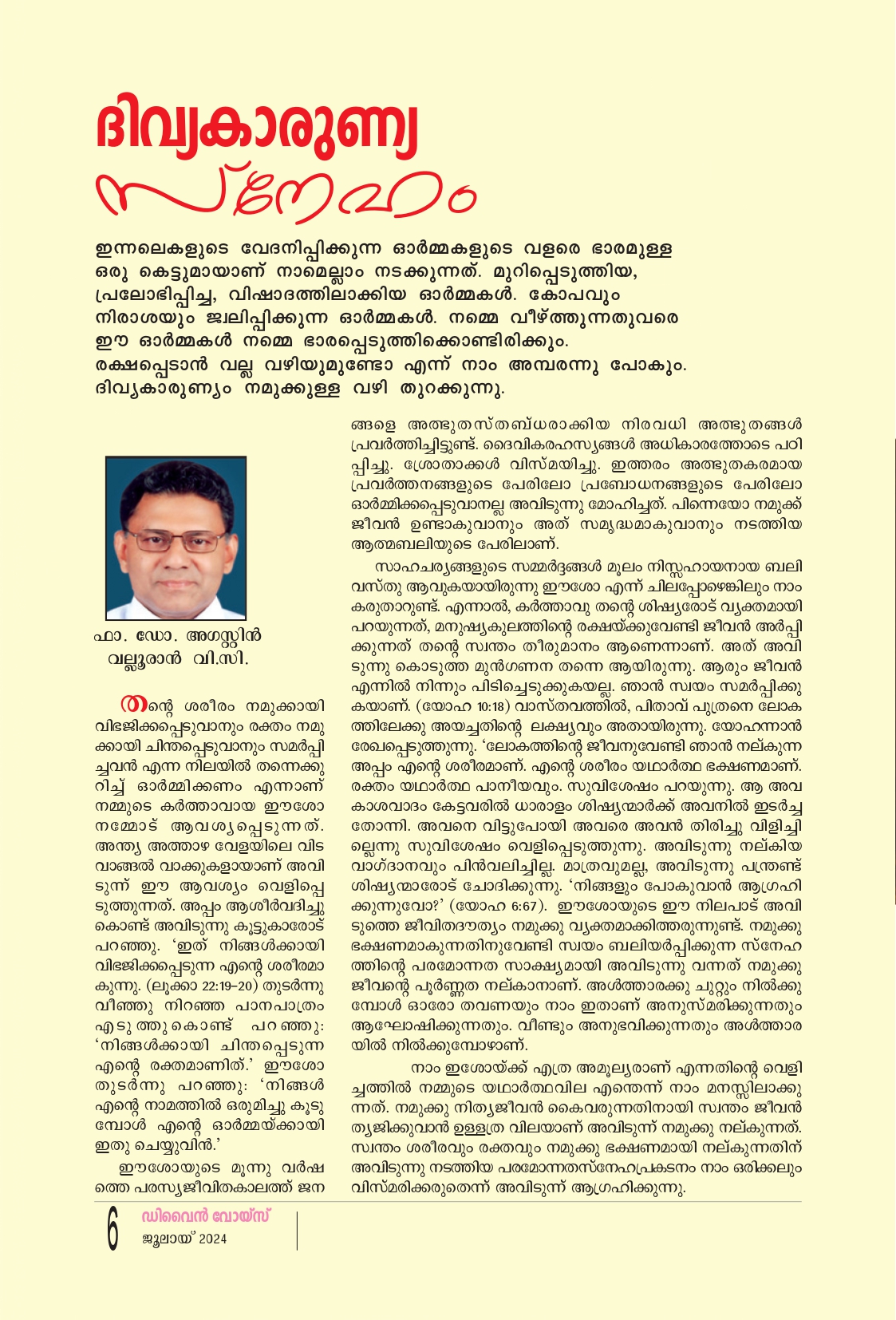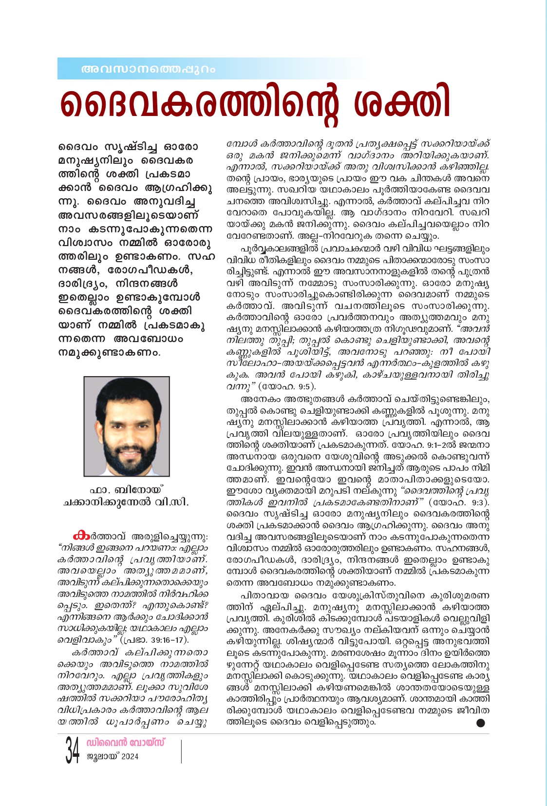 കർത്താവ് അരുളിച്ചെയ്യുന്നു; “നിങ്ങൾ ഇങ്ങനെ പറയണം: എല്ലാം കർത്താവിന്റെ പ്രവൃത്തിയാണ്. അവയെല്ലാം അത്യുത്തമമാണ്. അവിടുന്ന് കല്പിക്കുന്നതൊക്കെയും അവിടുത്തെ നാമത്തിൽ നിർവഹിക്ക പ്പെടും. ഇതെന്ത്? എന്തുകൊണ്ട്? എന്നിങ്ങനെ ആർക്കും ചോദിക്കാൻ സാധിക്കുകയില്ല; യഥാകാലം എല്ലാം വെളിവാകും" (പ്രഭാ. 39:16-17). കർത്താവ് കല്പിക്കുന്നതൊ ക്കെയും അവിടുത്തെ നാമത്തിൽ നിറവേറും. എല്ലാ പ്രവൃത്തികളും അത്യുത്തമമാണ്. ലൂക്കാ സുവിശേ ഷത്തിൽ സക്കറിയാ പൗരോഹിത്യ വിധിപ്രകാരം കർത്താവിന്റെ ആല യത്തിൽ ധൂപാർപ്പണം ചെയ്യുമ്പോൾ കർത്താവിൻ്റെ ദൂതൻ പ്രത്യക്ഷപ്പെട്ട് സക്കറിയായ്ക്ക് ഒരു മകൻ ജനിക്കുമെന്ന് വാഗ്ദാനം അറിയിക്കുകയാണ്. എന്നാൽ, സക്കറിയായ്ക്ക് അതു വിശ്വസിക്കാൻ കഴിഞ്ഞില്ല തന്റെ പ്രായം, ഭാര്യയുടെ പ്രായം ഈ വക ചിന്തകൾ അവനെ അലട്ടുന്നു. സഖറിയ യഥാകാലം പൂർത്തിയാകേണ്ട ദൈവവ ചനത്തെ അവിശ്വസിച്ചു. എന്നാൽ, കർത്താവ് കല്പിച്ചവ നിറ വേറാതെ പോവുകയില്ല. ആ വാഗ്ദാനം നിറവേറി. സഖറി യായ്ക്കു മകൻ ജനിക്കുന്നു. ദൈവം കല്പിച്ചവയെല്ലാം നിറ വേറേണ്ടതാണ്. അല്ല- നിറവേറുക തന്നെ ചെയ്യും. പൂർവ്വകാലങ്ങളിൽ പ്രവാചകന്മാർ വഴി വിവിധ ഘട്ടങ്ങളിലും വിവിധ രീതികളിലും ദൈവം നമ്മുടെ പിതാക്കന്മാരോടു സംസാ രിച്ചിട്ടുണ്ട്. എന്നാൽ ഈ അവസാനനാളുകളിൽ തന്റെ പുത്രൻ വഴി അവിടുന്ന് നമ്മോടു സംസാരിക്കുന്നു. ഓരോ മനുഷ്യ നോടും സംസാരിച്ചുകൊണ്ടിരിക്കുന്ന ദൈവമാണ് നമ്മുടെ കർത്താവ്. അവിടുന്ന് വചനത്തിലൂടെ സംസാരിക്കുന്നു. കർത്താവിന്റെ ഓരോ പ്രവർത്തനവും അത്യുത്തമവും മനു ഷ്യനു മനസ്സിലാക്കാൻ കഴിയാത്തത്ര നിഗൂഢവുമാണ്. "അവൻ നിലത്തു തുപ്പി തുപ്പൽ കൊണ്ടു ചെളിയുണ്ടാക്കി, അവന്റെ കണ്ണുകളിൽ പൂശിയിട്ട്, അവനോടു പറഞ്ഞു: നീ പോയി സീലോഹാ അയയ്ക്കപ്പെട്ടവൻ എന്നർത്ഥം-കുളത്തിൽ കഴു കുക. അവൻ പോയി കഴുകി, കാഴ്ചയുള്ളവനായി തിരിച്ചു വന്നു" (യോഹ. 9:5). അനേകം അത്ഭുതങ്ങൾ കർത്താവ് ചെയ്തിട്ടുണ്ടെങ്കിലും, തുപ്പൽ കൊണ്ടു ചെളിയുണ്ടാക്കി കണ്ണുകളിൽ പൂശുന്നു. മനു ഷ്യനു മനസ്സിലാക്കാൻ കഴിയാത്ത പ്രവൃത്തി. എന്നാൽ, ആ പ്രവൃത്തി വിലയുള്ളതാണ്, ഓരോ പ്രവൃത്തിയിലും ദൈവ ത്തിന്റെ ശക്തിയാണ് പ്രകടമാകുന്നത്. യോഹ. 9:1-2ൽ ജന്മനാ അന്ധനായ ഒരുവനെ യേശുവിൻ്റെ അടുക്കൽ കൊണ്ടുവന്ന് ചോദിക്കുന്നു. ഇവൻ അന്ധനായി ജനിച്ചത് ആരുടെ പാപം നിമി ത്തമാണ്. ഇവന്റെയോ ഇവൻ്റെ മാതാപിതാക്കളുടെയോ, ഈശോ വ്യക്തമായി മറുപടി നല്കുന്നു "ദൈവത്തിൻ്റെ പ്രവ ത്തികൾ ഇവനിൽ പ്രകടമാകേണ്ടതിനാണ്" (യോഹ. 9:3). ദൈവം സൃഷ്ടിച്ച ഓരോ മനുഷ്യനിലും ദൈവകരത്തിന്റെ ശക്തി പ്രകടമാക്കാൻ ദൈവം ആഗ്രഹിക്കുന്നു. ദൈവം അനു വദിച്ച അവസരങ്ങളിലൂടെയാണ് നാം കടന്നുപോകുന്നതെന്ന് വിശ്വാസം നമ്മിൽ ഓരോരുത്തരിലും ഉണ്ടാകണം. സഹനങ്ങൾ, രോഗ