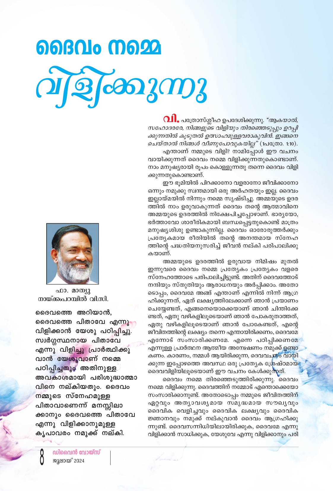 വി. പത്രോസ്ശ്ലീഹ ഉപദേശിക്കുന്നു. “ആകയാൽ, സഹോദരരേ, നിങ്ങളുടെ വിളിയും തിരഞ്ഞെടുപ്പും ഉറപ്പി ക്കുന്നതിൽ കൂടുതൽ ഉത്സാഹമുള്ളവരാകുവിൻ. ഇങ്ങനെ ചെയ്താൽ നിങ്ങൾ വീണുപോവുകയില്ല" (1പത്രോ. 1:10). എന്താണ് നമ്മുടെ വിളി? നാമിപ്പോൾ ഈ വചനം വായിക്കുന്നത് ദൈവം നമ്മെ വിളിക്കുന്നതുകൊണ്ടാണ്. നാം മനുഷ്യരായി രൂപം കൊള്ളുന്നതു തന്നെ ദൈവം വിളി ക്കുന്നതുകൊണ്ടാണ്. ഈ ഭൂമിയിൽ പിറക്കാനോ വളരാനോ ജീവിക്കാനോ ഒന്നും നമുക്കു സ്വന്തമായി ഒരു അർഹതയും ഇല്ല. ദൈവം ഇല്ലായ്മയിൽ നിന്നും നമ്മെ സൃഷ്ടിച്ചു. അമ്മയുടെ ഉദര ത്തിൽ നാം ഉരുവാകുന്നത് ദൈവം തൻ്റെ ആത്മാവിനെ അമ്മയുടെ ഉദരത്തിൽ നിക്ഷേപിച്ചപ്പോഴാണ്. ഭാര്യയോ, ഭർത്താവോ ശാരീരികമായി ബന്ധപ്പെട്ടതുകൊണ്ട് മാത്രം മനുഷ്യശിശു ഉണ്ടാകുന്നില്ല. ദൈവം ഓരോരുത്തർക്കും പ്രത്യേകമായ രീതിയിൽ തന്റെ അനന്തമായ സ്നേഹ ത്തിന്റെ പദ്ധതിയനുസരിച്ച് ജീവൻ നല്കി പരിപാലിക്കു കയാണ്. അമ്മയുടെ ഉദരത്തിൽ ഉരുവായ നിമിഷം മുതൽ ഇന്നുവരെ ദൈവം നമ്മെ പ്രത്യേകം പ്രത്യേകം വളരെ സ്നേഹത്തോടെ പരിപാലിച്ചിട്ടുണ്ട്. അതിന് ദൈവത്തോട് നന്ദിയും സ്തുതിയും ആരാധനയും അർപ്പിക്കാം. അതോ ടൊപ്പം, ദൈവമേ അങ്ങ് എന്താണ് എന്നിൽ നിന്ന് ആഗ്ര ഹിക്കുന്നത്, ഏത് ലക്ഷ്യത്തിലേക്കാണ് ഞാൻ പ്രയാണം ചെയ്യേണ്ടത്, എങ്ങനെയൊക്കെയാണ് ഞാൻ ചിന്തിക്കേ ണ്ടത്, ഏതു വഴികളിലൂടെയാണ് ഞാൻ പോകരുതാത്തത്, ഏതു വഴികളിലൂടെയാണ് ഞാൻ പോകേണ്ടത്, എന്റെ ജീവിതത്തിന്റെ ലക്ഷ്യം തന്നെ എന്തായിരിക്കണം, ദൈവമേ എന്നോട് സംസാരിക്കണമേ. എന്നെ പഠിപ്പിക്കണമേ എന്നുള്ള പ്രാർത്ഥന ആത്മീയ അന്വേഷണം നമുക്ക് ഉണ്ടാ കണം. കാരണം, നമ്മൾ ആയിരിക്കുന്ന. ദൈവവചനം വായി ക്കുന്ന ഇപ്പോഴത്തെ അവസ്ഥ ഒരു പ്രത്യേക ശ്രേഷ്ഠമായ ദൈവവിളിയിലൂടെയാണ് ഈ വചനം കേൾക്കുന്നത്.