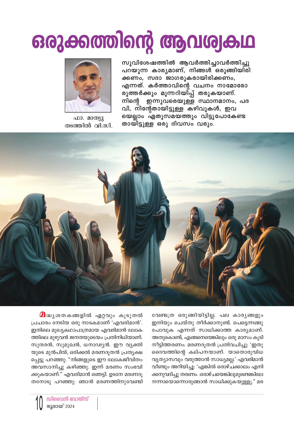 മദ്ധ്യശതകങ്ങളിൽ ഏറ്റവും കൂടുതൽ പ്രചാരം നേടിയ ഒരു നാടകമാണ് 'എവരിമാൻ'. ഇതിലെ മുഖ്യകഥാപാത്രമായ എവരിമാൻ ലോക ത്തിലെ മുഴുവൻ ജനതയുടെയം പ്രതിനിധിയാണ്. സുന്ദരൻ, സുമുഖൻ, ധനാഢ്യൻ. ഈ വ്യക്തി യുടെ മുൻപിൽ, ഒരിക്കൽ മരണദൂതൻ പ്രത്യക്ഷ പ്പെട്ടു പറഞ്ഞു: “നിങ്ങളുടെ ഈ ലോകജീവിതം അവസാനിച്ചു കഴിഞ്ഞു. ഇന്ന് മരണം സംഭവി ക്കുകയാണ്." എവരിമാൻ ഞെട്ടി. ഉടനേ മരണദു തനോടു പറഞ്ഞു: ഞാൻ മരണത്തിനുവേണ്ടി വേണ്ടത് ഒരുങ്ങിയിട്ടില്ല. പല കാര്യങ്ങളും ഇനിയും ചെയ്തു തീർക്കാനുണ്ട്. പെട്ടെന്നങ്ങു പോവുക എന്നത് സാധിക്കാത്ത കാര്യമാണ്. അതുകൊണ്ട്, എങ്ങനെയെങ്കിലും ഒരു മാസം കൂടി നീട്ടിത്തരണം. മരണദൂതൻ പ്രതിവചിച്ചു: 'ഇതു ദൈവത്തിൻ്റെ കല്പനയാണ്. യാതൊരുവിധ വ്യത്യാസവും വരുത്താൻ സാധ്യമല്ല.' എവരിമാൻ വീണ്ടും അറിയിച്ചു: 'എങ്കിൽ ഒരാഴ്ചക്കാലം എനി ക്കനുവദിച്ചു തരണം. ഒരാഴ്ചയെങ്കിലുമുണ്ടെങ്കിലേ നന്നായൊന്നൊരുങ്ങാൻ സാധിക്കുകയുള്ളൂ." മരണദൂതൻ പറഞ്ഞു: "യാതൊരു നിവൃത്തിയുമില്ല. ഒരു ദിവസം പോലും തരാൻ നിർവ്വാഹമില്ല." ഒടു വിൽ ഒരു മണിക്കൂർ സമയം അനുവദിച്ചു. ഈ ഒരു മണിക്കൂർ സമയം കൊണ്ട് എങ്ങനെ ഒരുങ്ങും? എവരിമാൻ ചിന്തിച്ചു. ഉടനെ അയാൾ അന്നുവരെ നേടിയെടുത്ത സമ്പത്ത്, അധികാരം, സ്ഥാനമാനങ്ങൾ, പദവി ഇവയുടെയൊക്കെ സമീപം ചെന്നിട്ടു പറഞ്ഞു: “എന്നെ എങ്ങനെയെ ങ്കിലും ഒന്നു സഹായിക്കണം. എന്റെ ജീവിതം അവസാനിക്കാറായി." അവ മറുപടി പറഞ്ഞു: താങ്കൾ ഒന്നു കൊണ്ടും വിഷമിക്കണ്ടാ. താങ്കളുടെ ശവസംസ്കാരം, ലോകത്തിൽ ഇന്നുവരെ ആരും ചെയ്തിട്ടില്ലാത്ത വിധം ഏറ്റവും ഭംഗിയായി ഞങ്ങൾ നടത്തിക്കൊള്ളാം. എവരിമാൻ പറഞ്ഞു: എനിക്ക് ഈ സഹായമല്ല ആവശ്യം. ഒന്നുകിൽ മരിക്കാതിരിക്കാനുള്ള സഹായം. അല്ലെങ്കിൽ മര ണശേഷമുള്ള സഹായം അവ കൈമലർത്തി. അയ്യോ! ഇക്കാര്യത്തിൽ ഞങ്ങൾക്കൊന്നും ചെയ്യാൻ സാധിക്കുകയില്ല. എവിടെയെല്ലാം സഹാ യമഭ്യർത്ഥിക്കാമോ അവിടെയെല്ലാം സഹായത്തി നായി അയാൾ ചെന്നു. എന്നാൽ, എല്ലാവരും കൈയ്യൊഴിഞ്ഞു. ഈ അവസ്ഥയിൽ, പരമദരിദ്ര നായ ഒരു മനുഷ്യൻ പറഞ്ഞു: ഞാൻ താങ്കളെ സഹായിക്കാം; മരണസമയത്തും മരണശേഷവും. എവരിമാൻ സൂക്ഷിച്ചു നോക്കി. ഇന്നുവരെ ഇയാളെ കണ്ടിട്ടില്ല. "നിങ്ങൾ ആരാണ്?" എവരി മാൻ ചോദിച്ചു. അയാൾ പറഞ്ഞു: "താങ്കളുടെ സമ്പത്തിന്റെയും അധികാരത്തിൻ്റെയും സ്ഥാനമാ നങ്ങളുടെയും കാലത്ത്, അങ്ങ് അറിയാതെ ചെയ്തുപോയ നല്ല പ്രവൃത്തികളുടെ ആകെത്തു കയാണ് ഞാൻ." ഇതുകേട്ടപ്പോൾ എവരിമാൻ ചിന്തിച്ചു. ഇഹലോകജീവിതത്തിൽ ഇതുപോ ലുള്ള ഒരു മൂന്നു സുഹൃത്തുക്കളെയെങ്കിലും സമ്പാദിച്ചിരുന്നെങ്കിൽ തൻ്റെ പരലോക ജീവിതം എത്രയോ സന്തോഷപ്രദമായിത്തീരുമായിരുന്നു