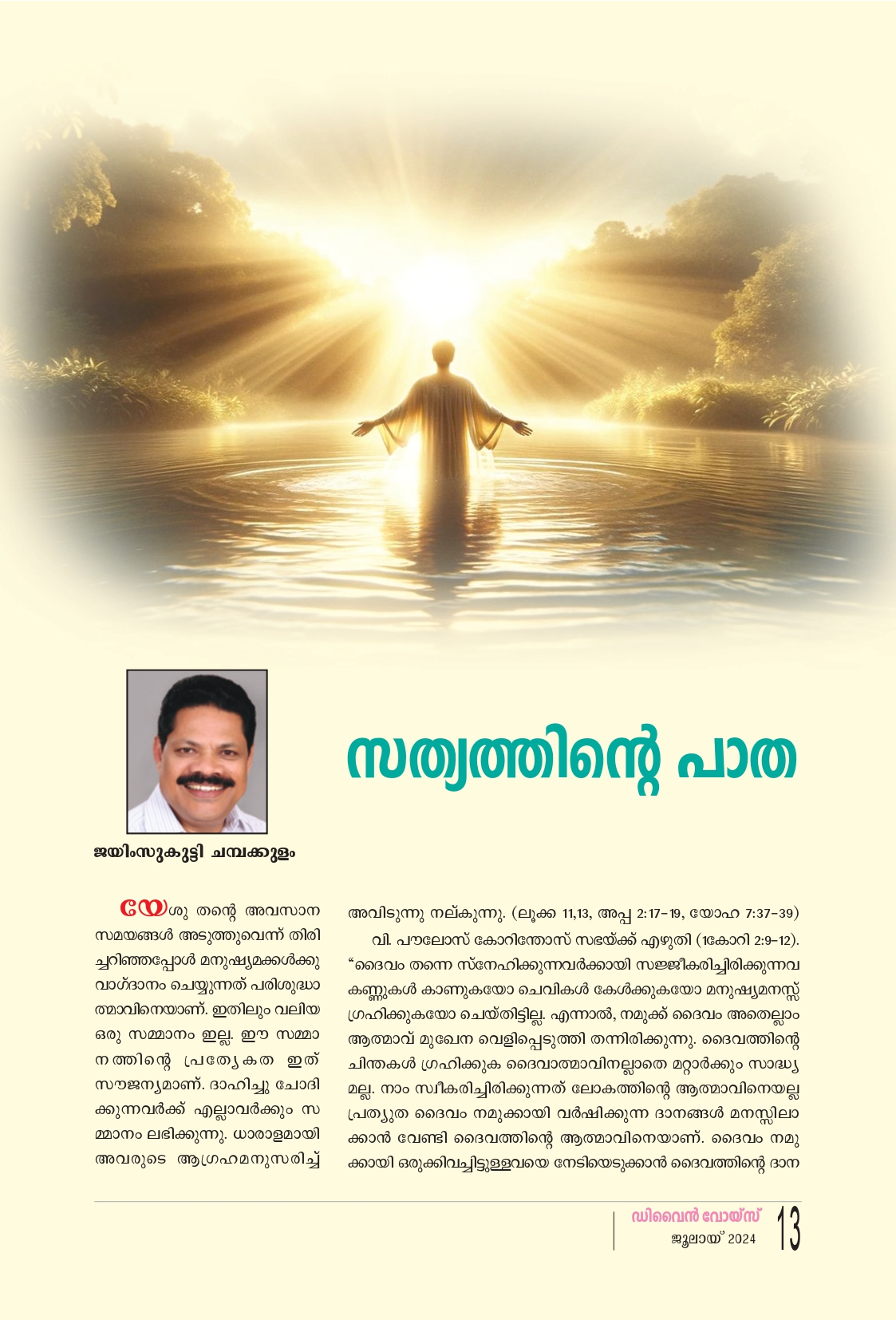 യേശു തന്റെ അവസാന സമയങ്ങൾ അടുത്തുവെന്ന് തിരി ച്ചറിഞ്ഞപ്പോൾ മനുഷ്യമക്കൾക്കു വാഗ്ദാനം ചെയ്യുന്നത് പരിശുദ്ധാ ത്മാവിനെയാണ്. ഇതിലും വലിയ ഒരു സമ്മാനം ഇല്ല. ഈ സമ്മാ നത്തിന്റെ പ്രത്യേകത ഇത് സൗജന്യമാണ്. ദാഹിച്ചു ചോദി ക്കുന്നവർക്ക് എല്ലാവർക്കും സ മ്മാനം ലഭിക്കുന്നു. ധാരാളമായി അവരുടെ ആഗ്രഹമനുസരിച്ച് അവിടുന്നു നല്കുന്നു. (ലൂക്ക 11:13, അപ്പ 2:17-19, യോഹ 7:37-39) വി. പൗലോസ് കോറിന്തോസ് സഭയ്ക്ക് എഴുതി (1കോറി 2:9-12). "ദൈവം തന്നെ സ്നേഹിക്കുന്നവർക്കായി സജ്ജീകരിച്ചിരിക്കുന്നവ കണ്ണുകൾ കാണുകയോ ചെവികൾ കേൾക്കുകയോ മനുഷ്യമനസ്സ് ഗ്രഹിക്കുകയോ ചെയ്തിട്ടില്ല. എന്നാൽ, നമുക്ക് ദൈവം അതെല്ലാം ആത്മാവ് മുഖേന വെളിപ്പെടുത്തി തന്നിരിക്കുന്നു. ദൈവത്തിന്റെ ചിന്തകൾ ഗ്രഹിക്കുക ദൈവാത്മാവിനല്ലാതെ മറ്റാർക്കും സാദ്ധ്യ മല്ല. നാം സ്വീകരിച്ചിരിക്കുന്നത് ലോകത്തിൻ്റെ ആത്മാവിനെയല്ല പ്രത്യുത ദൈവം നമുക്കായി വർഷിക്കുന്ന ദാനങ്ങൾ മനസ്സിലാ ക്കാൻ വേണ്ടി ദൈവത്തിൻ്റെ ആത്മാവിനെയാണ്. ദൈവം നമു ക്കായി ഒരുക്കിവച്ചിട്ടുള്ളവയെ നേടിയെടുക്കാൻ ദൈവത്തിന്റെ ദാനങ്ങൾ ആത്മാവ് വഴി നമുക്ക് നല്കപ്പെടുന്നു. ദൈവത്തിന്റെ പരിശുദ്ധാത്മാവ് നമ്മിൽ പ്രവർത്തിക്കുന്നത് യേശുവിൻ്റെ വചനം ഓർമ്മി പ്പിച്ചുകൊണ്ടും വ്യഖ്യാനം നല്കി അറിവ് പൂർണ്ണ മാക്കിക്കൊണ്ടുമാണ്. യേശുവിൻ്റെ വചനം ആണ് അത്ഭുതം പ്രവർത്തിക്കുന്നത്. ആ വചനത്തെ അനുസ്മരിപ്പിക്കുകയും ഏറ്റുപറയിക്കുകയും ആണ് പരിശുദ്ധാത്മാവ് എന്ന സഹായകൻ ചെയ്യു ന്നത്. അതിനാൽ, യേശു അരുൾചെയ്തു. (യോഹ 11:26, 16:13, 15:26) ഞാൻ പറഞ്ഞിട്ടുള്ളത് അവൻ അനുസ്മരിപ്പിക്കും. എന്നിൽ നിന്നു കേൾക്കുന്നതു മാത്രം അവൻ സംസാരിക്കും. അവൻ എന്നെ മഹ ത്വപ്പെടുത്തും. അവൻ എന്നെക്കുറിച്ചു സാക്ഷ്യം നല്കും. വഴിയും സത്യവും ജീവനുമായ യേശുവി ലേക്കു നമ്മെ നയിക്കുകയാണ് ആത്മാവിന്റെ പ്രഥമ ഉദ്ദേശ്യം, യേശുവിൻ്റെ ദൗത്യം പൂർത്തീക രിക്കുകയാണ് പരിശുദ്ധാത്മാവ് ചെയ്യുന്നത്. ഇതി നായി അത്ഭുതങ്ങളും അടയാളങ്ങളും യേശുവാ കുന്ന വചനത്തിൻ്റെ സഹായത്താൽ നടത്തിക്കൊ ണ്ടിരിക്കുന്നു. എഫേ 4:30ൽ വചനം ഓർമ്മിപ്പിക്കുന്നു. "രക്ഷ യുടെ ദിനത്തിനുവേണ്ടി നിങ്ങളെ മുദ്രിതരാക്കിയ ദൈവത്തിന്റെ പരിശുദ്ധാത്മാവിനെ വേദനിപ്പിക്ക രുത്. ലൂക്ക 12:10ലൂടെ യേശു അരുൾ ചെയ്തു. “മനുഷ്യപുത്രനെതിരായി സംസാരിക്കുന്നവനോട് ക്ഷമിക്കപ്പെടും. എന്നാൽ, പരിശുദ്ധാത്മാവിനെതി രായി ദൂഷണം പറയുന്നവനോട് ക്ഷമിക്കപ്പെടുക യില്ല."ഇതിലൂടെ പരിശുദ്ധാത്മാവിൻറെ പ്രാധാന്യം യേശു വെളിപ്പെടുത്തുകയാണ്. യേശുവിനെ അറിയിക്കാനും യേശു നല്കുന്ന രക്ഷ മനസ്സിലാക്കി കൊടുക്കുവാനുമായി പരിശു ദ്ധാത്മാവ് നിരന്തരം പ്രവർത്തിച്ചുകൊണ്ടിരി ക്കുന്നു. ശിമയോൻ പരിശുദ്ധാത്മാവിന്റെ പ്രേര