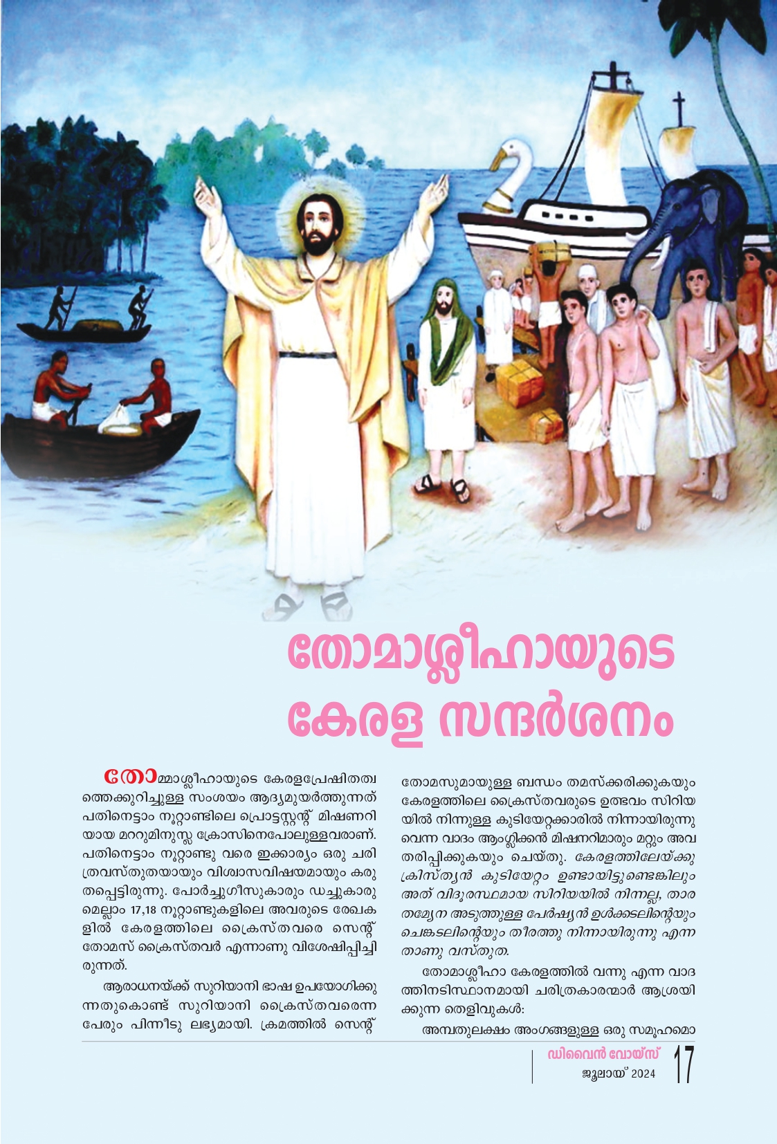 തോമ്മാശ്ലീഹായുടെ കേരളപ്രേഷിതത്വ ത്തെക്കുറിച്ചുള്ള സംശയം ആദ്യമുയർത്തുന്നത് പതിനെട്ടാം നൂറ്റാണ്ടിലെ പ്രൊട്ടസ്റ്റന്റ്റ് മിഷണറി യായ മററുമിനുസ്ല ക്രോസിനെപോലുള്ളവരാണ്. പതിനെട്ടാം നൂറ്റാണ്ടു വരെ ഇക്കാര്യം ഒരു ചരി വസ്തുതയായും വിശ്വാസവിഷയമായും കരു തപ്പെട്ടിരുന്നു. പോർച്ചുഗീസുകാരും ഡച്ചുകാരു മെല്ലാം 17,18 നൂറ്റാണ്ടുകളിലെ അവരുടെ രേഖക ളിൽ കേരളത്തിലെ ക്രൈസ്തവരെ സെൻ്റ് തോമസ് ക്രൈസ്തവർ എന്നാണു വിശേഷിപ്പിച്ചി രുന്നത്. ആരാധനയ്ക്ക് സുറിയാനി ഭാഷ ഉപയോഗിക്കു ന്നതുകൊണ്ട് സുറിയാനി ക്രൈസ്തവരെന്ന പേരും പിന്നീടു ലഭ്യമായി. ക്രമത്തിൽ സെന്റ് തോമസുമായുള്ള ബന്ധം തമസ്ക്കരിക്കുകയും കേരളത്തിലെ ക്രൈസ്തവരുടെ ഉത്ഭവം സിറിയ യിൽ നിന്നുള്ള കുടിയേറ്റക്കാരിൽ നിന്നായിരുന്നു വെന്ന വാദം ആംഗ്ലിക്കൻ മിഷനറിമാരും മറ്റും അവ തരിപ്പിക്കുകയും ചെയ്തു. കേരളത്തിലേയ്ക്കു ക്രിസ്ത്യൻ കുടിയേറ്റം ഉണ്ടായിട്ടുണ്ടെങ്കിലും അത് വിദൂരസ്ഥമായ സിറിയയിൽ നിന്നല്ല, താര തമ്യേന അടുത്തുള്ള പേർഷ്യൻ ഉൾക്കടലിന്റെയും ചെങ്കടലിന്റെയും തീരത്തു നിന്നായിരുന്നു എന്ന താണു വസ്തുത. തോമാശ്ലീഹാ കേരളത്തിൽ വന്നു എന്ന വാദ ത്തിനടിസ്ഥാനമായി ചരിത്രകാരന്മാർ ആശ്രയി ക്കുന്ന തെളിവുകൾ: അമ്പതുലക്ഷം അംഗങ്ങളുള്ള ഒരു സമൂഹമൊന്നാകെ തലമുറകളായി ഐകകണ്ഠേന ഉന്ന യിച്ചു വരുന്ന അവകാശവാദം തന്നെയാണു പ്രധാ നമായ ഒരു തെളിവ്. തോമാശ്ലീഹായുമായി യാതൊരു ബന്ധവും ഈ സമൂഹത്തിനില്ലെങ്കിൽ പിന്നെങ്ങനെയാണ് ആ നാമം ഈ സമൂഹത്തിൻ്റെ സംഘാതമായ ഓർമ്മയിലേക്കും ബോധത്തി ലേക്കും വരുന്നത്? എന്തുകൊണ്ടാണ് അവർ തങ്ങ ളുടെ ഉത്ഭവം തോമാശ്ലീഹായുടെ പ്രേഷിതത്വ ത്തിൽ നിന്നാണ് എന്നു തലമുറകളായി വിശ്വ സിച്ചു വരുന്നത്? എന്തെങ്കിലും തരത്തിലുള്ള സോഷ്യൽ എൻജിനീയറിംഗിൻ്റെ ഫലമായാണ് ഈ അവബോധം ഈ സമൂഹത്തിലുണ്ടായതെ ങ്കിൽ എന്തുകൊണ്ട് മറ്റ് അപ്പസ്തോലന്മാരെ യെല്ലാം മാറ്റി നിറുത്തി കൃത്യമായി തോമാശ്ലീഹാ യുടെ പേരു മാത്രം പറയുന്നു? ഒരു ജനസമൂഹ ത്തിന്റെ സംഘാതമായ ഓർമ്മയിലും ബോധ ത്തിലും സത്യത്തിന്റെ കണികകളുണ്ടാകാമെന്ന താണു വസ്തുത. പരമ്പരാഗതമട്ടിലുള്ള മറ്റു വിശ്വ സനീയ വിവരസ്രോതസ്സുകളില്ലെങ്കിൽ ചരിത്രപ രമായ വിവരാന്വേഷണങ്ങൾക്ക് ഒരു ജനതയേയും അവരുടെ സമൂഹമനസ്സിലെ വിവരങ്ങളെയും ആശ്രയിക്കാവുന്നതാണ്. സമൂഹത്തിൽ അധികാ രവും സ്വാധീനവുമുള്ള വിഭാഗങ്ങൾ ലിഖിത ചരിത്ര സ്രോതസ്സുകളിൽ തങ്ങളുടെ സാന്നി ദ്ധ്യവും പ്രാമുഖ്യവും രേഖപ്പെടുത്തപ്പെടുവാൻ ശ്രമിക്കും.