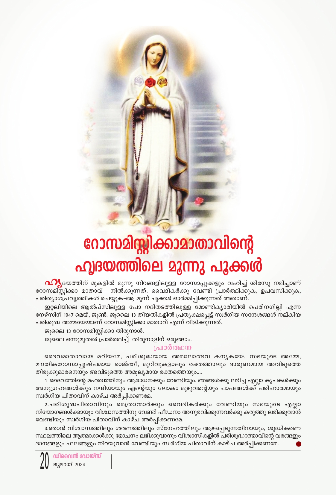 ഹൃദയത്തിന് മുകളിൽ മൂന്നു നിറങ്ങളിലുള്ള റോസാപ്പൂക്കളും വഹിച്ച് ശിരസു നമിച്ചാണ് റോസമിസ്റ്റിക്കാ മാതാവ് നിൽക്കുന്നത്. വൈദികർക്കു വേണ്ടി പ്രാർത്ഥിക്കുക, ഉപവസിക്കുക. പരിത്യാഗപ്രവൃത്തികൾ ചെയ്യുക-ആ മൂന്ന് പൂക്കൾ ഓർമ്മിപ്പിക്കുന്നത് അതാണ്. ഇറ്റലിയിലെ ആൽപ്സിലുള്ള പോ നദിതടത്തിലുള്ള മോണ്ടിക്യാരിയിൽ പെരിനഗില്ലി എന്ന നേഴ്സിന് 1947 മെയ്, ജൂൺ, ജൂലൈ 13 തിയതികളിൽ പ്രത്യക്ഷപ്പെട്ട് സ്വർഗിയ സന്ദേശങ്ങൾ നല്കിയ പരിശുദ്ധ അമ്മയെയാണ് റോസമിസ്റ്റിക്കാ മാതാവ് എന്ന് വിളിക്കുന്നത്. ജൂലൈ 13 റോസമിസ്റ്റിക്കാ തിരുനാൾ. ജൂലൈ ഒന്നുമുതൽ പ്രാർത്ഥിച്ച് തിരുനാളിന് ഒരുങ്ങാം. പ്രാർത്ഥന ദൈവമാതാവായ മറിയമേ, പരിശുദ്ധയായ അമലോത്ഭവ കന്യകയേ, സഭയുടെ അമ്മേ, മൗതികറോസാപ്പുഷ്പമായ രാജ്ഞി, മുറിവുകളാലും രക്തത്താലും ദാരുണമായ അവിടുത്തെ തിരുക്കുമാരനെയും അവിടുത്തെ അമൂല്യമായ രക്തത്തെയും.... 1 ദൈവത്തിന്റെ മഹത്വത്തിനും ആരാധനക്കും വേണ്ടിയും, ഞങ്ങൾക്കു ലഭിച്ച എല്ലാ കൃപകൾക്കും അനുഗ്രഹങ്ങൾക്കും നന്ദിയായും എൻ്റെയും ലോകം മുഴുവൻ്റെയും പാപങ്ങൾക്ക് പരിഹാരമായും സ്വർഗിയ പിതാവിന് കാഴ്ച അർപ്പിക്കണമേ. 2.പരിശുദ്ധപിതാവിനും മെത്രാന്മാർക്കും വൈദികർക്കും വേണ്ടിയും സഭയുടെ എല്ലാ നിയോഗങ്ങൾക്കായും വിശ്വാസത്തിനു വേണ്ടി പീഡനം അനുഭവിക്കുന്നവർക്കു കരുത്തു ലഭിക്കുവാൻ വേണ്ടിയും സ്വർഗിയ പിതാവിന് കാഴ്ച അർപ്പിക്കണമേ. 3.ഞാൻ വിശ്വാസത്തിലും ശരണത്തിലും സ്നേഹത്തിലും ആഴപ്പെടുന്നതിനായും, ശുദ്ധീകരണ സ്ഥലത്തിലെ ആത്മാക്കൾക്കു മോചനം ലഭിക്കുവാനും വിശ്വാസികളിൽ പരിശുദ്ധാത്മാവിൻ്റെ വരങ്ങളും ദാനങ്ങളും ഫലങ്ങളും നിറയുവാൻ വേണ്ടിയും സ്വർഗിയ പിതാവിന് കാഴ്ച അർപ്പിക്കണമേ.