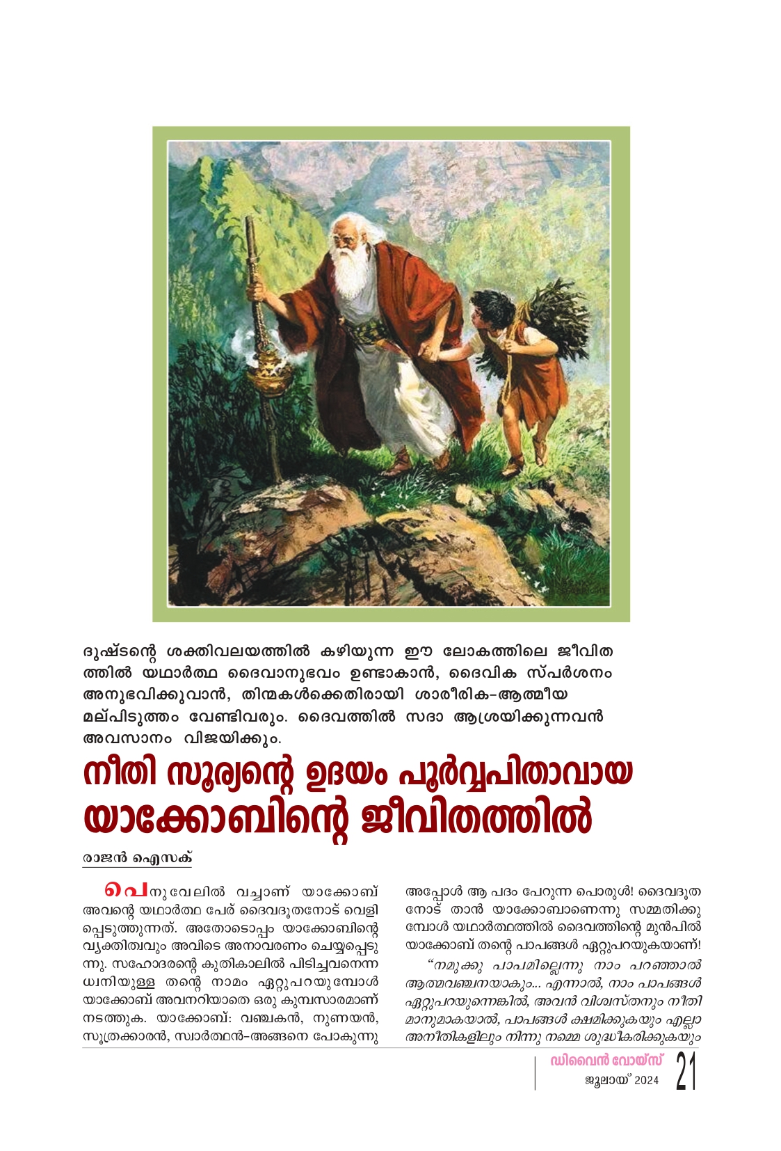പെനുവേലിൽ വച്ചാണ് യാക്കോബ് അവന്റെ യഥാർത്ഥ പേര് ദൈവദൂതനോട് വെളി പ്പെടുത്തുന്നത്. അതോടൊപ്പം യാക്കോബിന്റെ വ്യക്തിത്വവും അവിടെ അനാവരണം ചെയ്യപ്പെടു ന്നു. സഹോദരൻ്റെ കുതികാലിൽ പിടിച്ചവനെന്ന ധ്വനിയുള്ള തൻ്റെ നാമം ഏറ്റുപറയുമ്പോൾ യാക്കോബ് അവനറിയാതെ ഒരു കുമ്പസാരമാണ് നടത്തുക. യാക്കോബ്: വഞ്ചകൻ, നുണയൻ, സൂത്രക്കാരൻ, സ്വാർത്ഥൻ-അങ്ങനെ പോകുന്നു അപ്പോൾ ആ പദം പേറുന്ന പൊരുൾ! ദൈവദൂത നോട് താൻ യാക്കോബാണെന്നു സമ്മതിക്കു മ്പോൾ യഥാർത്ഥത്തിൽ ദൈവത്തിന്റെ മുൻപിൽ യാക്കോബ് തന്റെ പാപങ്ങൾ ഏറ്റുപറയുകയാണ് “നമുക്കു പാപമില്ലെന്നു നാം പറഞ്ഞാൽ ആത്മവഞ്ചനയാകും... എന്നാൽ, നാം പാപങ്ങൾ ഏറ്റുപറയുന്നെങ്കിൽ, അവൻ വിശ്വസ്തനും നീതി മാനുമാകയാൽ, പാപങ്ങൾ ക്ഷമിക്കുകയും എല്ലാ അനീതികളിലും നിന്നു നമ്മെ ശുദ്ധീകരിക്കുകയും ചെയ്യും" (1യോഹ. 1:8-9). യാക്കോബ് തന്റെ പേര് വെളിപ്പെടുത്തുമ്പോൾ താൻ ഒരു കാലത്ത് ആരായിരുന്നെന്നും എങ്ങനെ യുള്ള ആളായിരുന്നെന്നും ദൈവതിരുസന്നിധി യിൽ എളിമയോടെ സമ്മതിക്കുകയാണ്. ദൈവം തന്റെ ദൂതനിലൂടെ ഒരു പുതിയ പേരും അതുവഴി ഒരു പുതിയ വ്യക്തിത്വവും യാക്കോബിനപ്പോൾ നല്കുന്നു! "ഇനിമേൽ നീ യാക്കോബ് എന്നല്ല, ഇസ്രായേൽ എന്നു വിളിക്കപ്പെടും" (ഉല്പ 32:28). “നീ ആരാണ് മകനേ എന്ന് അവൻ ചോദിച്ചു. യാക്കോബ് മറുപടി പറഞ്ഞു: അങ്ങയുടെ കടി ഞ്ഞൂൽ പുത്രൻ ഏസാവാണ് ഞാൻ" (ഉല്പ. 27:17 -19). ഏസാവാണെന്നു കരുതി യാക്കോബിനെ അനുഗ്രഹിച്ചതിനു ശേഷം സംശയനിവാരണ ത്തിന്, വാർദ്ധക്യം മൂലം അന്ധനായിരുന്ന ഇസ ഹാക്ക് വീണ്ടും ഉന്നയിക്കുന്ന ഹൃദയഭേദകമായ ഒരു ചോദ്യമുണ്ട്: "സത്യമായും നീ എന്റെ മകൻ ഏസാവു തന്നെയാണോ? ഒരു കൂസലും കൂടാതെ യാക്കോബപ്പോൾ പിതാവിനു കൊടുക്കുന്ന മറു പടി ശ്രദ്ധിക്കുക: "അതേ" എന്നവൻ മറുപടി പറഞ്ഞു. ഏസാ വിനു കിട്ടേണ്ട അനുഗ്രഹം അതിവിദഗ്ധമായി അപ്പനെ കബളിപ്പിച്ചെടുക്കുന്നതിനു തൊട്ടുമുമ്പ് ചേട്ടൻ ഏസാവിൻ്റെ കടിഞ്ഞൂൽ അവകാശം വളരെ തന്ത്രപൂർവ്വം ഒരു പാത്രം പയറുപായസം കൊണ്ട് തട്ടിയെടുക്കാനും യാക്കോബിന് കഴി ഞ്ഞു. തന്റെ സഹോദരനെയും അതിലുപരി പിതാ വിനെയും കബളിപ്പിക്കുകയും വഞ്ചിക്കുകയും ചെയ്തപ്പോൾ യാക്കോബിൻ്റെ ജീവിതത്തിൽ സൂര്യൻ സാവകാശം അസ്തമിക്കുകയായിരുന്നു. ദുരിതങ്ങൾ ഒന്നിനു പിറകെ മറ്റൊന്നായി യാക്കോബിനെ വേട്ടയാടി. യാക്കോബിന്റെ ജീവി തത്തിൽ പീഡനങ്ങൾ സാധാരണമായിത്തീർന്നു. മനഃസമാധാനം ഒരു മരീചികയായി, യാക്കോബ് വിവിധ കഷ്ടതകളിലൂടെയും പീഡനങ്ങളിലു ടെയും കടന്നു പോകുന്നു. എന്നാലവയെല്ലാം ദൈവഹിതപ്രകാരമുള്ള ദുഃഖങ്ങളായി. തന്മൂലം രക്ഷാകരമായ പശ്ചാത്താപമാണ് യാക്കോബിൽ രൂപം കൊള്ളുക. ഭാര്യാപിതാവായ ലാബാനെ യാക്കോബിന്റെ മാനസാന്തരത്തിനും വിശുദ്ധീക രണത്തിനുമായി ദൈവം ഉപയോഗിക്കുന്നുണ്ട്. അവിടുന്ന് താൻ സ്ന