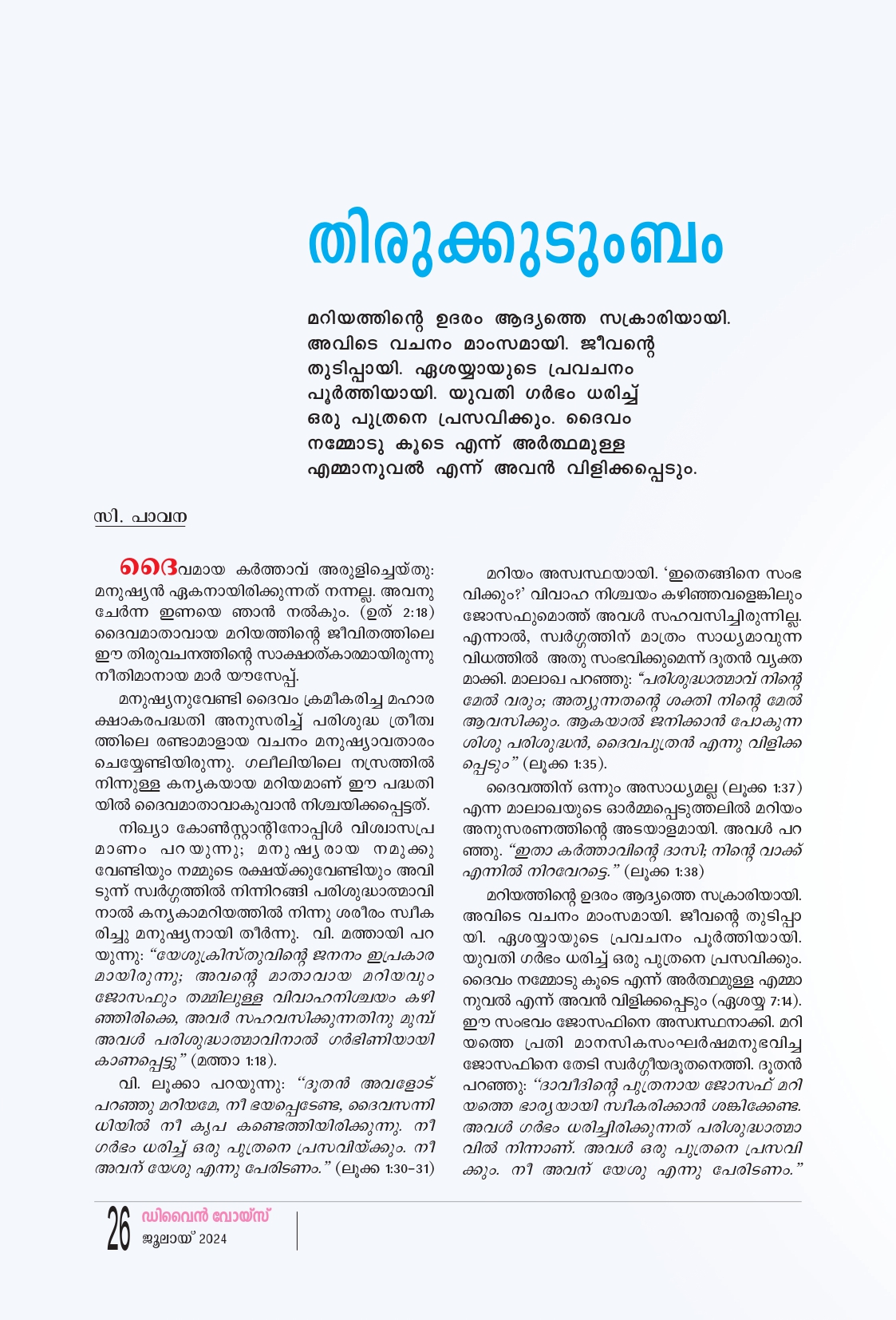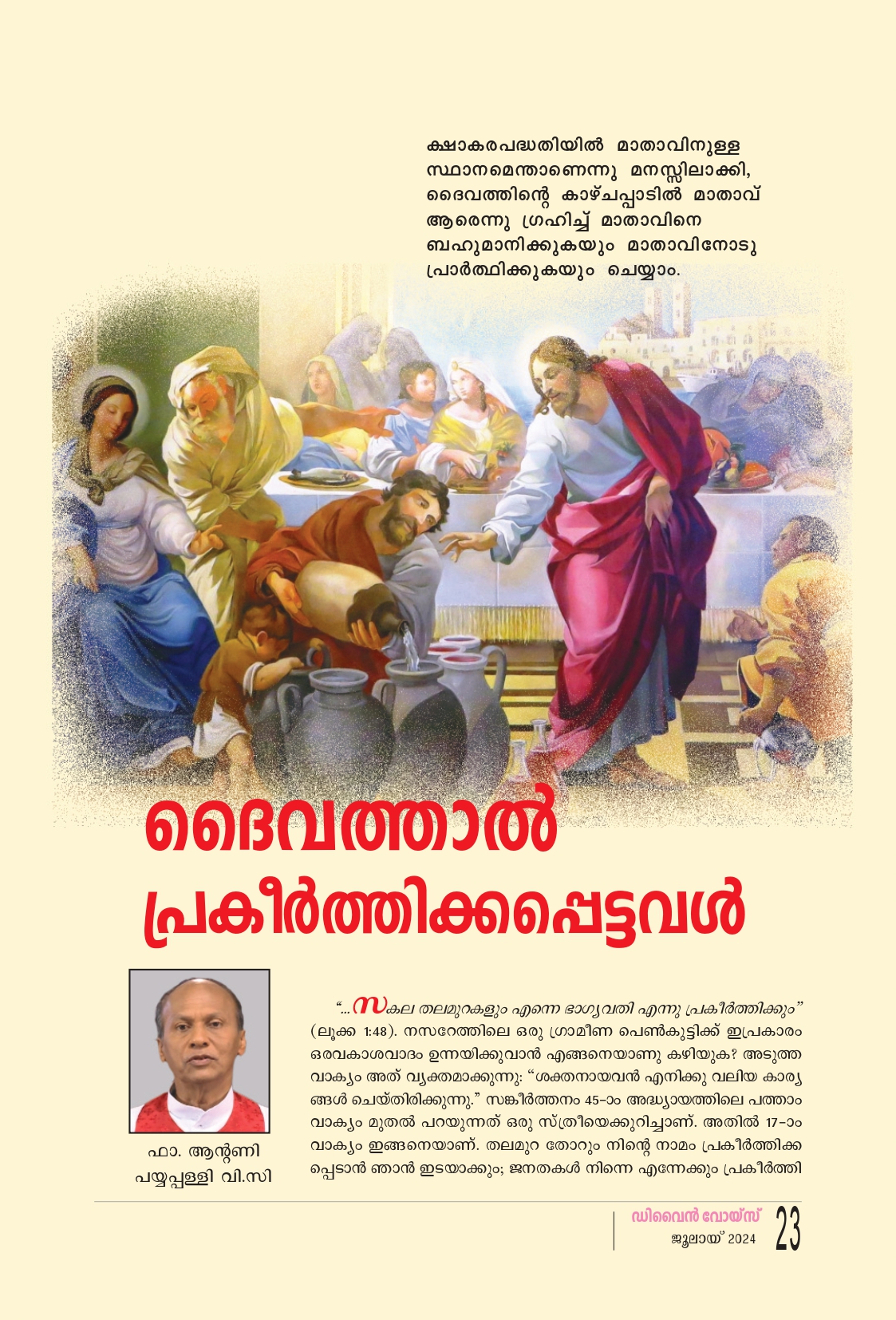 * സകല തലമുറകളും എന്നെ ഭാഗ്യവതി എന്നു പ്രകീർത്തിക്കും" (ലൂക്ക 1:48), നസറേത്തിലെ ഒരു ഗ്രാമീണ പെൺകുട്ടിക്ക് ഇപ്രകാരം ഒരവകാശവാദം ഉന്നയിക്കുവാൻ എങ്ങനെയാണു കഴിയുക? അടുത്ത വാക്യം അത് വ്യക്തമാക്കുന്നു: "ശക്തനായവൻ എനിക്കു വലിയ കാര്യ ങ്ങൾ ചെയ്തിരിക്കുന്നു." സങ്കീർത്തനം 45-ാം അദ്ധ്യായത്തിലെ പത്താം വാക്യം മുതൽ പറയുന്നത് ഒരു സ്ത്രീയെക്കുറിച്ചാണ്. അതിൽ 17-ാം വാക്യം ഇങ്ങനെയാണ്. തലമുറ തോറും നിൻ്റെ നാമം പ്രകീർത്തിക്ക പ്പെടാൻ ഞാൻ ഇടയാക്കും; ജനതകൾ നിന്നെ എന്നേക്കും പ്രകീർത്തിക്കും. ഏശയ്യാ പ്രവാചകൻ്റെ മറ്റൊരു പ്രവചനം: “നിന്റെ സ്രഷ്ടാവാണ് നിൻ്റെ ഭർത്താവ്. സൈന്യ ങ്ങളുടെ കർത്താവ് എന്നാണ് അവിടുത്തെ നാമം. ഇസ്രായേലിന്റെ പരിശുദ്ധനാണ് നിന്റെ വിമോച കൻ. ഭൂമി മുഴുവന്റെയും ദൈവം എന്ന് അവിടുന്ന് വിളിക്കപ്പെടുന്നു" (ഏശ. 54:5). എല്ലാ തലമുറകളും മാതാവ് അനുഗൃഹീതയാ ണെന്നു പ്രകീർത്തിക്കണം എന്നുള്ളത് ദൈവനി ശ്ചയമാണെങ്കിൽ ഈ തലമുറയും അപ്രകാരം പ്രവർത്തിച്ചല്ലേ പറ്റൂ. അവിടെയാണ് മാതാവിനെ ക്കുറിച്ചുള്ള കാഴ്ചപ്പാട് ശരിയായ ദിശയിലാവേ ണ്ടത്. മാതാവിനു രക്ഷാകരദൗത്യത്തിലുള്ള സ്ഥാനം മനസ്സിലാക്കണമെങ്കിൽ ഉത്പത്തി രണ്ടാം അധ്യായം 17-ാം വാക്യത്തിലേക്കു പോകണം. “എന്നാൽ, നന്മതിന്മകളെക്കുറിച്ചുള്ള അറിവിൻ്റെ വൃക്ഷത്തിലെ ഫലം നീ തിന്നരുത്; അതു തിന്നുന്ന ദിവസം നീ മരിക്കും" (ഉത്പത്തി 2:17). തന്റെ ഛായയിലും സാദൃശ്യത്തിലും സൃഷ്ടിച്ച ആദിമനുഷ്യനോട് ദൈവം പറഞ്ഞതാണിത്. ദൈവം പറഞ്ഞത് അനുസരിച്ചിരുന്നുവെങ്കിൽ ആദം മരിക്കുകയില്ലായിരുന്നു. ഇതിൽ നിന്നു നാം മനസ്സിലാക്കേണ്ടത്, ദൈവം മനുഷ്യനെ സൃഷ്ടി ച്ചത് നിത്യജീവനുവേണ്ടിയായിരുന്നു എന്നതാണ്. കൊല്ലാൻ വേണ്ടി ആരെങ്കിലും സന്തതികളെ ജനി പ്പിക്കുമോ, ദൈവം മരണത്തെ സൃഷ്ടിച്ചില്ല എന്ന് ജ്ഞാനത്തിൻ്റെ പുസ്തകം ഒന്നാമധ്യായം 13-ാം വാക്യം വ്യക്തമാക്കുന്നു. പിന്നെ എവിടെ നിന്നാണ് മരണം വന്നത്? മരണം പാപത്തിൻ്റെ ശമ്പളമാണ്. ആദം പാപം ചെയ്തു. അപ്പോൾ നിത്യജീവൻ നഷ്ടപ്പെട്ടു. നിത്യജീവൻ നഷ്ടപ്പെട്ട ആദത്തെ എന്നെന്നേക്കുമായി തള്ളിക്കളയുവാൻ ദൈവത്തിനു മനസ്സു വന്നില്ല. കാരുണ്യവാനായ അവിടുന്ന് ഒരു രക്ഷകനെ വാഗ്ദാനം ചെയ്തു. ആ വാഗ്ദാനം പൂർത്തിയാകുന്നത് യോഹന്നാൻ 3:16-ൽ കാണാം. "എന്തെന്നാൽ. അവനിൽ വിശ്വ സിക്കുന്ന ഏവനും നശിച്ചു പോകാതെ നിത്യജീ വൻ പ്രാപിക്കുന്നതിനു വേണ്ടി തന്റെ ഏകജാ തന്നെ നല്കാൻ തക്കവിധം ദൈവം ലോകത്തെഅത്രമാത്രം സ്നേഹിച്ചു."