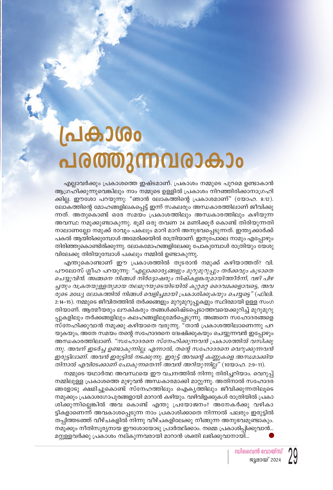 എല്ലാവർക്കും പ്രകാശത്തെ ഇഷ്ടമാണ്. പ്രകാശം നമ്മുടെ പുറമെ ഉണ്ടാകാൻ ആഗ്രഹിക്കുന്നുവെങ്കിലും നാം നമ്മുടെ ഉള്ളിൽ പ്രകാശം നിറഞ്ഞിരിക്കാനാഗ്രഹി ക്കില്ല. ഈശോ പറയുന്നു: “ഞാൻ ലോകത്തിന്റെ പ്രകാശമാണ്” (യോഹ. 8:12). ലോകത്തിന്റെ മോഹങ്ങളിലകപ്പെട്ട് ഇന്ന് സകലരും അന്ധകാരത്തിലാണ് ജീവിക്കു ന്നത്. അതുകൊണ്ട് ഒരേ സമയം പ്രകാശത്തിലും അന്ധകാരത്തിലും കഴിയുന്ന അവസ്ഥ നമുക്കുണ്ടാകുന്നു. ഭൂമി ഒരു തവണ 24 മണിക്കൂർ കൊണ്ട് തിരിയുന്നതി നാലാണല്ലോ നമുക്ക് രാവും പകലും മാറി മാറി അനുഭവപ്പെടുന്നത്. ഇന്ത്യക്കാർക്ക് പകൽ ആയിരിക്കുമ്പോൾ അമേരിക്കയിൽ രാത്രിയാണ്. ഇതുപോലെ നാമും എപ്പോഴും തിരിഞ്ഞുകൊണ്ടിരിക്കുന്നു. ലോകമോഹങ്ങളിലേക്കു പോകുമ്പോൾ രാത്രിയും യേശു വിലേക്കു തിരിയുമ്പോൾ പകലും നമ്മിൽ ഉണ്ടാകുന്നു. എന്തുകൊണ്ടാണ് ഈ പ്രകാശത്തിൽ തുടരാൻ നമുക്ക് കഴിയാത്തത്? വി. പൗലോസ് ശ്ലീഹ പറയുന്നു: "എല്ലാക്കാര്യങ്ങളും മുറുമുറുപ്പും തർക്കവും കൂടാതെ ചെയ്യുവിൻ. അങ്ങനെ നിങ്ങൾ നിർദ്ദോഷരും നിഷ്കളങ്കരുമായിത്തീർന്ന്, വഴി പിഴ ച്ചതും വക്രതയുള്ളതുമായ തലമുറയുടെയിടയിൽ കുറ്റമറ്റ ദൈവമക്കളാവട്ടെ, അവ രുടെ മധ്യേ ലോകത്തിൽ നിങ്ങൾ വെളിച്ചമായി പ്രകാശിക്കുകയും ചെയ്യട്ടെ" (ഫിലി. 2:11-15). നമ്മുടെ ജീവിതത്തിൽ തർക്കങ്ങളും മുറുമുറുപ്പുകളും സ്ഥിരമായി ഉള്ള സംഗ തിയാണ്. ആത്മീയരും ലൗകികരും തങ്ങൾക്കിഷ്ടപ്പെടാത്തവയെക്കുറിച്ച് മുറുമുറു പ്പുകളിലും തർക്കങ്ങളിലും കലഹങ്ങളിലുമേർപ്പെടുന്നു. അങ്ങനെ സഹോദരങ്ങളെ സ്നേഹിക്കുവാൻ നമുക്കു കഴിയാതെ വരുന്നു. "താൻ പ്രകാശത്തിലാണെന്നു പറ യുകയും, അതേ സമയം തൻ്റെ സഹോദരനെ ദ്വേഷിക്കുകയും ചെയ്യുന്നവൻ ഇപ്പോഴും അന്ധകാരത്തിലാണ്. “സഹോദരനെ സ്നേഹിക്കുന്നവൻ പ്രകാശത്തിൽ വസിക്കു ന്നു. അവന് ഇടർച്ച ഉണ്ടാകുന്നില്ല. എന്നാൽ, തൻ്റെ സഹോദരനെ വെറുക്കുന്നവൻ ഇരുട്ടിലാണ്. അവൻ ഇരുട്ടിൽ നടക്കുന്നു. ഇരുട്ട് അവൻ്റെ കണ്ണുകളെ അന്ധമാക്കിയ തിനാൽ എവിടേക്കാണ് പോകുന്നതെന്ന് അവൻ അറിയുന്നില്ല് (1യോഹ. 2:9-11). നമ്മുടെ യഥാർത്ഥ അവസ്ഥയെ ഈ വചനത്തിൽ നിന്നു തിരിച്ചറിയാം. വെറുപ്പ് നമ്മിലുള്ള പ്രകാശത്തെ മുഴുവൻ അന്ധകാരമാക്കി മാറ്റുന്നു. അതിനാൽ സഹോദര ങ്ങളോടു ക്ഷമിച്ചുകൊണ്ട് സ്നേഹത്തിലും ഐക്യത്തിലും ജീവിക്കുന്നതിലൂടെ നമുക്കും പ്രകാശഗോപുരങ്ങളായി മാറാൻ കഴിയും, വഴിവിളക്കുകൾ രാത്രിയിൽ പ്രകാ ശിക്കുന്നില്ലെങ്കിൽ അവ കൊണ്ട് എന്തു പ്രയോജനം? അനേകർക്കു വഴികാ ട്ടികളാണെന്ന് അവകാശപ്പെടുന്ന നാം പ്രകാശിക്കാതെ നിന്നാൽ പലരും ഇരുട്ടിൽ തപ്പിത്തടഞ്ഞ് വീഴ്ചകളിൽ നിന്നു വീഴ്ചകളിലേക്കു നീങ്ങുന്ന അനുഭവമുണ്ടാകും. നമുക്കും നീതിസൂര്യനായ ഈശോയോടു പ്രാർത്ഥിക്കാം. നമ്മെ പ്രകാശിപ്പിക്കുവാൻ... മറ്റുള്ളവർക്കു പ്