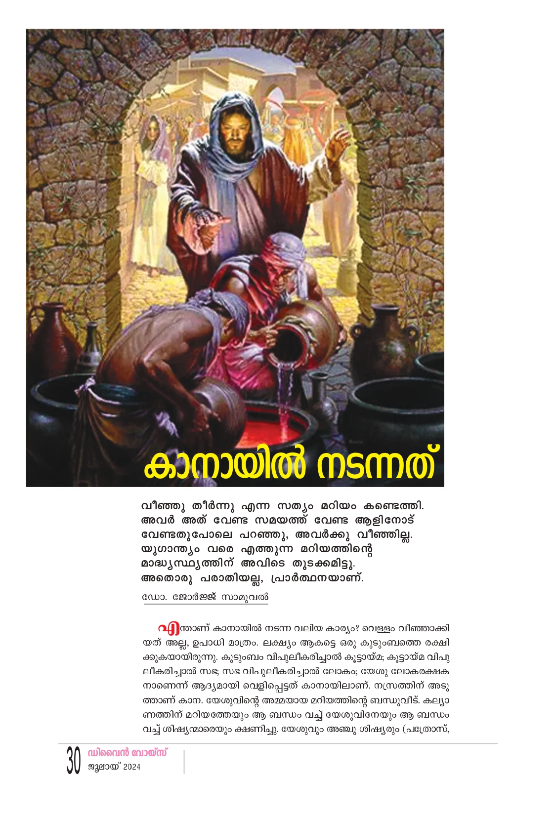 എന്താണ് കാനായിൽ നടന്ന വലിയ കാര്യം? വെള്ളം വീഞ്ഞാക്കി യത് അല്ല, ഉപാധി മാത്രം ലക്ഷ്യം ആകട്ടെ ഒരു കുടുംബത്തെ രക്ഷി ക്കുകയായിരുന്നു. കുടുംബം വിപുലീകരിച്ചാൽ കൂട്ടായ്മ; കൂട്ടായ്മ വിപു ലീകരിച്ചാൽ സഭ, സഭ വിപുലീകരിച്ചാൽ ലോകം; യേശു ലോകരക്ഷക നാണെന്ന് ആദ്യമായി വെളിപ്പെട്ടത് കാനായിലാണ്. നസ്രത്തിന് അടു ത്താണ് കാന. യേശുവിൻ്റെ അമ്മയായ മറിയത്തിൻ്റെ ബന്ധുവീട്. കല്യാ ണത്തിന് മറിയത്തേയും ആ ബന്ധം വച്ച് യേശുവിനേയും ആ ബന്ധം വച്ച് ശിഷ്യന്മാരെയും ക്ഷണിച്ചു. യേശുവും അഞ്ചു ശിഷ്യരും (പത്രോസ്.അന്ത്രയോസ്, യാക്കോബ്, യോഹന്നാൻ, പീലി പ്പോസ്) കല്യാണ വീട്ടിലെത്തി. യോഹന്നാന്റെ തന്നെ കല്യാണമായിരുന്നു അത് എന്നു കരുതു ന്നവരും ഉണ്ട്. വാസ്തവത്തിൽ അതു വെറുമൊരു കല്യാണസദ്യയല്ല. യുഗാന്ത്യവിരുന്നിനെയാണ് കുറിക്കുന്നത്. യേശു തനിക്കുള്ളവരെ നിത്യപിതാ വിനു സമർപ്പിക്കുന്ന ആഘോഷം, ആ അവസര ത്തിനുള്ള ഒരുക്കമാണ് അവിടെ അരങ്ങേറിയത്. ശുചീകരണത്തിനുള്ള ആറു കൽഭരണികൾ നിയ മത്തിന്റെ അപൂർണ്ണതയെ കുറിക്കുന്നു. അപൂർണ്ണ മായ നിമയം പൂർണ്ണമായ കൃപയ്ക്കു വഴിമാറുന്നു. ആ സ്ഥലം ഇന്നൊരു ദേവാലയമാണ്. കുഴിച്ചെ ടുത്ത ഒരു കൽഭരണിയും അവിടെക്കാണാം. ആറു കൽഭരണികൾ ഭൗതികമായി ഒന്നുമല്ല. വെറും പാത്രങ്ങൾ. ഭൗതികമായി അവ ഉൾക്കൊ ള്ളുന്നതാകട്ടെ ശുചീകരണത്തിനുള്ള ജലം. ആ ജലം ജീവദായകനായ യേശുവിന്റെ സാന്നിദ്ധ്യ ത്തിൽ വീര്യമുള്ള വീഞ്ഞായി മാറി. ഒരു തര ത്തിൽ പറഞ്ഞാൽ ആറു ഭരണികൾ ഒരാൾ സാധാ രണയായി സ്വീകരിക്കുന്ന ആറു കൂദാശകൾ ആയി കരുതാം. കൂദാശകൾ ബാഹ്യമായി ഒന്നുമല്ല. ജ്ഞാനസ്നാനത്തിനു വേണ്ടത് അല്പം വെള്ളം. കുർബാനയ്ക്കു വേണ്ടത് അല്പം അപ്പക്കഷണം. കുമ്പസാരത്തിനു വേണ്ടത് ഒരു പറച്ചിൽ. എന്നാൽ, ജീവദായകനായ യേശു അവ ആത്മീയ വീര്യമുള്ള വരപ്രസാദമാക്കി മാറ്റാനുള്ള ഉപാധി യാക്കി തീർക്കുന്നു. അങ്ങനെ തിന്മയുടെ സംഖ്യ യായ ആറ് നന്മയുടെ പ്രതീകമായി യേശു മാറ്റുന്നു. ആറ് അതിൽത്തന്നെ അപൂർണ്ണമാണ്. എന്നാൽ, ആറിനോടു കൂടി യേശു ആകുന്ന ഒന്നു കൂടി ചേരുമ്പോൾ അത് പൂർണ്ണതയുടെ നിത്യജീ വന്റെ അടയാളമായി മാറുന്നു. ഭരണിയിലെ വെള്ളം വിവാഹമെന്ന സാമൂഹിക ഉടമ്പടിയെ കുറിക്കുന്നു. ഭരണിയിലെ വീഞ്ഞാകട്ടെ, വരപ്ര സാദദായകമായ വിവാഹം എന്ന കൂദാശയെ കുറി ക്കുന്നു. യേശു ഉണ്ടെങ്കിലേ വിവാഹത്തിന് ആദ്ധ്യാത്മികതയുടെ ലഹരി ഉണ്ടാകൂ. വീഞ്ഞു തീർന്നു എന്ന സത്യം മറിയം കണ്ട ത്തി. അവർ അത് വേണ്ട സമയത്ത് വേണ്ട ആളി നോട് വേണ്ടതുപോലെ പറഞ്ഞു. അവർക്കു വീഞ്ഞില്ല. യുഗാന്ത്യം വരെ എത്തുന്ന മറിയ ത്തിന്റെ മാദ്ധ്യസ്ഥ്യത്തിന് അവിടെ തുടക്കമിട്ടു. അതൊരു പരാതിയല്ല. പ്രാർത്ഥനയാണ്. കണ്ട ത്തിയ കുറവിനെ കുറ്റപ്പെടുത്തിക്കൊണ്ടു പറയു ന്നത് പരാതി; പരിഹരിക്കാൻ പറയുന്നത് പ്രാർത്ഥന. ഭരണിയി