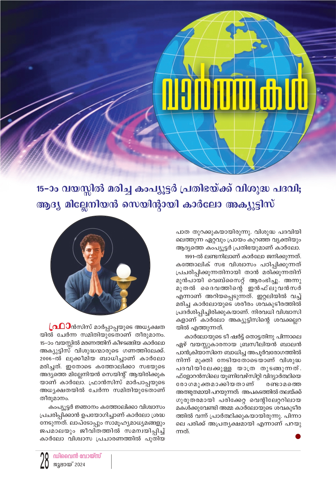 15-ാം വയസ്സിൽ മരിച്ച കംപ്യൂട്ടർ പ്രതിഭയ്ക്ക് വിശുദ്ധ പദവി; ആദ്യ മില്ലേനിയൻ സെയിൻ്റായി കാർലോ അക്യുട്ടിസ് ഫ്രാൻസിസ് മാർപ്പാപ്പയുടെ അധ്യക്ഷത യിൽ ചേർന്ന സമിതിയുടേതാണ് തീരുമാനം. 15-ാം വയസ്സിൽ മരണത്തിന് കീഴടങ്ങിയ കാർലോ അക്യൂട്ടിസ് വിശുദ്ധന്മാരുടെ ഗണത്തിലേക്ക്. 2006-ൽ ലുക്കീമിയ ബാധിച്ചാണ് കാർലോ മരിച്ചത്. ഇതോടെ കുത്തോലിക്കാ സഭയുടെ അദ്യത്തെ മില്ലേനിയൻ സെയിൻ്റ് ആയിരിക്കുക യാണ് കാർലോ. ഫ്രാൻസിസ് മാർപാപ്പയുടെ അധ്യക്ഷതയിൽ ചേർന്ന സമിതിയുടേതാണ് തീരുമാനം. കംപ്യൂട്ടർ ജ്ഞാനം കത്തോലിക്കാ വിശ്വാസം പ്രചരിപ്പിക്കാൻ ഉപയോഗിച്ചാണ് കാർലോ ശ്രദ്ധ നേടുന്നത്. ലാപ്ടോപ്പും സാമൂഹ്യമാധ്യമങ്ങളും ജപമാലയും ജീവിതത്തിൽ സമന്വയിപ്പിച്ച് കാർലോ വിശ്വാസ പ്രചാരണത്തിൽ പുതിയ പാത തുറക്കുകയായിരുന്നു. വിശുദ്ധ പദവിയി ലെത്തുന്ന ഏറ്റവും പ്രായം കുറഞ്ഞ വ്യക്തിയും ആദ്യത്തെ കംപ്യൂട്ടർ പ്രതിഭയുമാണ് കാർലോ. 1991-ൽ ലണ്ടനിലാണ് കാർലോ ജനിക്കുന്നത്. കത്തോലിക് സഭ വിശ്വാസം പഠിപ്പിക്കുന്നത് പ്രചരിപ്പിക്കുന്നതിനായി താൻ മരിക്കുന്നതിന് മുൻപായി വെബ്സൈറ്റ് ആരംഭിച്ചു. അന്നു മുതൽ ദൈവത്തിൻ്റെ ഇൻഫ്ലുവൻസർ എന്നാണ് അറിയപ്പെടുന്നത്. ഇറ്റലിയിൽ വച്ച് മരിച്ച കാർലോയുടെ ശരീരം ശവകുടീരത്തിൽ പ്രദർശിപ്പിച്ചിരിക്കുകയാണ്. നിരവധി വിശ്വാസി കളാണ് കാർലോ അക്യൂട്ടിസിൻ്റെ ശവക്കല്ലറ യിൽ എത്തുന്നത്. കാർലോയുടെ ടീ ഷർട്ട് തൊട്ടതിനു പിന്നാലെ ഏഴ് വയസ്സുകാരനായ ബ്രസീലിയൻ ബാലൻ പാൻക്രിയാസിനെ ബാധിച്ച അപൂർവരോഗത്തിൽ നിന്ന് മുക്തി നേടിയതോടെയാണ് വിശുദ്ധ പദവിയിലേക്കുള്ള യാത്ര തുടങ്ങുന്നത്. ഫ്ളോറൻസിലെ യൂണിവേഴ്സിറ്റി വിദ്യാർത്ഥിയെ രോഗമുക്തമാക്കിയതാണ് രണ്ടാമത്തെ അത്ഭുതമായി പറയുന്നത്. അപകടത്തിൽ തലയ്ക്ക് ഗുരുതരമായി പരിക്കേറ്റ വെൻ്റിലേറ്ററിലായ മകൾക്കുവേണ്ടി അമ്മ കാർലോയുടെ ശവകുടീര ത്തിൽ വന്ന് പ്രാർത്ഥിക്കുകയായിരുന്നു. പിന്നാ ലെ പരിക്ക് അപ്രത്യക്ഷമായി എന്നാണ് പറയു ന്നത്.