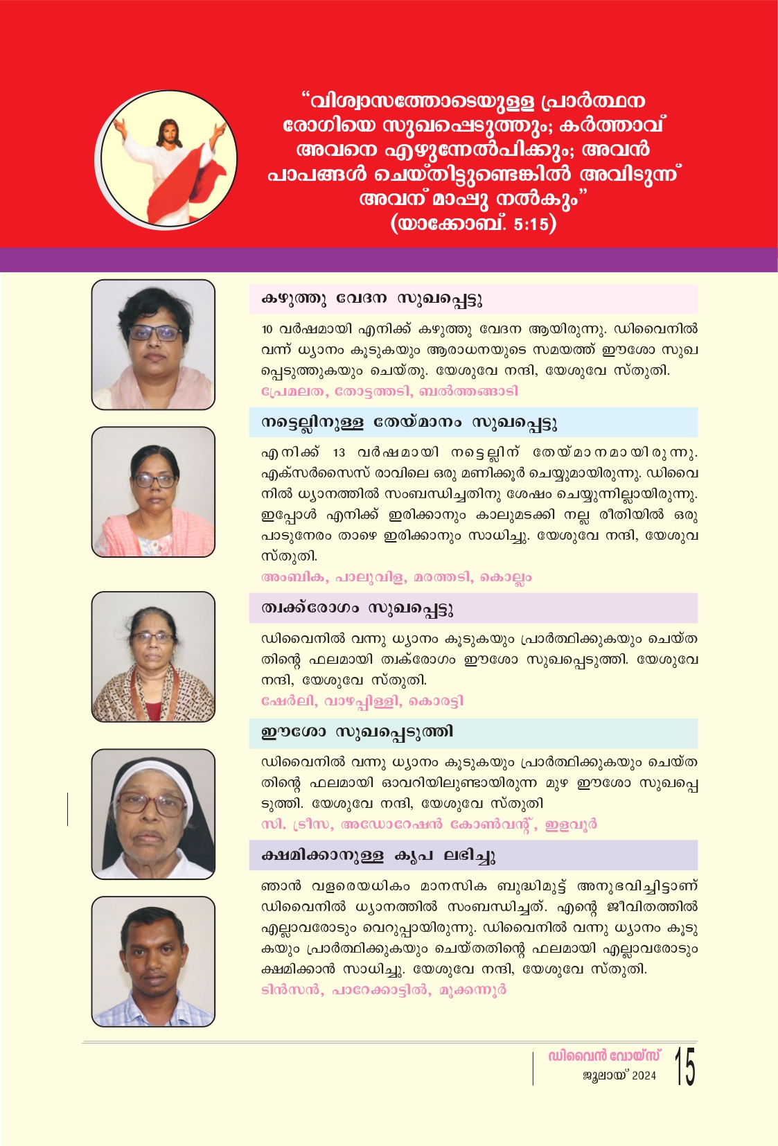 "വിശ്വാസത്തോടെയുള്ള പ്രാർത്ഥന രോഗിയെ സുഖപ്പെടുത്തും; കർത്താവ് അവനെ എഴുന്നേൽപിക്കും; അവൻ പാപങ്ങൾ ചെയ്തതിട്ടുണ്ടെങ്കിൽ അവിടുന്ന് അവന് മാപ്പു നൽകും" (യാക്കോബ്. 5:15) കഴുത്തു വേദന സുഖപ്പെട്ടു 10 വർഷമായി എനിക്ക് കഴുത്തു വേദന ആയിരുന്നു. ഡിവൈനിൽ വന്ന് ധ്യാനം കൂടുകയും ആരാധനയുടെ സമയത്ത് ഈശോ സുഖ പ്പെടുത്തുകയും ചെയ്തു. യേശുവേ നന്ദി, യേശുവേ സ്തുതി. പ്രേമലത, തോട്ടത്തടി, ബൽത്തങ്ങാടി