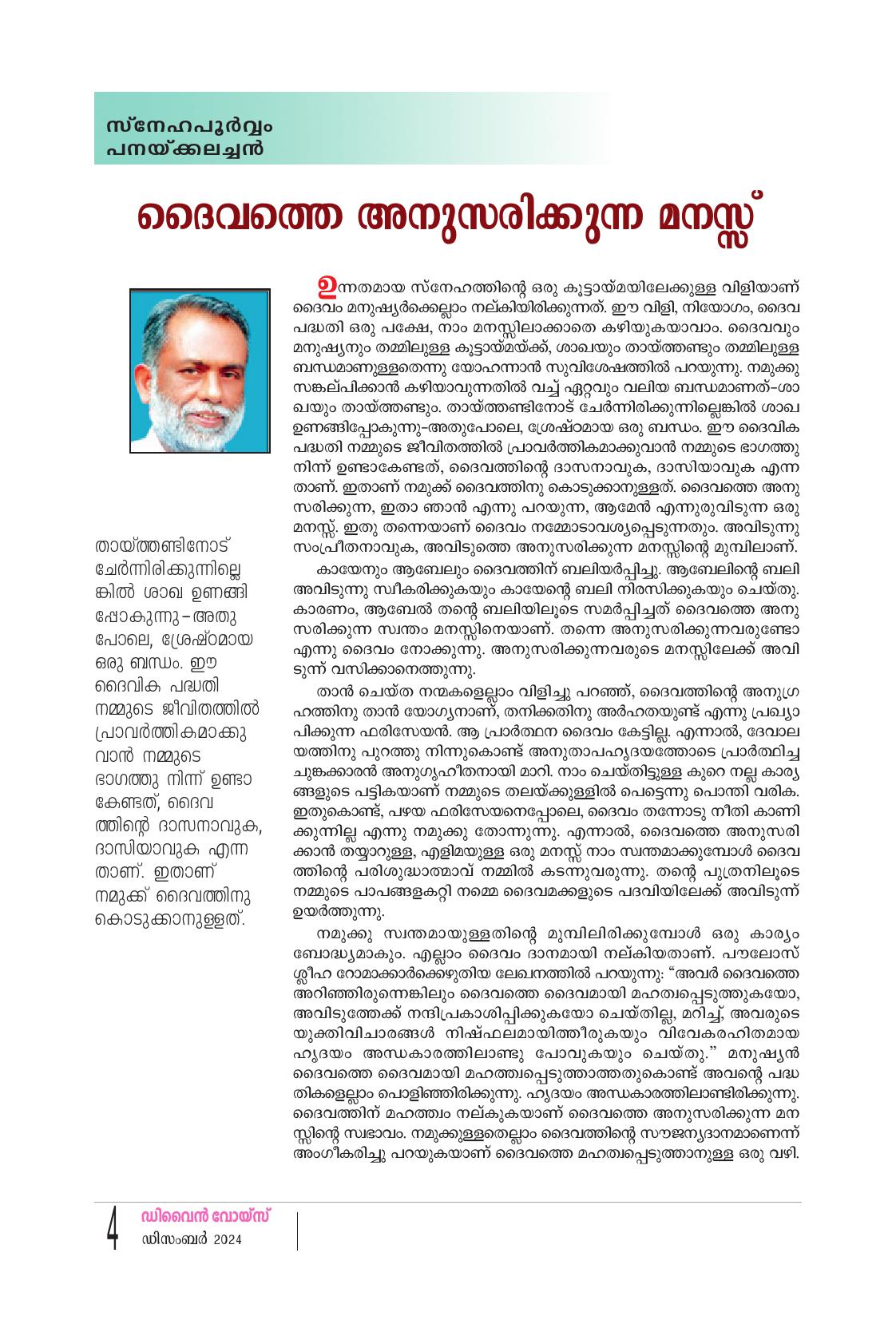 ഉന്നതമായ സ്നേഹത്തിൻ്റെ ഒരു കൂട്ടായ്മയിലേക്കുള്ള വിളിയാണ് ദൈവം മനുഷ്യർക്കെല്ലാം നല്കിയിരിക്കുന്നത്, ഈ വിളി, നിയോഗം, ദൈവ പദ്ധതി ഒരു പക്ഷേ, നാം മനസ്സിലാക്കാതെ കഴിയുകയാവാം. ദൈവവും മനുഷ്യനും തമ്മിലുള്ള കൂട്ടായ്മയ്ക്ക്, ശാഖയും തായ്ത്തണ്ടും തമ്മിലുള്ള ബന്ധമാണുള്ളതെന്നു യോഹന്നാൻ സുവിശേഷത്തിൽ പറയുന്നു. നമുക്കു സങ്കല്പിക്കാൻ കഴിയാവുന്നതിൽ വച്ച് ഏറ്റവും വലിയ ബന്ധമാണത്-ശാ ഖയും തായ്ത്തണ്ടും. തായ്ത്തണ്ടിനോട് ചേർന്നിരിക്കുന്നില്ലെങ്കിൽ ശാഖ ഉണങ്ങിപ്പോകുന്നു-അതുപോലെ ശ്രേഷ്ഠമായ ഒരു ബന്ധം. ഈ ദൈവിക പദ്ധതി നമ്മുടെ ജീവിതത്തിൽ പ്രാവർത്തികമാക്കുവാൻ നമ്മുടെ ഭാഗത്തു നിന്ന് ഉണ്ടാകേണ്ടത്, ദൈവത്തിന്റെ ദാസനാവുക, ദാസിയാവുക എന്ന താണ്. ഇതാണ് നമുക്ക് ദൈവത്തിനു കൊടുക്കാനുള്ളത്. ദൈവത്തെ അനു സരിക്കുന്ന, ഇതാ ഞാൻ എന്നു പറയുന്ന, ആമേൻ എന്നുരുവിടുന്ന ഒരു മനസ്സ്. ഇതു തന്നെയാണ് ദൈവം നമ്മോടാവശ്യപ്പെടുന്നതും. അവിടുന്നു സംപ്രീതനാവുക, അവിടുത്തെ അനുസരിക്കുന്ന മനസ്സിന്റെ മുമ്പിലാണ്. കായേനും ആബേലും ദൈവത്തിന് ബലിയർപ്പിച്ചു. ആബേലിന്റെ ബലി അവിടുന്നു സ്വീകരിക്കുകയും കായേൻ്റെ ബലി നിരസിക്കുകയും ചെയ്തു. കാരണം, ആബേൽ തൻ്റെ ബലിയിലൂടെ സമർപ്പിച്ചത് ദൈവത്തെ അനു സരിക്കുന്ന സ്വന്തം മനസ്സിനെയാണ്. തന്നെ അനുസരിക്കുന്നവരുണ്ടോ എന്നു ദൈവം നോക്കുന്നു. അനുസരിക്കുന്നവരുടെ മനസ്സിലേക്ക് അവി ടുന്ന് വസിക്കാനെത്തുന്നു.