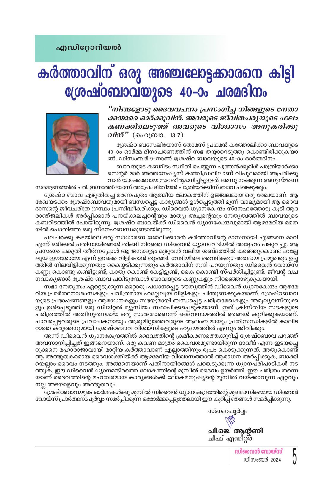 ശ്രേഷ്ഠ ബസേലിയോസ് തോമസ് പ്രഥമൻ കത്തോലിക്കാ ബാവയുടെ 40-ാം ഓർമ്മ ദിനാചരണത്തിന് സഭ തയ്യാറെടുത്തു കൊണ്ടിരിക്കുകയാ ണ്. ഡിസംബർ 9-നാണ് ശ്രേഷ്ഠ ബാവയുടെ 40-ാം ഓർമ്മദിനം. ബാവയുടെ കബറിടം സ്ഥിതി ചെയ്യുന്ന പുത്തൻകുരിശ് പാത്രിയാർക്കാ സെന്റർ മാർ അത്തനേഷ്യസ് കത്തീഡ്രലിലാണ് വിപുലമായി ആചരിക്കു വാൻ യാക്കോബായ സഭ തീരുമാനിച്ചിട്ടുള്ളത്. അന്നു നടക്കുന്ന അനുസ്മരണ സമ്മേളനത്തിൽ പരി. ഇഗ്നാത്തിയോസ് അപ്രേം ദ്വിതീയൻ പാത്രിയർക്കീസ് ബാവ പങ്കെടുക്കും. ശ്രേഷ്ഠ ബാവ എഴുതിവച്ച മരണപത്രം ആത്മീയ ലോകത്തിന് ഉജ്ജ്വലമായ ഒരു രേഖയാണ്. ആ രേഖയടക്കം ശ്രേഷ്ഠബാവയുമായി ബന്ധപ്പെട്ട കാര്യങ്ങൾ ഉൾപ്പെടുത്തി മൂന്ന് വാല്യമായി ആ ദൈവ ദാസന്റെ ജീവചരിത്ര ഗ്രന്ഥം പ്രസിദ്ധീകരിക്കും. ഡിവൈൻ ധ്യാനകേന്ദ്രം സ്നേഹത്തോടു കൂടി ആദ രാഞ്ജലികൾ അർപ്പിക്കാൻ പനയ്ക്കലച്ചന്റെയും മാത്യു അച്ചൻ്റെയും നേതൃത്വത്തിൽ ബാവയുടെ കബറിടത്തിൽ പോയിരുന്നു. ശ്രേഷ്ഠ ബാവയ്ക്ക് ഡിവൈൻ ധ്യാനകേന്ദ്രവുമായി ആഴമേറിയ മമത യിൽ പൊതിഞ്ഞ ഒരു സ്നേഹബന്ധമുണ്ടായിരുന്നു. പലചരക്കു കടയിലെ ഒരു സാധാരണ ജോലിക്കാരൻ കർത്താവിൻ്റെ ദാസനായി എങ്ങനെ മാറി എന്ന് ഒരിക്കൽ പതിനായിരങ്ങൾ തിങ്ങി നിറഞ്ഞ ഡിവൈൻ ധ്യാനവേദിയിൽ അദ്ദേഹം പങ്കുവച്ചു. ആ പ്രസംഗം പകുതി തീർന്നപ്പോൾ ആ ജനക്കൂട്ടം മുഴുവൻ വലിയ ശബ്ദത്തിൽ കരഞ്ഞുകൊണ്ട് ഹല്ലേ ലൂയ ഈശോയേ എന്ന് ഉറക്കെ വിളിക്കാൻ തുടങ്ങി. വേദിയിലെ വൈദികരും അത്മായ പ്രമുഖരും ഉച്ച ത്തിൽ നിലവിളിക്കുന്നതും കൈയ്യടിക്കുന്നതും കർത്താവിന് നന്ദി പറയുന്നതും ഡിവൈൻ വോയ്സ് കണ്ണു കൊണ്ടു കണ്ടിട്ടുണ്ട്. കാതു കൊണ്ട് കേട്ടിട്ടുണ്ട്, കൈ കൊണ്ടി സ്പർശിച്ചിട്ടുണ്ട്. ജീവൻ വച നവാക്യങ്ങൾ ശ്രേഷ്ഠ ബാവ പങ്കിടുമ്പോൾ ബാവയുടെ കണ്ണുകളും നിറഞ്ഞൊഴുകുകയായി. സഭാ നേതൃത്വം ഏറ്റെടുക്കുന്ന മറ്റൊരു പ്രധാനപ്പെട്ട ദൗത്യത്തിന് ഡിവൈൻ ധ്യാനകേന്ദ്രം ആഴമേ റിയ പ്രാർത്ഥനാശംസകളും പവിത്രമായ ഹല്ലേലൂയ വിളികളും പിന്തുണക്കുകയാണ്. ശ്രേഷ്ഠബാവ യുടെ പ്രഭാഷണങ്ങളും ആരാധനകളും സഭയുമായി ബന്ധപ്പെട്ട ചരിത്രരേഖകളും അമൂല്യവസ്തുക്ക ളും ഉൾപ്പെടുത്തി ഒരു ഡിജിറ്റൽ മ്യൂസിയം സ്ഥാപിക്കപ്പെടുകയാണ്. ഇത് ക്രിസ്തീയ സഭകളുടെ ചരിത്രത്തിൽ അതിനൂതനമായ ഒരു സംരഭമാണെന്ന് ദൈവനാമത്തിൽ ഞങ്ങൾ കുറിക്കുകയാണ്. പാവപ്പെട്ടവരുടെ പ്രവാചകനായും ആരുമില്ലാത്തവരുടെ ആലംബമായും പ്രതിസന്ധികളിൽ കാലിട റാത്ത കരുത്തനുമായി ശ്രേഷ്ഠബാവ വിശ്വാസികളുടെ ഹൃദയത്തിൽ എന്നും ജീവിക്കും. അന്ന് ഡിവൈൻ ധ്യാനകേന്ദ്രത്തിൽ ദൈവത്തിൻ്റെ ക്രമീകരണത്തെക്കുറിച്ച് ശ്രേഷ്ഠബാവ പറഞ്ഞ് അവസാനിപ്പിച്ചത് ഇങ്ങനെയാണ്. ഒരു കവണ മാത്രം കൈവശമുണ്ടായിരുന്ന ദാവീദ് എന്ന ഇടയച്ചെ റുക്കനെ മഹാരാജാവായി മാറ്റ
