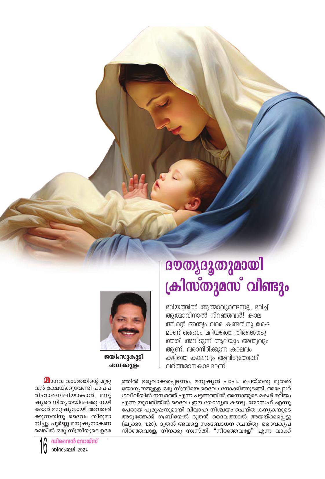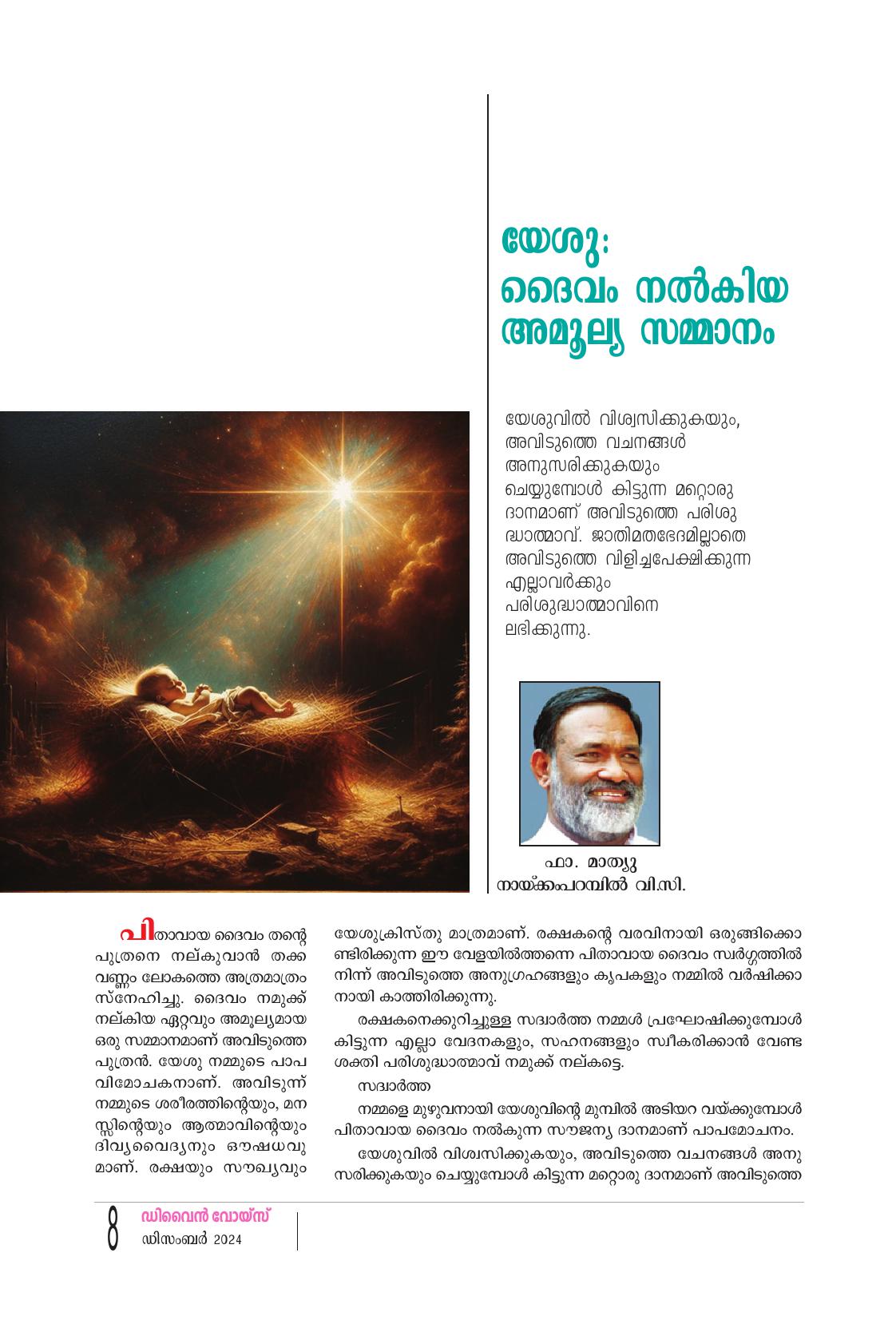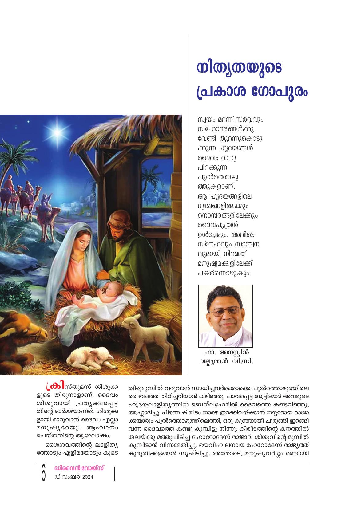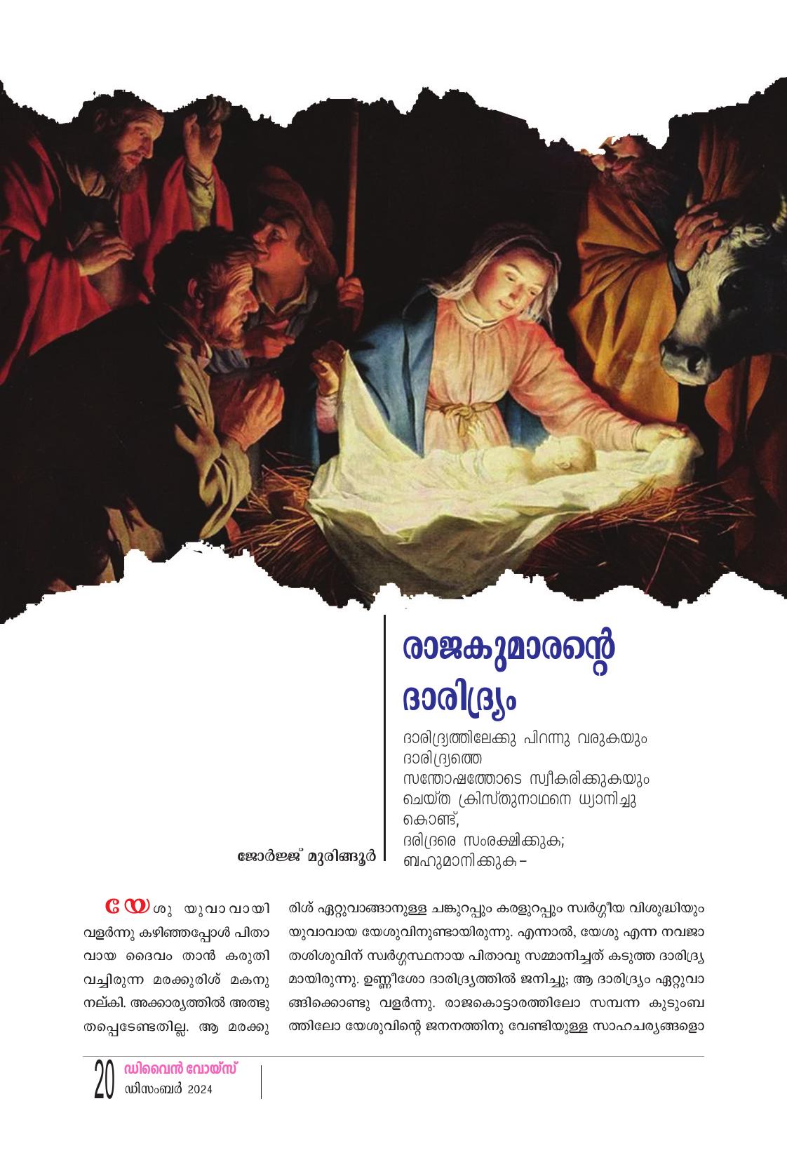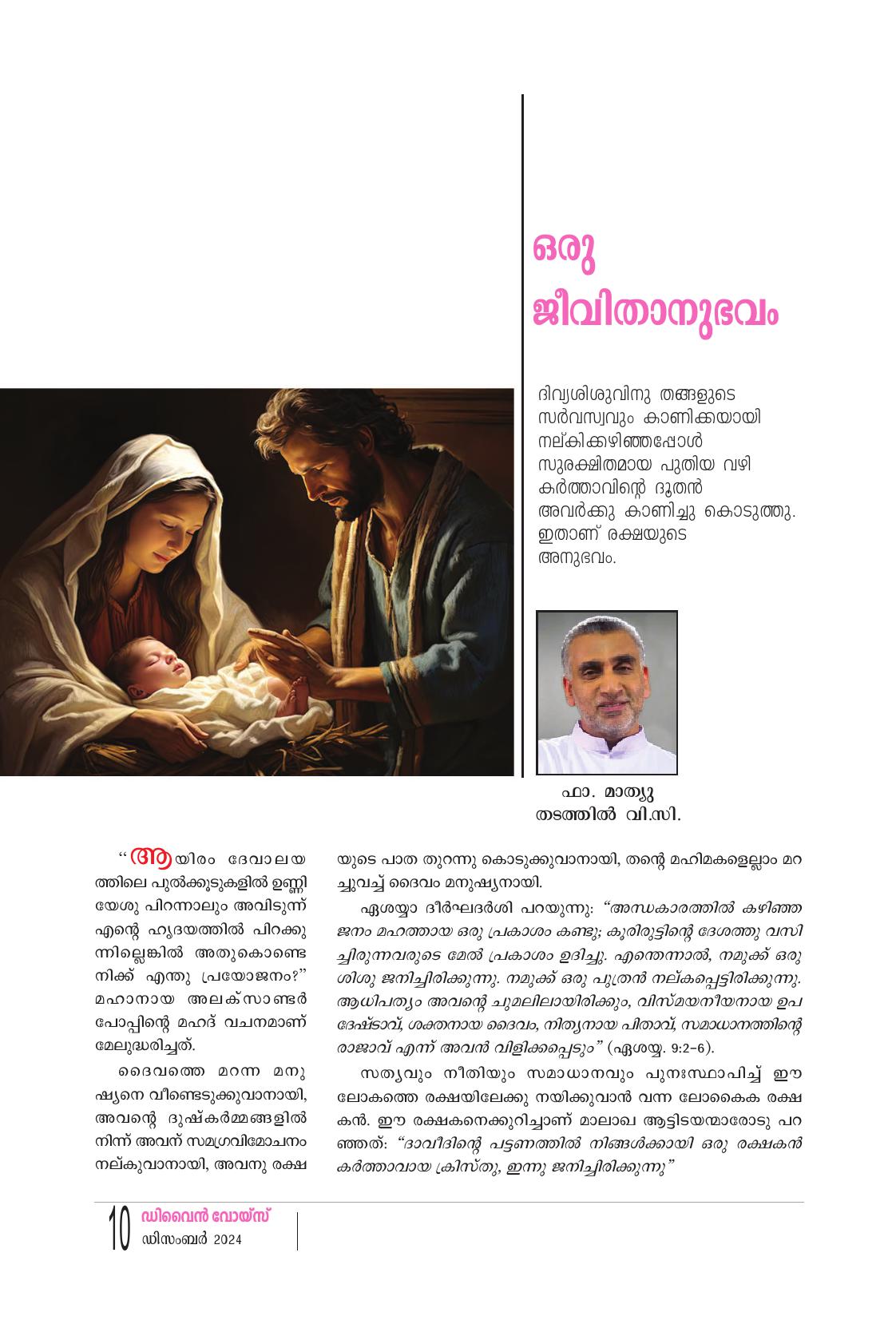 "ആയിരം ദേവാലയ ത്തിലെ പുൽക്കൂടുകളിൽ ഉണ്ണി യേശു പിറന്നാലും അവിടുന്ന് എന്റെ ഹൃദയത്തിൽ പിറക്കു ന്നില്ലെങ്കിൽ അതുകൊണ്ട് നിക്ക് എന്തു പ്രയോജനം?" മഹാനായ അലക്സാണ്ടർ പോപ്പിന്റെ മഹദ് വചനമാണ് മേലുദ്ധരിച്ചത്. ദൈവത്തെ മറന്ന മനു ഷ്യനെ വീണ്ടെടുക്കുവാനായി, അവന്റെ ദുഷ്കർമ്മങ്ങളിൽ നിന്ന് അവന് സമഗ്രവിമോചനം നല്കുവാനായി, അവനു രക്ഷ യുടെ പാത തുറന്നു കൊടുക്കുവാനായി, തൻ്റെ മഹിമകളെല്ലാം മറ ച്ചുവച്ച് ദൈവം മനുഷ്യനായി. ഏശയ്യാ ദീർഘദർശി പറയുന്നു: "അന്ധകാരത്തിൽ കഴിഞ്ഞ ജനം മഹത്തായ ഒരു പ്രകാശം കണ്ടു; കുരിരുട്ടിൻ്റെ ദേശത്തു വസി ച്ചിരുന്നവരുടെ മേൽ പ്രകാശം ഉദിച്ചു. എന്തെന്നാൽ, നമുക്ക് ഒരു ശിശു ജനിച്ചിരിക്കുന്നു. നമുക്ക് ഒരു പുത്രൻ നല്കപ്പെട്ടിരിക്കുന്നു. ആധിപത്യം അവൻ്റെ ചുമലിലായിരിക്കും, വിസ്മയനീയനായ ഉപ ദേഷ്ടാവ്, ശക്തനായ ദൈവം, നിത്യനായ പിതാവ്, സമാധാനത്തിന്റെ രാജാവ് എന്ന് അവൻ വിളിക്കപ്പെടും" (ഏശയ്യ. 9:2-6). സത്യവും നീതിയും സമാധാനവും പുനഃസ്ഥാപിച്ച് ഈ ലോകത്തെ രക്ഷയിലേക്കു നയിക്കുവാൻ വന്ന ലോകൈക രക്ഷ കൻ. ഈ രക്ഷകനെക്കുറിച്ചാണ് മാലാഖ ആട്ടിടയന്മാരോടു പറ ഞ്ഞത്: "ദാവീദിൻ്റെ പട്ടണത്തിൽ നിങ്ങൾക്കായി ഒരു രക്ഷകൻ കർത്താവായ ക്രിസ്തു. ഇന്നു ജനിച്ചിരിക്കുന്നു"