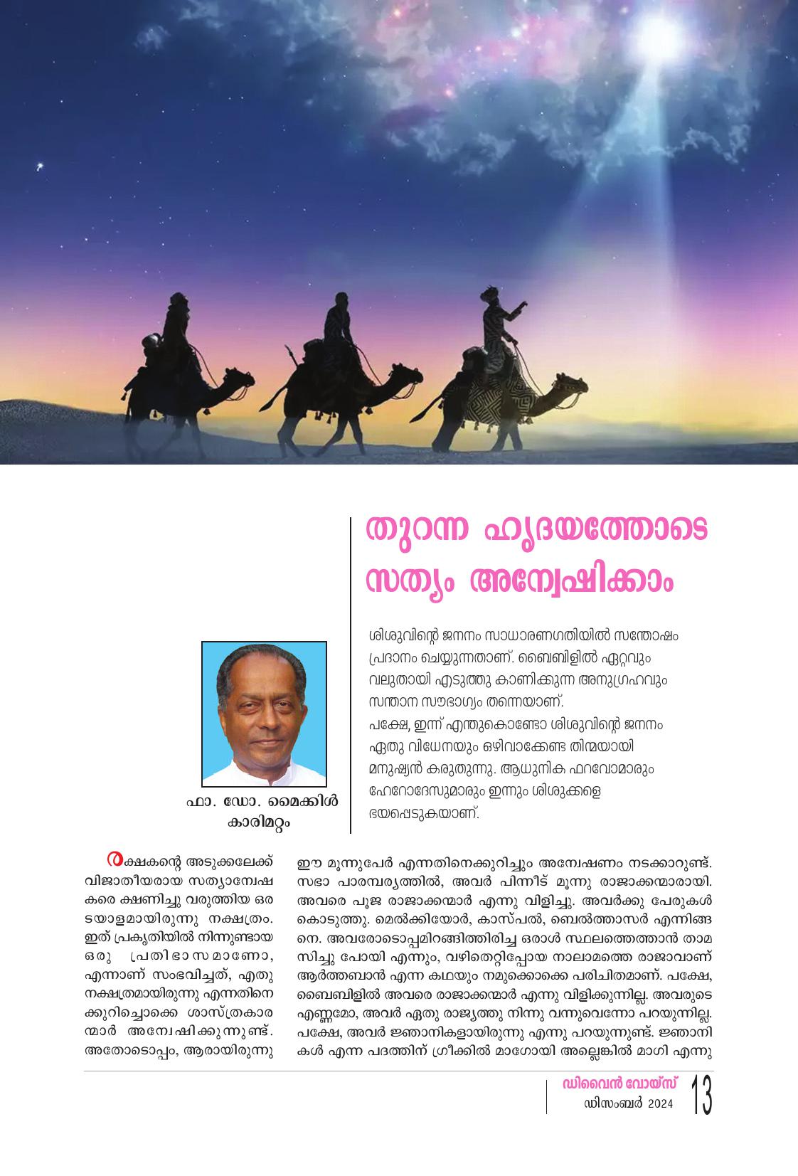രക്ഷകൻറെ അടുക്കലേക്ക് വിജാതീയരായ സത്യാന്വേഷ കരെ ക്ഷണിച്ചു വരുത്തിയ ഒര ടയാളമായിരുന്നു നക്ഷത്രം: ഇത് പ്രകൃതിയിൽ നിന്നുണ്ടായ ഒരു പ്രതിഭാസമാണോ, എന്നാണ് സംഭവിച്ചത്. എതു നക്ഷത്രമായിരുന്നു എന്നതിനെ ക്കുറിച്ചൊക്കെ ശാസ്ത്രകാര ന്മാർ അന്വേഷിക്കുന്നുണ്ട്. അതോടൊപ്പം, ആരായിരുന്നു ഈ മൂന്നുപേർ എന്നതിനെക്കുറിച്ചും അന്വേഷണം നടക്കാറുണ്ട്. സഭാ പാരമ്പര്യത്തിൽ, അവർ പിന്നീട് മൂന്നു രാജാക്കന്മാരായി. അവരെ പൂജ രാജാക്കന്മാർ എന്നു വിളിച്ചു. അവർക്കു പേരുകൾ കൊടുത്തു. മെൽക്കിയോർ, കാസ്പൽ, ബെൽത്താസർ എന്നിങ്ങ നെ. അവരോടൊപ്പമിറങ്ങിത്തിരിച്ച ഒരാൾ സ്ഥലത്തെത്താൻ താമ സിച്ചു പോയി എന്നും, വഴിതെറ്റിപ്പോയ നാലാമത്തെ രാജാവാണ് ആർത്തബാൻ എന്ന കഥയും നമുക്കൊക്കെ പരിചിതമാണ്. പക്ഷേ, ബൈബിളിൽ അവരെ രാജാക്കന്മാർ എന്നു വിളിക്കുന്നില്ല. അവരുടെ എണ്ണമോ, അവർ ഏതു രാജ്യത്തു നിന്നു വന്നുവെന്നോ പറയുന്നില്ല. പക്ഷേ, അവർ ജ്ഞാനികളായിരുന്നു എന്നു പറയുന്നുണ്ട്. ജ്ഞാനി കൾ എന്ന പദത്തിന് ഗ്രീക്കിൽ മാഗോയി അല്ലെങ്കിൽ മാഗി എന്നു