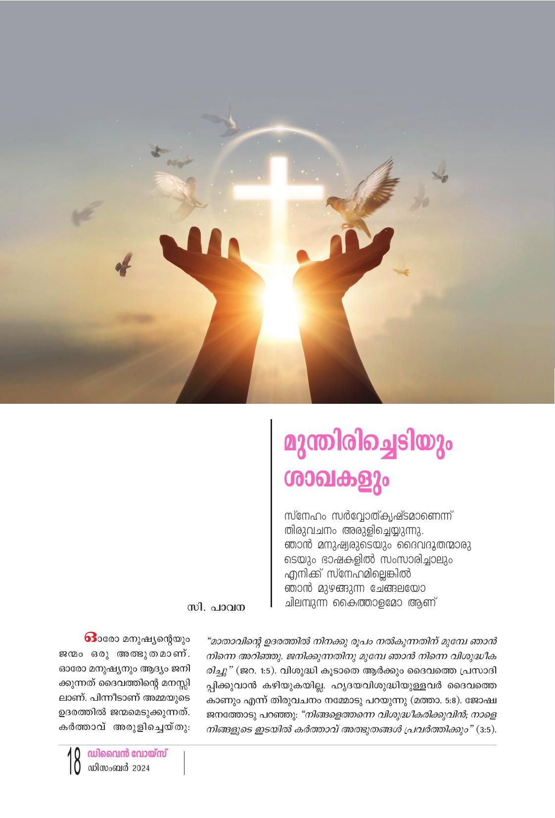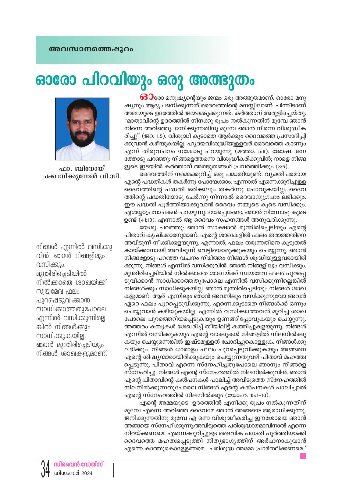 ഓരോ മനുഷ്യൻറെയും ജന്മം ഒരു അത്ഭുതമാണ്. ഓരോ മനു ഷ്യനും ആദ്യം ജനിക്കുന്നത് ദൈവത്തിൻ്റെ മനസ്സിലാണ്. പിന്നീടാണ് അമ്മയുടെ ഉദരത്തിൽ ജന്മമെടുക്കുന്നത്. കർത്താവ് അരുളിച്ചെയ്തു: “മാതാവിന്റെ ഉദരത്തിൽ നിനക്കു രൂപം നൽകുന്നതിന് മുമ്പേ ഞാൻ നിന്നെ അറിഞ്ഞു. ജനിക്കുന്നതിനു മുമ്പേ ഞാൻ നിന്നെ വിശുദ്ധീക രിച്ചു" (ജറ. 1:5). വിശുദ്ധി കൂടാതെ ആർക്കും ദൈവത്തെ പ്രസാദിപ്പി ക്കുവാൻ കഴിയുകയില്ല. ഹൃദയവിശുദ്ധിയുള്ളവർ ദൈവത്തെ കാണും എന്ന് തിരുവചനം നമ്മോടു പറയുന്നു (മത്താ. 5:8). ജോഷ്വ ജന ത്തോടു പറഞ്ഞു: നിങ്ങളെത്തന്നെ വിശുദ്ധീകരിക്കുവിൻ; നാളെ നിങ്ങ ളുടെ ഇടയിൽ കർത്താവ് അത്ഭുതങ്ങൾ പ്രവർത്തിക്കും (3:5). ദൈവത്തിന് നമ്മെക്കുറിച്ച് ഒരു പദ്ധതിയുണ്ട്. വ്യക്തിപരമായ എന്റെ പദ്ധതികൾ തകർന്നു പോയേക്കാം. എന്നാൽ എന്നെക്കുറിച്ചുള്ള ദൈവത്തിന്റെ പദ്ധതി ഒരിക്കലും തകർന്നു പോവുകയില്ല. ദൈവ ത്തിന്റെ പദ്ധതിയോടു ചേർന്നു നിന്നാൽ ദൈവാനുഗ്രഹം ലഭിക്കും. ഈ പദ്ധതി പൂർത്തിയാക്കുവാൻ ദൈവം നമ്മുടെ കൂടെ വസിക്കും. ഏശയ്യാപ്രവാചകൻ പറയുന്നു: ഭയപ്പെടേണ്ട, ഞാൻ നിന്നോടു കൂടെ ഉണ്ട് (41:10). എന്നാൽ ആ ദൈവം സഹനങ്ങൾ അനുവദിക്കുന്നു. യേശു പറഞ്ഞു: ഞാൻ സാക്ഷാൽ മുന്തിരിച്ചെടിയും എന്റെ പിതാവ് കൃഷിക്കാരനുമാണ്. എൻ്റെ ശാഖകളിൽ ഫലം തരാത്തതിനെ അവിടുന്ന് നീക്കിക്കളയുന്നു. എന്നാൽ, ഫലം തരുന്നതിനെ കൂടുതൽ കായ്ക്കാനായി അവിടുന്ന് വെട്ടിയൊരുക്കുകയും ചെയ്യുന്നു. ഞാൻ നിങ്ങളോടു പറഞ്ഞ വചനം നിമിത്തം നിങ്ങൾ ശുദ്ധിയുള്ളവരായിരി ക്കുന്നു. നിങ്ങൾ എന്നിൽ വസിക്കുവിൻ. ഞാൻ നിങ്ങളിലും വസിക്കും. മുന്തിരിച്ചെടിയിൽ നിൽക്കാതെ ശാഖയ്ക്ക് സ്വയമേവ ഫലം പുറപ്പെ ടുവിക്കാൻ സാധിക്കാത്തതുപോലെ എന്നിൽ വസിക്കുന്നില്ലെങ്കിൽ നിങ്ങൾക്കും സാധിക്കുകയില്ല. ഞാൻ മുന്തിരിച്ചെടിയും നിങ്ങൾ ശാഖ കളുമാണ്. ആര് എന്നിലും ഞാൻ അവനിലും വസിക്കുന്നുവോ അവൻ ഏറെ ഫലം പുറപ്പെടുവിക്കുന്നു. എന്നെക്കൂടാതെ നിങ്ങൾക്ക് ഒന്നും ചെയ്യുവാൻ കഴിയുകയില്ല. എന്നിൽ വസിക്കാത്തവൻ മുറിച്ച ശാഖ പോലെ പുറത്തെറിയപ്പെടുകയും ഉണങ്ങിപ്പോവുകയും ചെയ്യുന്നു. അത്തരം കമ്പുകൾ ശേഖരിച്ച് തീയിലിട്ട് കത്തിച്ചുകളയുന്നു. നിങ്ങൾ എന്നിൽ വസിക്കുകയും എൻ്റെ വാക്കുകൾ നിങ്ങളിൽ നിലനിൽക്കു കയും ചെയ്യുന്നെങ്കിൽ ഇഷ്ടമുള്ളത് ചോദിച്ചുകൊള്ളുക. നിങ്ങൾക്കു ലഭിക്കും. നിങ്ങൾ ധാരാളം ഫലം പുറപ്പെടുവിക്കുകയും അങ്ങനെ എന്റെ ശിഷ്യന്മാരായിരിക്കുകയും ചെയ്യുന്നതുവഴി പിതാവ് മഹത്ത്വ പ്പെടുന്നു. പിതാവ് എന്നെ സ്നേഹിച്ചതുപോലെ ഞാനും നിങ്ങളെ സ്നേഹിച്ചു. നിങ്ങൾ എൻ്റെ സ്നേഹത്തിൽ നിലനിൽക്കുവിൻ. ഞാൻ എന്റെ പിതാവിന്റെറെ കൽപനകൾ പാലിച്ച് അവിടുത്തെ സ്നേഹത്തിൽ നിലനിൽക്കുന്നതുപോലെ നിങ്ങൾ എൻ്റെ കൽപനകൾ പാലി