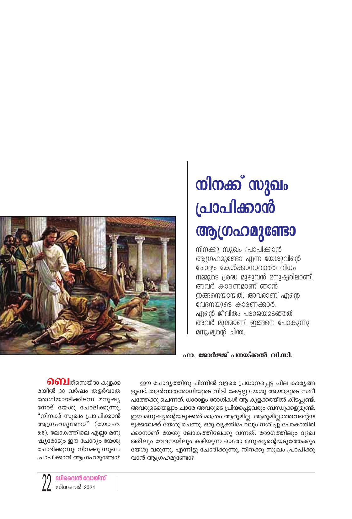ബെത്സെയ്ദാ കുളക്ക രയിൽ 38 വർഷം തളർവാത രോഗിയായിക്കിടന്ന മനുഷ്യ നോട് യേശു ചോദിക്കുന്നു. "നിനക്ക് സുഖം പ്രാപിക്കാൻ ആഗ്രഹമുണ്ടോ" (യോഹ. 5:6), ലോകത്തിലെ എല്ലാ മനു ഷ്യരോടും ഈ ചോദ്യം യേശു ചോദിക്കുന്നു: നിനക്കു സുഖം പ്രാപിക്കാൻ ആഗ്രഹമുണ്ടോ? ഈ ചോദ്യത്തിനു പിന്നിൽ വളരെ പ്രധാനപ്പെട്ട ചില കാര്യങ്ങ ളുണ്ട്. തളർവാതരോഗിയുടെ വിളി കേട്ടല്ല യേശു അയാളുടെ സമീ പത്തേക്കു ചെന്നത്. ധാരാളം രോഗികൾ ആ കുളക്കരയിൽ കിടപ്പുണ്ട്. അവരുടെയെല്ലാം ചാരേ അവരുടെ പ്രിയപ്പെട്ടവരും ബന്ധുക്കളുമുണ്ട്. ഈ മനുഷ്യന്റെയടുക്കൽ മാത്രം ആരുമില്ല. ആരുമില്ലാത്തവന്റെയ ടുക്കലേക്ക് യേശു ചെന്നു. ഒരു വ്യക്തിപോലും നശിച്ചു പോകാതിരി ക്കാനാണ് യേശു ലോകത്തിലേക്കു വന്നത്. രോഗത്തിലും ദുഃഖ ത്തിലും വേദനയിലും കഴിയുന്ന ഓരോ മനുഷ്യന്റെയടുത്തേക്കും യേശു വരുന്നു. എന്നിട്ടു ചോദിക്കുന്നു. നിനക്കു സുഖം പ്രാപിക്കു വാൻ ആഗ്രഹമുണ്ടോ?