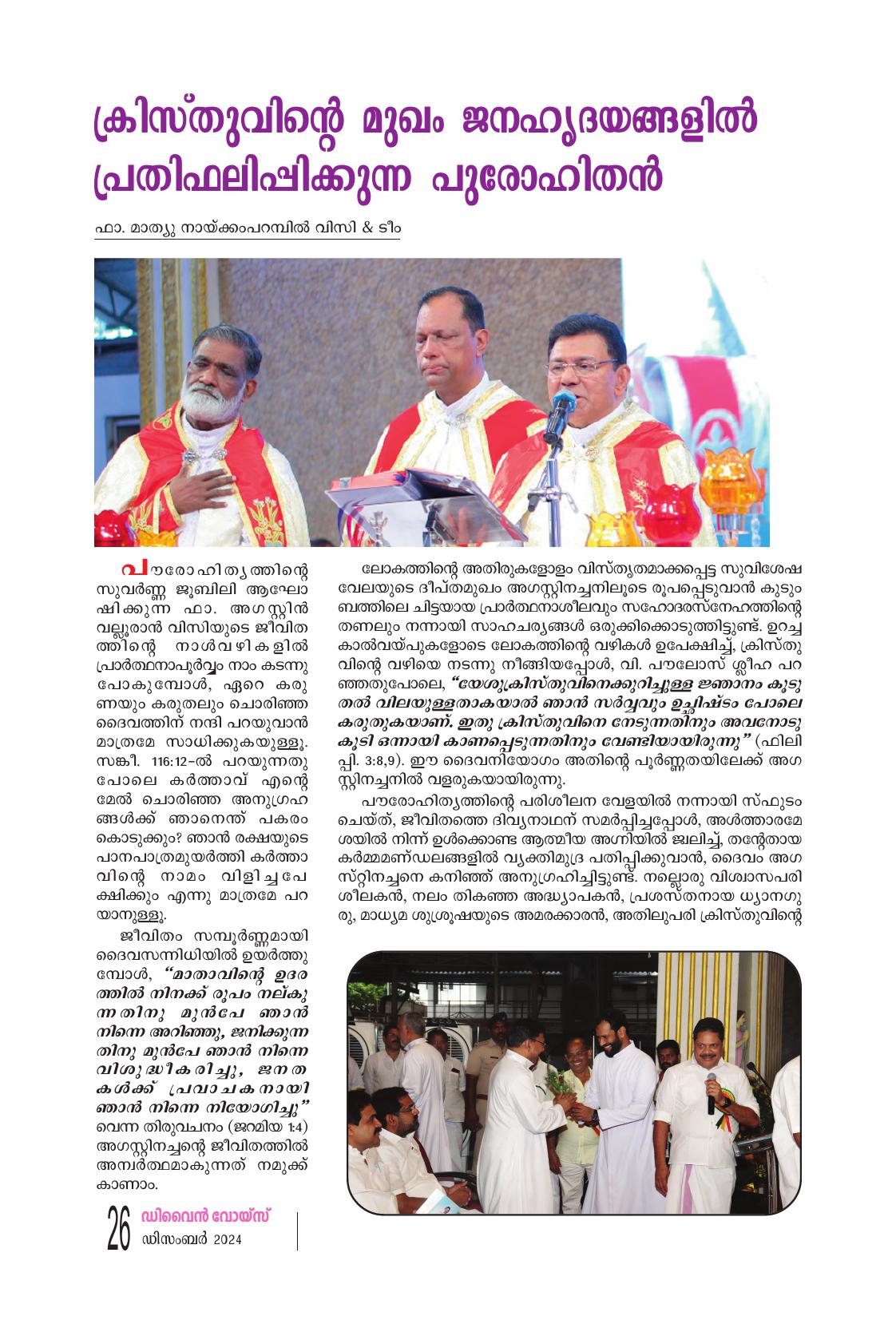 പൗരോഹിത്യത്തിന്റെ സുവർണ്ണ ജൂബിലി ആഘോ ഷിക്കുന്ന ഫാ. അഗസ്റ്റിൻ വല്ലൂരാൻ വിസിയുടെ ജീവിത ത്തിന്റെ നാൾവഴികളിൽ പ്രാർത്ഥനാപൂർവ്വം നാം കടന്നു പോകുമ്പോൾ, ഏറെ കരു ണയും കരുതലും ചൊരിഞ്ഞ ദൈവത്തിന് നന്ദി പറയുവാൻ മാത്രമേ സാധിക്കുകയുള്ളൂ. സങ്കീ. 116:12-ൽ പറയുന്നതു പോലെ കർത്താവ് എൻ്റെ മേൽ ചൊരിഞ്ഞ അനുഗ്രഹ ങ്ങൾക്ക് ഞാനെന്ത് പകരം കൊടുക്കും? ഞാൻ രക്ഷയുടെ പാനപാത്രമുയർത്തി കർത്താ വിന്റെ നാമം വിളിച്ചപേ ക്ഷിക്കും എന്നു മാത്രമേ പറ യാനുള്ളൂ. ജീവിതം സമ്പൂർണ്ണമായി ദൈവസന്നിധിയിൽ ഉയർത്തു മ്പോൾ, “മാതാവിന്റെ ഉദര ത്തിൽ നിനക്ക് രൂപം നല്കു ന്നതിനു മുൻപേ ഞാൻ നിന്നെ അറിഞ്ഞു, ജനിക്കുന്ന തിനു മുൻപേ ഞാൻ നിന്നെ വിശുദ്ധീകരിച്ചു, ജനത കൾക്ക് പ്രവാചകനായി ഞാൻ നിന്നെ നിയോഗിച്ചു" വെന്ന തിരുവചനം (ജറമിയ 1:4) അഗസ്റ്റിനച്ചന്റെ ജീവിതത്തിൽ അന്വർത്ഥമാകുന്നത് നമുക്ക് കാണാം. ലോകത്തിന്റെ അതിരുകളോളം വിസ്ത്യതമാക്കപ്പെട്ട സുവിശേഷ വേലയുടെ ദീപ്തമുഖം അഗസ്റ്റിനച്ചനിലൂടെ രൂപപ്പെടുവാൻ കുടും ബത്തിലെ ചിട്ടയായ പ്രാർത്ഥനാശീലവും സഹോദരസ്നേഹത്തിന്റെ തണലും നന്നായി സാഹചര്യങ്ങൾ ഒരുക്കിക്കൊടുത്തിട്ടുണ്ട്. ഉറച്ച കാൽവയ്പുകളോടെ ലോകത്തിൻ്റെ വഴികൾ ഉപേക്ഷിച്ച്, ക്രിസ് വിന്റെ വഴിയെ നടന്നു നീങ്ങിയപ്പോൾ, വി. പൗലോസ് ശ്ലീഹ പറ ഞ്ഞതുപോലെ, "യേശുക്രിസ്തുവിനെക്കുറിച്ചുള്ള ജ്ഞാനം കുടു തൽ വിലയുള്ളതാകയാൽ ഞാൻ സർവ്വവും ഉച്ഛിഷ്ടം പോലെ കരുതുകയാണ്. ഇതു ക്രിസ്തുവിനെ നേടുന്നതിനും അവനോടു കൂടി ഒന്നായി കാണപ്പെടുന്നതിനും വേണ്ടിയായിരുന്നു" (ഫിലി പ്പി. 3:8,9). ഈ ദൈവനിയോഗം അതിൻ്റെ പൂർണ്ണതയിലേക്ക് അഗ സ്റ്റിനച്ചനിൽ വളരുകയായിരുന്നു. പൗരോഹിത്യത്തിൻ്റെ പരിശീലന വേളയിൽ നന്നായി സ്ഫുടം ചെയ്ത്, ജീവിതത്തെ ദിവ്യനാഥന് സമർപ്പിച്ചപ്പോൾ, അൾത്താരമേ ശയിൽ നിന്ന് ഉൾക്കൊണ്ട് ആത്മീയ അഗ്നിയിൽ ജ്വലിച്ച്, തന്റേതായ കർമ്മമണ്ഡലങ്ങളിൽ വ്യക്തിമുദ്ര പതിപ്പിക്കുവാൻ, ദൈവം അഗ സ്റ്റിനച്ചനെ കനിഞ്ഞ് അനുഗ്രഹിച്ചിട്ടുണ്ട്. നല്ലൊരു വിശ്വാസപരി ശീലകൻ, നലം തികഞ്ഞ അദ്ധ്യാപകൻ, പ്രശസ്തനായ ധ്യാനഗു രൂ. മാധ്യമ ശുശ്രൂഷയുടെ അമരക്കാരൻ, അതിലുപരി ക്രിസ്തുവിന്റെ