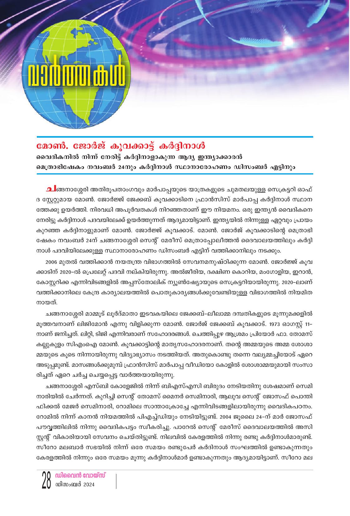 മാർപാപ്പ ഈ വർഷം ഇന്ത്യ സന്ദർശിക്കില്ല നിയുക്ത കർദ്ദിനാൾ ജോർജ്ജ് കൂവക്കാട് ഫ്രാൻസിസ് മാർപാപ്പ ഈ വർഷം ഇന്ത്യ സന്ദർശിക്കാൻ സാധ്യതയില്ലെന്ന് നിയുക്ത കർദ്ദി നാൾ. മാർപാപ്പയുടെ വിദേശയാത്രകൾ ക്രമീകരിക്കുന്ന ചുമതല വഹിക്കുന്നത് മോൺ. ജോർജ് കൂവ ക്കാടാണ്. 2020-ൽ നടക്കേണ്ടിയിരുന്ന യാത്രയാണ് ഇക്കഴിഞ്ഞ ദിവസങ്ങളിൽ ഏഷ്യാ ഓഷ്യാനയിൽ നടന്നത്. 2025 ജൂബിലി വർഷമായതിനാൽ കൂടുതൽ സമയവും പാപ്പ റോമിൽ തന്നെയായിരിക്കുമെന്നും അദ്ദേഹം പറഞ്ഞു. കർദ്ദിനാൾ പദവി ലഭിച്ച ശേഷം നാട്ടിലെത്തിയ മോൺ. ജോർജ് കൂവക്കാട് കൊച്ചി വിമാനത്താവളത്തിൽ മാധ്യമപ്രവർത്തകരോട് സംസാരിക്കുകയായിരുന്നു. ഭാരതസഭയ്ക്കും കേരളത്തിനും സീറോ മലബാർ സഭയ്ക്കും ഫ്രാൻസിസ് മാർപാപ്പ പ്രത്യേക മായി നൽകിയ സമ്മാനമാണ് കർദ്ദിനാൾ പദവിയെന്ന് മോൺ. ജോർജ്ജ് കുവക്കാട് പറഞ്ഞു. മാർ ജോസഫ് പവ്വത്തിൽ പിതാവിനു ലഭിക്കേണ്ടിയിരുന്ന അംഗീകാരമാണിതെന്നും അദ്ദേഹം കൂട്ടിച്ചേർത്തു. സഭയിലെ കുർബാന തർക്കത്തെക്കുറിച്ചുള്ള ചോദ്യത്തിന് തൻ്റെ ഉത്തരവാദിത്വം പാപ്പയുടെ വിദേശ സന്ദർശനം മാത്രമാണെന്നും മറ്റൊരു സമിതിയാണ് ഇക്കാര്യത്തിൽ തീരുമാനമെടുക്കേണ്ടതെന്നും നിയുക്ത കർദ്ദിനാൾ മറുപടി നല്കി. മോൺ. ജോർജ്ജ് കൂവക്കാടിന് കൊച്ചി വിമാനത്താവളത്തിൽ സഭാ വിശ്വാസികളും ചങ്ങനാശ്ശേരി അതിരൂപതയിലെ വൈദികരും ബന്ധുക്കളും സുഹൃത്തുക്കളും കാത്തലിക് നസ്രാണി അസോസിയേ ഷനും ചേർന്ന് സ്വീകരണം നല്കി, ആർച്ച് ബിഷപ് മാർ ജോർജ് കോച്ചേരി, കൂരിയാ മെത്രാൻ മാർ സെബാസ്റ്റ്യൻ വാണിയപ്പുരയ്ക്കൽ, ജോബ് മൈക്കിൾ എം.എൽ.എ എന്നിവരുടെ നേതൃത്വത്തിലായി രുന്നു സ്വീകരണം.