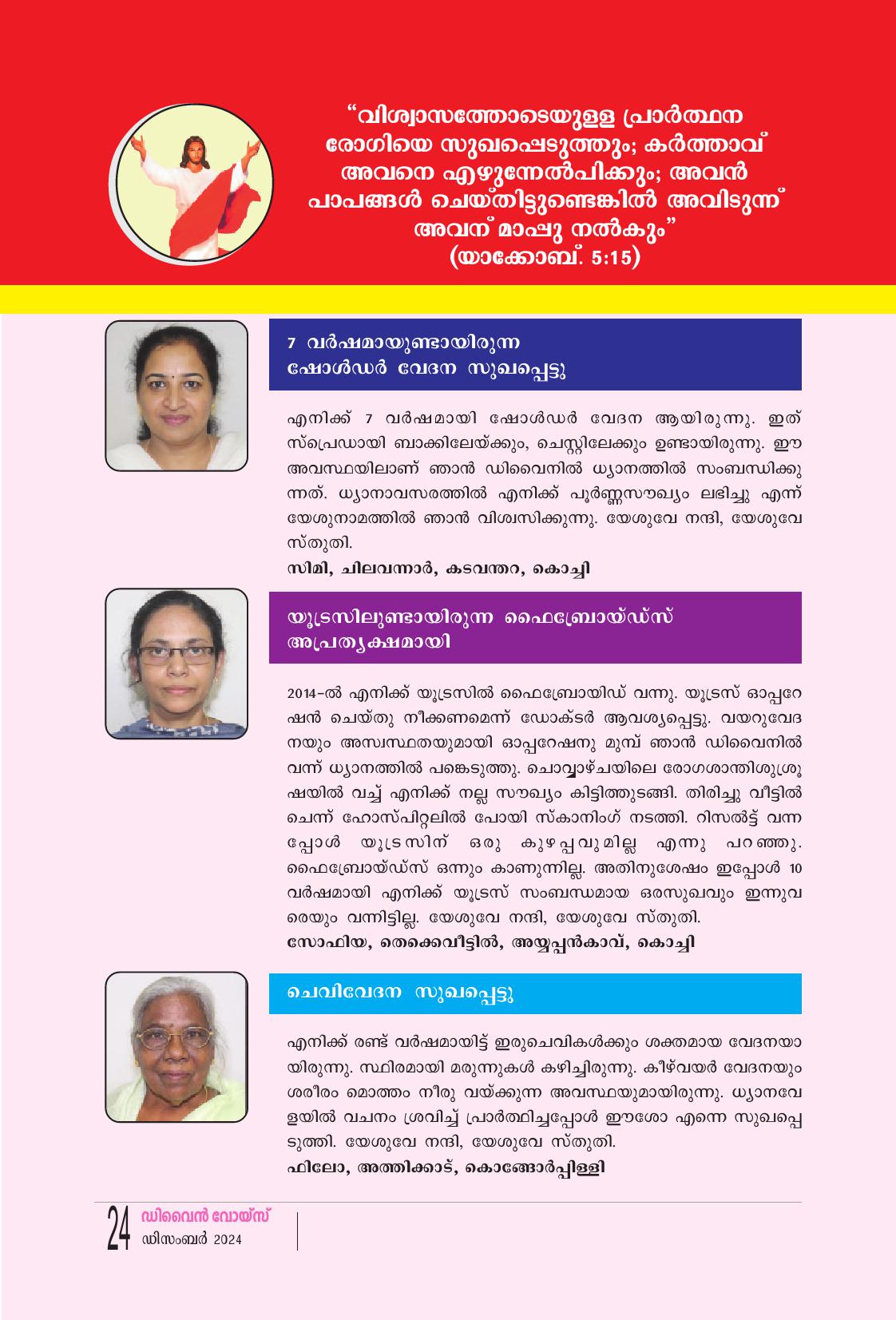 7 വർഷമായുണ്ടായിരുന്ന ഷോൾഡർ വേദന സുഖപ്പെട്ടു എനിക്ക് 7 വർഷമായി ഷോൾഡർ വേദന ആയിരുന്നു. ഇത് സ്പ്രെഡായി ബാക്കിലേയ്ക്കും, ചെസ്റ്റിലേക്കും ഉണ്ടായിരുന്നു. ഈ അവസ്ഥയിലാണ് ഞാൻ ഡിവൈനിൽ ധ്യാനത്തിൽ സംബന്ധിക്കു ന്നത്. ധ്യാനാവസരത്തിൽ എനിക്ക് പൂർണ്ണസൗഖ്യം ലഭിച്ചു എന്ന് യേശുനാമത്തിൽ ഞാൻ വിശ്വസിക്കുന്നു. യേശുവേ നന്ദി, യേശുവേ സ്തുതി: സിമി, ചിലവന്നാർ, കടവന്തറ, കൊച്ചി