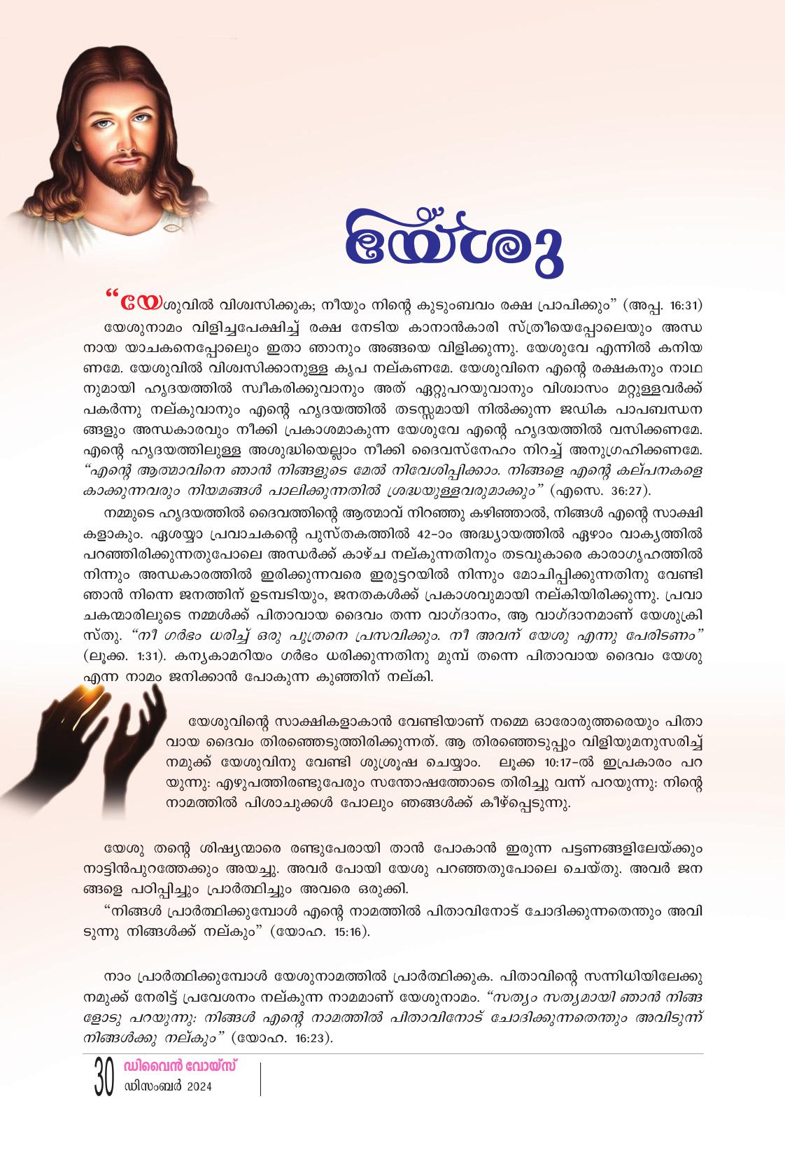 "യേശുവിൽ വിശ്വസിക്കുക; നീയും നിൻ്റെ കുടുംബവം രക്ഷ പ്രാപിക്കും" (അപ്പ. 16:31) യേശുനാമം വിളിച്ചപേക്ഷിച്ച് രക്ഷ നേടിയ കാനാൻകാരി സ്ത്രീയെപ്പോലെയും അന്ധ നായ യാചകനെപ്പോലും ഇതാ ഞാനും അങ്ങയെ വിളിക്കുന്നു. യേശുവേ എന്നിൽ കനിയ ണമേ, യേശുവിൽ വിശ്വസിക്കാനുള്ള കൃപ നല്കണമേ. യേശുവിനെ എൻ്റെ രക്ഷകനും നാഥ നുമായി ഹൃദയത്തിൽ സ്വീകരിക്കുവാനും അത് ഏറ്റുപറയുവാനും വിശ്വാസം മറ്റുള്ളവർക്ക് പകർന്നു നല്കുവാനും എൻ്റെ ഹ്യദയത്തിൽ തടസ്സമായി നിൽക്കുന്ന ജഡിക പാപബന്ധന ങ്ങളും അന്ധകാരവും നീക്കി പ്രകാശമാകുന്ന യേശുവേ എൻ്റെ ഹൃദയത്തിൽ വസിക്കണമേ. എന്റെ ഹൃദയത്തിലുള്ള അശുദ്ധിയെല്ലാം നീക്കി ദൈവസ്നേഹം നിറച്ച് അനുഗ്രഹിക്കണമേ. “എന്റെ ആത്മാവിനെ ഞാൻ നിങ്ങളുടെ മേൽ നിവേശിപ്പിക്കാം. നിങ്ങളെ എന്റെ കല്പനകളെ കാക്കുന്നവരും നിയമങ്ങൾ പാലിക്കുന്നതിൽ ശ്രദ്ധയുള്ളവരുമാക്കും" (എസെ. 36:27). നമ്മുടെ ഹൃദയത്തിൽ ദൈവത്തിൻ്റെ ആത്മാവ് നിറഞ്ഞു കഴിഞ്ഞാൽ, നിങ്ങൾ എൻ്റെ സാക്ഷി കളാകും. ഏശയ്യാ പ്രവാചകൻ്റെ പുസ്തകത്തിൽ 42-ാം അദ്ധ്യായത്തിൽ ഏഴാം വാക്യത്തിൽ പറഞ്ഞിരിക്കുന്നതുപോലെ അന്ധർക്ക് കാഴ്ച നല്കുന്നതിനും തടവുകാരെ കാരാഗൃഹത്തിൽ നിന്നും അന്ധകാരത്തിൽ ഇരിക്കുന്നവരെ ഇരുട്ടറയിൽ നിന്നും മോചിപ്പിക്കുന്നതിനു വേണ്ടി ഞാൻ നിന്നെ ജനത്തിന് ഉടമ്പടിയും, ജനതകൾക്ക് പ്രകാശവുമായി നല്കിയിരിക്കുന്നു. പ്രവാ ചകന്മാരിലൂടെ നമ്മൾക്ക് പിതാവായ ദൈവം തന്ന വാഗ്ദാനം, ആ വാഗ്ദാനമാണ് യേശുക്രി സ്തു. “നീ ഗർഭം ധരിച്ച് ഒരു പുത്രനെ പ്രസവിക്കും. നീ അവന് യേശു എന്നു പേരിടണം" (ലൂക്ക 1:31). കന്യകാമറിയം ഗർഭം ധരിക്കുന്നതിനു മുമ്പ് തന്നെ പിതാവായ ദൈവം യേശു എന്ന നാമം ജനിക്കാൻ പോകുന്ന കുഞ്ഞിന് നല്കി. യേശുവിന്റെ സാക്ഷികളാകാൻ വേണ്ടിയാണ് നമ്മെ ഓരോരുത്തരെയും പിതാ വായ ദൈവം തിരഞ്ഞെടുത്തിരിക്കുന്നത്. ആ തിരഞ്ഞെടുപ്പും വിളിയുമനുസരിച്ച് നമുക്ക് യേശുവിനു വേണ്ടി ശുശ്രൂഷ ചെയ്യാം. ലൂക്ക 10:17-ൽ ഇപ്രകാരം പറ യുന്നു. എഴുപത്തിരണ്ടുപേരും സന്തോഷത്തോടെ തിരിച്ചു വന്ന് പറയുന്നു: നിന്റെ നാമത്തിൽ പിശാചുക്കൾ പോലും ഞങ്ങൾക്ക് കീഴ്പ്പെടുന്നു.