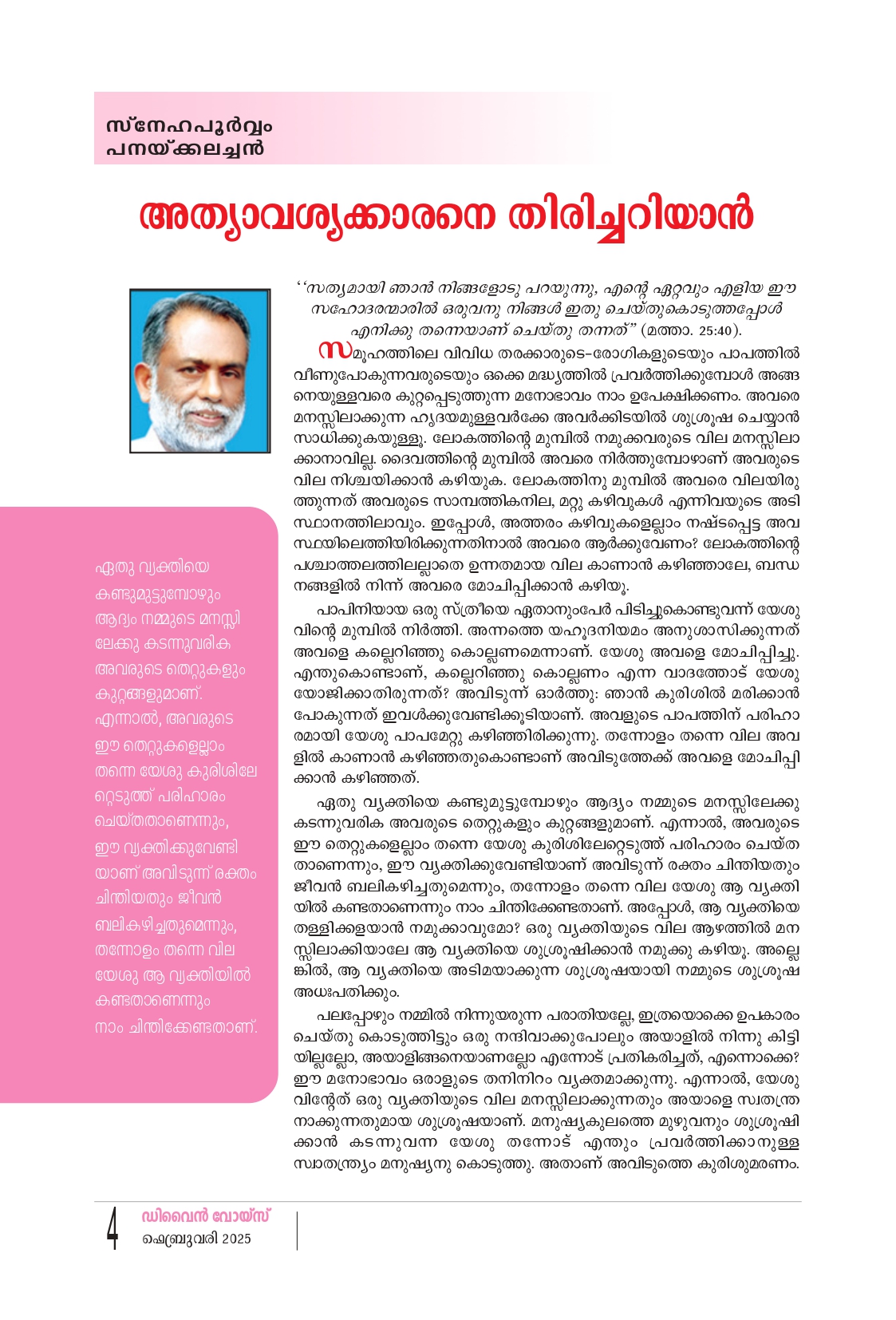"സത്യമായി ഞാൻ നിങ്ങളോടു പറയുന്നു. എൻ്റെ ഏറ്റവും എളിയ ഈ സഹോദരന്മാരിൽ ഒരുവനു നിങ്ങൾ ഇതു ചെയ്തുകൊടുത്തപ്പോൾ എനിക്കു തന്നെയാണ് ചെയ്തു തന്നത്" (മത്താ. 25:40) സമൂഹത്തിലെ വിവിധ തരക്കാരുടെ രോഗികളുടെയും പാപത്തിൽ വീണുപോകുന്നവരുടെയും ഒക്കെ മദ്ധ്യത്തിൽ പ്രവർത്തിക്കുമ്പോൾ അങ്ങ നെയുള്ളവരെ കുറ്റപ്പെടുത്തുന്ന മനോഭാവം നാം ഉപേക്ഷിക്കണം. അവരെ മനസ്സിലാക്കുന്ന ഹൃദയമുള്ളവർക്കേ അവർക്കിടയിൽ ശുശ്രൂഷ ചെയ്യാൻ സാധിക്കുകയുള്ളൂ. ലോകത്തിൻ്റെ മുമ്പിൽ നമുക്കവരുടെ വില മനസ്സിലാ ക്കാനാവില്ല. ദൈവത്തിൻ്റെ മുമ്പിൽ അവരെ നിർത്തുമ്പോഴാണ് അവരുടെ വില നിശ്ചയിക്കാൻ കഴിയുക. ലോകത്തിനു മുമ്പിൽ അവരെ വിലയിരു ത്തുന്നത് അവരുടെ സാമ്പത്തികനില, മറ്റു കഴിവുകൾ എന്നിവയുടെ അടി സ്ഥാനത്തിലാവും. ഇപ്പോൾ, അത്തരം കഴിവുകളെല്ലാം നഷ്ടപ്പെട്ട അവ സ്ഥയിലെത്തിയിരിക്കുന്നതിനാൽ അവരെ ആർക്കുവേണം? ലോകത്തിന്റെ പശ്ചാത്തലത്തിലല്ലാതെ ഉന്നതമായ വില കാണാൻ കഴിഞ്ഞാലേ, ബന്ധ നങ്ങളിൽ നിന്ന് അവരെ മോചിപ്പിക്കാൻ കഴിയൂ