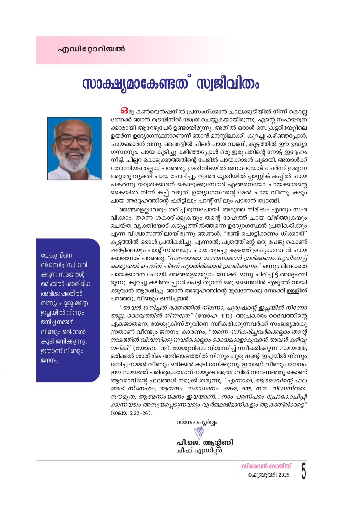ഒരു കൺവെൻഷനിൽ പ്രസംഗിക്കാൻ ചാലക്കുടിയിൽ നിന്ന് കൊല്ല ത്തേക്ക് ഞാൻ ട്രെയിനിൽ യാത്ര ചെയ്യുകയായിരുന്നു. എന്റെ സഹയാത്ര ക്കാരായി ആറേഴുപേർ ഉണ്ടായിരുന്നു. അതിൽ ഒരാൾ സെക്രട്ടറിയേറ്റിലെ ഉയർന്ന ഉദ്യോഗസ്ഥനാണെന്ന് ഞാൻ മനസ്സിലാക്കി. കുറച്ചു കഴിഞ്ഞപ്പോൾ, ചായക്കാരൻ വന്നു. ഞങ്ങളിൽ ചിലർ ചായ വാങ്ങി, കൂട്ടത്തിൽ ഈ ഉദ്യോ ഗസ്ഥനും. ചായ കുടിച്ചു കഴിഞ്ഞപ്പോൾ ഒരു ഇരുപതിൻ് നോട്ട് ഇദ്ദേഹം നീട്ടി ചില്ലറ കൊടുക്കാത്തതിൻ്റെ പേരിൽ ചായക്കാരൻ ചൂടായി. അയാൾക്ക് തോന്നിയതെല്ലാം പറഞ്ഞു. ഇതിനിടയിൽ ജനാലയോട് ചേർന്ന് ഇരുന്ന മറ്റൊരു വ്യക്തി ചായ ചോദിച്ചു. വളരെ ധൃതിയിൽ പ്ലാസ്റ്റിക് കപ്പിൽ ചായ പകർന്നു യാത്രക്കാരന് കൊടുക്കുമ്പോൾ എങ്ങനെയോ ചായക്കാരന്റെ കൈയിൽ നിന്ന് കപ്പ് വഴുതി ഉദ്യോഗസ്ഥന്റെ മേൽ ചായ വീണു. കടും ചായ അദ്ദേഹത്തിൻ്റെ ഷർട്ടിലും പാൻ്റ് സിലും പടരാൻ തുടങ്ങി